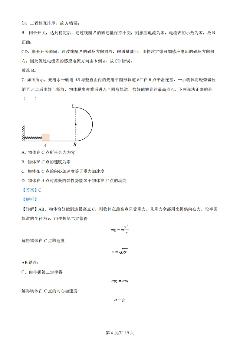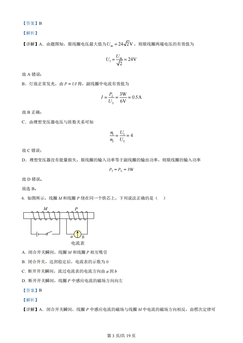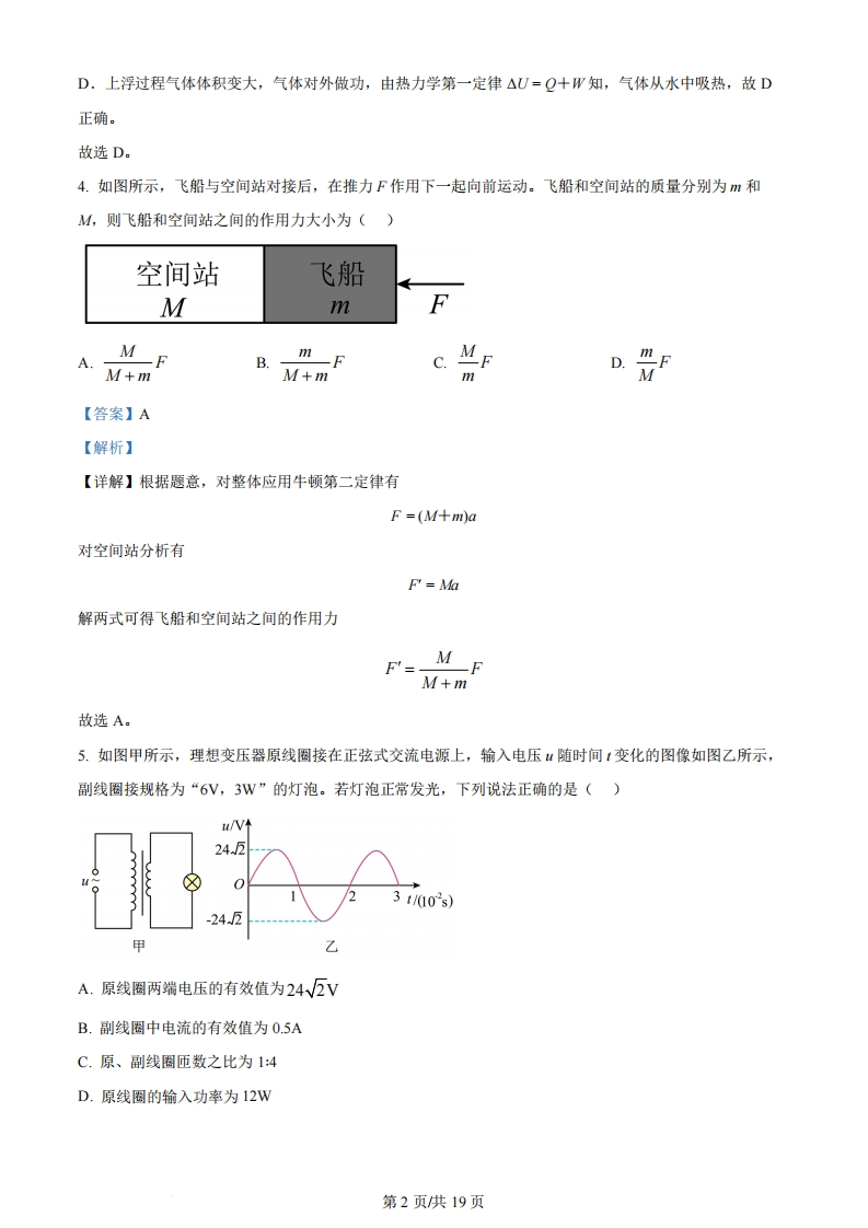 2024年普通高中学业水平等级性考试(北京卷)物理本试卷分第一部分和第二部分。满分100分,考试时间90分钟。第一部分本部分共14小题,每小题3分,共42分。在每小题列出的四个选项中,选出最符合题目要求的一项。1.己知钍234的半衰期是24天。1g钍234经过48天后,剩余钍234的质量为()A.0gB.025gC.0.5gD.0.75g【答案】B【解析】【详解】半衰期1g钍234经过48天后,剩余质量1m=()Fm=0.25g故选B。2.一辆汽车以10m/s的速度匀速行驶,制动后做匀减速直线运动,经2s停止,汽车的制动距离为()A.5mB.10mC.20mD.30m【答案】B【解析】【详解】速度公式汽车做末速度为零的匀减速直线运动,则有x='6+y1=10m2故选B。3.一个气泡从恒温水槽的底部缓慢上浮,将气泡内的气体视为理想气体,且气体分子个数不变,外界大气压不变。在上浮过程中气泡内气体()A,内能变大B.压强变大C.体积不变D.从水中吸热【答案】D【解析】【详解】A.上浮过程气泡内气体的温度不变,内能不变,故A错误:B.气泡内气体压强p=P%十p水gh,故上浮过程气泡内气体的压强减小,故B错误:C.由玻意耳定律pV=C知,气体的体积变大,故C错误:第1页供19页D.上浮过程气体体积变大,气体对外做功,由热力学第一定律△U=Q十W知,气体从水中吸热,故D正确。故选D。4.如图所示,飞船与空间站对接后,在推力F作用下一起向前运动。飞船和空间站的质量分别为m和M,则飞船和空间站之间的作用力大小为()空间站飞船MmMA.MFB.m一FC.FM+mM+mD.m【答案】A【解析】【详解】根据题意,对整体应用牛顿第二定律有F =(M+m)a对空间站分析有F=Ma解两式可得飞船和空间站之间的作用力F=MFM+m故选A。5.如图甲所示,理想变压器原线圈接在正弦式交流电源上,输入电压“随时间1变化的图像如图乙所示,副线圈接规格为“6V,3W”的灯泡。若灯泡正常发光,下列说法正确的是()u/V242311002s)-24万甲A.原线圈两端电压的有效值为24√2VB.副线圈中电流的有效值为0.5AC.原、副线圈匝数之比为1:4D.原线圈的输入功率为12W第2页供19页【答案】B【解析】【详解】A.由题图知,原线圈电压最大值为Um=24√2V,则原线圈两端电压的有效值为U"=24V故A错误:B.灯泡正常发光,由P=UI得,副线圈中电流有效值为1=2=3wU,6V=05A故B正确:C.由理想变压器电压与匝数关系可知4=4=4n U2故C错误:D.理想变压器没有能量损失,原线圈的输入功率等于副线圈的输出功率,则原线圈的输入功率P1=PL=3W故D错误。故选B。6.如图所示,线圈M和线圈P绕在同一个铁芯上,下列说法正确的是()a①D电流表A.闭合开关瞬间,线圈M和线圈P相互吸引B.闭合开关,达到稳定后,电流表的示数为0C.断开开关瞬间,流过电流表的电流方向由a到bD.断开开关瞬间,线圈P中感应电流的磁场方向向左【答案】B【解析】【详解】A,闭合开关瞬间,线圈P中感应电流的磁场与线圈M中电流的磁场方向相反,由楞次定律可第3页供19页