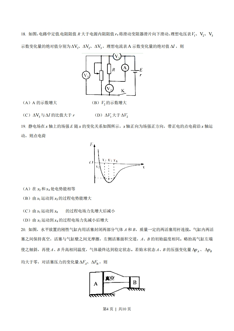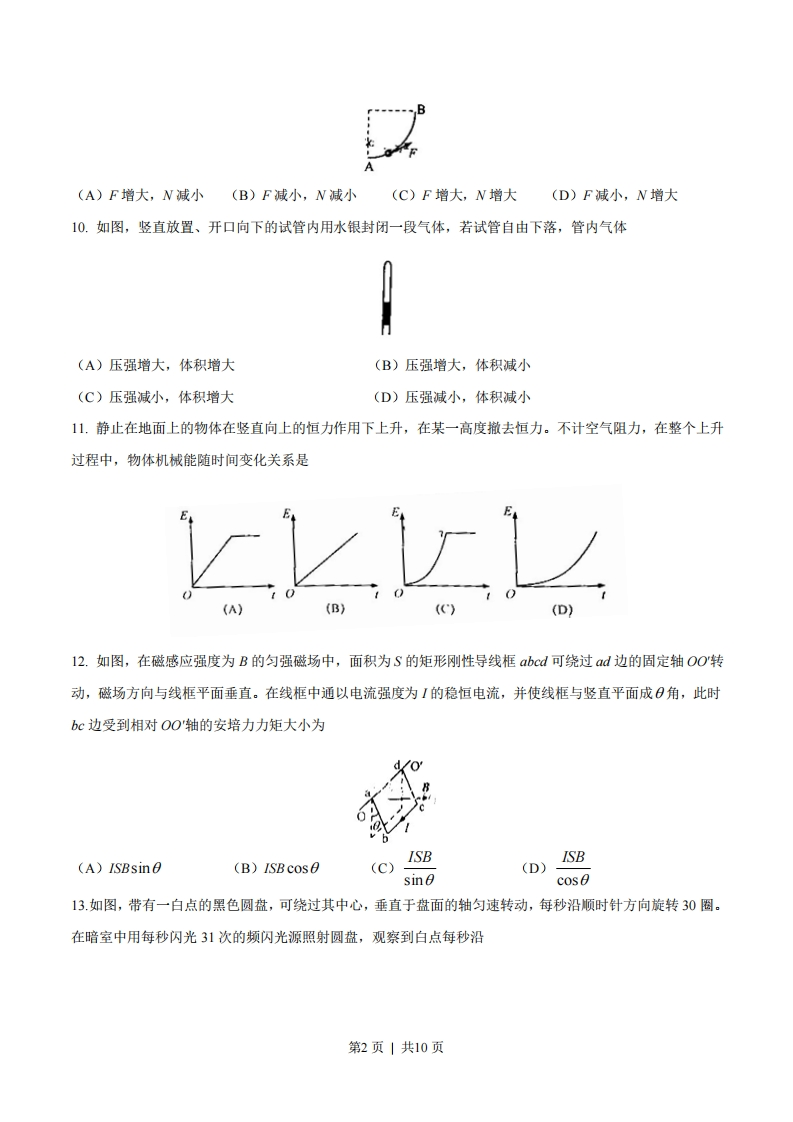 2014年高考(上海卷)物理试题一、单项选择题(共16分,每小题2分,每小题只有一个正确选项。)1.下列电磁波中,波长最长的是(A)无线电波(B)红外线(C)紫外线(D)y射线2.核反应方程式9Be+He→2C+X中的X表示(A)质子(B)电子(C)光子(D)中子3.不能用卢瑟福原子核式结构模型得出的结论是(A)原子中心有一个很小的原子核(B)原子核是由质子和中子组成的(C)原子质量几乎全部集中在原子核内(D)原子的正电荷全部集中在原子核内4.分子间同时存在着引力和斥力,当分子间距增加时,分子间的(A)引力增加,斥力减小(B)引力增加,斥力增加(C)引力减小,斥力减小(D)引力减小,斥力增加5.链式反应中,重核裂变时放出的可以使裂变不断进行下去的粒子是(A)质子(B)中子(C)B粒子(D)a粒子6.在光电效应的实验结果中,与光的波动理论不矛盾的是(A)光电效应是瞬时发生的(B)所有金属都存在极限频率(C)光电流随着入射光增强而变大(D)入射光频率越大,光电子最大初动能越大7.质点做简谐运动,其x一1关系如图,以x轴正向为速度v的正方向,该质点的一4关系是hsloA.i8.在离地高h处,沿竖直方向同时向上和向下抛出两个小球,她们的初速度大小均为,不计空气阻力,两球落地的时间差为(A)2(B)(C)2h(D)h8二、单项选择题(共24分,每小题3分。每小题只有一个正确选项。)9.如图,光滑的四分之一圆弧轨道A,B固定在竖直平面内,A端与水平面相切,穿在轨道上的小球在拉力F的作用下,缓慢地由A向B运动,F始终沿轨道的切线方向,轨道对球的弹力为N。在运动过程中第1页|共10页B(A)F增大,N减小(B)F减小,N减小(C)F增大,N增大(D)F减小,N增大10.如图,竖直放置、开口向下的试管内用水银封闭一段气体,若试管自由下落,管内气体(A)压强增大,体积增大(B)压强增大,体积减小(C)压强减小,体积增大(D)压强减小,体积减小11.静止在地面上的物体在竖直向上的恒力作用下上升,在某一高度撤去恒力。不计空气阻力,在整个上升过程中,物体机械能随时间变化关系是(D12.如图,在磁感应强度为B的匀强磁场中,面积为S的矩形刚性导线框abcd可绕过ad边的固定轴OO转动,磁场方向与线框平面垂直。在线框中通以电流强度为I的稳恒电流,并使线框与竖直平面成日角,此时bc边受到相对OO轴的安培力力矩大小为ISBISB(A)ISBsin(B)ISBcos0(C)(D)sinAcos013.如图,带有一白点的黑色圆盘,可绕过其中心,垂直于盘面的轴匀速转动,每秒沿顺时针方向旋转30圈。在暗室中用每秒闪光31次的频闪光源照射圆盘,观察到白点每秒沿第2页|共10页(A)顺时针旋转31圈(B)逆时针旋转31圈(C)顺时针旋转1圈(D)逆时针旋转1圈14.一系列横波沿水平放置的弹性绳向右传播,绳上两质点A、B的平衡位置相距34波长,B位于A右方。1时刻A位于平衡位置上方且向上运动,再经过1/4周期,B位于平衡位置(A)上方且向上运动(B)上方且向下运动(C)下方且向上运动(D)上方且向下运动15.将阻值随温度升高而减小的热敏电阻和Ⅱ串联,接在不计内阻的稳压电源两端。开始时I和Ⅱ阻值相等,保持温度不变,冷却或加热Ⅱ,则Ⅲ的电功率在(A)加热时变大,冷却时变小(B)加热时变小,冷却时变大(C)加热或冷却时都变小(D)加热或冷却时都变大16.如图所示,竖直平面内的轨道1和Ⅱ都由两段细直杆连接而成,两轨道长度相等。用相同的水平恒力将穿在轨道最低点的B静止小球,分别沿I和I推至最高点A,所需时间分别为1、2:动能增量分别为△E1、△E2。假定球在经过轨道转折点前后速度的大小不变,且球与I、Ⅲ轨道间的动摩擦因数相等,则(A)△Ek1>△E2:1>2(B)△E1=△E2:1>2(C)△E1>△E2:t1<2(D)△E1=△E2:1<2三。多项选择题(共16分,每小题4分。每小题有二个或三个正确选项。全选对的,得4分:选对但不全的,得2分;有选错或不答的,得0分。)17.如图,匀强磁场垂直于软导线回路平面,由于磁场发生变化,回路变为圆形。则磁场(A)逐渐增强,方向向外(B)逐渐增强,方向向里(C)逐渐减弱,方向向外(D)逐渐减弱,方向向里第3页|共10页