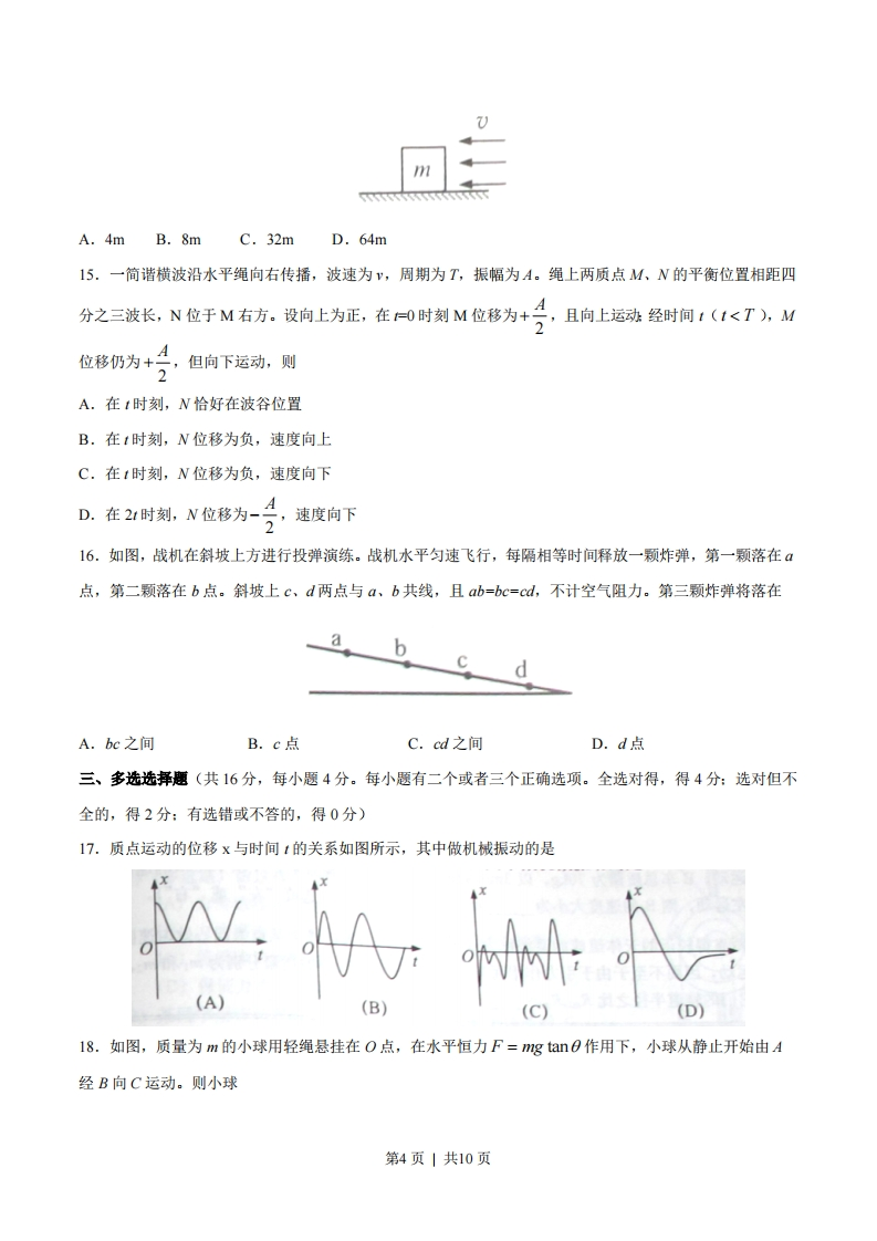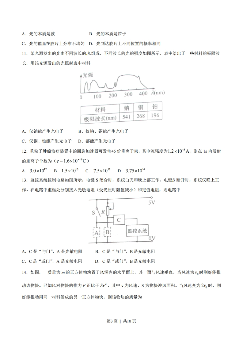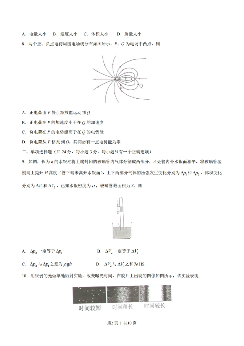 2015年高考(上海卷)物理试题一、单项选择题(共16分,每小题2分,每小题只有一个正确选项)1.X射线A.不是电磁波B.具有反射和折射的特性C.只能在介质中传播D.不能发生干涉和衍射2.如图,P为桥墩,A为靠近桥墩浮出水面的叶片,波源S连续振动,形成水波,此时叶片A静止不动。为使水波能带动叶片振动,可用的方法是A.提高波源频率B.降低波源频率C,增加波源距桥墩的距离D.减小波源距桥墩的距离3.如图,鸟沿虚线斜向上加速飞行,空气对其作用力可能是A.FB.EC.FD.F4.一定质量的理想气体在升温过程中A.分子平均势能减小B.每个分子速率都增大C.分子平均动能增大C.分子间作用力先增大后减小5.铀核可以发生衰变和裂变,铀核的A.衰变和裂变都能自发发生B.衰变和裂变都不能自发发生C.衰变能自发发生而裂变不能自发发生D.衰变不能自发发生而裂变能自发发生6.Th经过一系列a衰变和B衰变后变成Pb,则9Pb比82Th少A.16个中子,8个质子B.8个中子,16个质子C.24个中子,8个质子D.8个中子,24个质子7.在:粒子散射实验中,电子对粒子运动的影响可以忽略,这是因为与α粒子相比,电子第1页|共10页A.电量太小B.速度太小C.体积太小D.质量太小8.两个正、负点电荷周围电场线分布如图所示,P、Q为电场中两点,则A.正电荷由P静止释放能运动到QB.正电荷在P的加速度小于在Q的加速度C.负电荷在P的电势能高于在Q的电势能D.负电荷从P移动到Q,其间必有一点电势能为零二、单项选择题(共24分,每小题3分,每小题只有一个正确选项)9.如图,长为h的水银柱将上端封闭的玻璃管内气体分割成两部分,A处管内外水银面相平。将玻璃管缓慢向上提升H高度(管下端未离开水银面),上下两部分气体的压强发生变化分别为△p,和△p,,体积变化分别为△V和△V。己知水银密度为p,玻璃管截面积为S,则A.△p2一定等于△p1B.△V2一定等于△C.△p2与△之差为PghD.△V与△V之和为HS10.用很弱的光做单缝衍射实验,改变曝光时间,在胶片上出现的图像如图所示,该实验表明.时间较短时间稍长时间较长第2页|共10页A.光的本质是波B.光的本质是粒子C.光的能量在胶片上分布不均匀D.光到达胶片上不同位置的概率相同11.某光源发出的光由不同波长的光组成,不同波长的光的强度如图所示,表中给出了一些材料的极限波长,用该光源发出的光照射表中材料4光强1002003004002(nm0材料钠铜铂极限波长(nm)541268196A.仅钠能产生光电子B,仅钠、铜能产生光电子C.仅铜、铂能产生光电子D.都能产生光电子12.重粒子肿瘤治疗装置中的回旋加速器可发生+5价重离子束,其电流强度为1.2×10-5A,则在1s内发射的重离子个数为(e=1.6×10-9C)A.3.0×102B.1.5×105C.7.5×105D.3.75×10413.监控系统控制电路如图所示,电键S闭合时,系统白天和晚上都工作,电键S断开时,系统仅晚上工作。在电路中虚框处分别接入光敏电阻(受光照时阻值减小)和定值电阻,则电路中5V监控系统A.C是“与门”,A是光敏电阻B.C是“与门”,B是光敏电阻C.C是“或门”,A是光敏电阻D.C是“或门”,B是光敏电阻14.如图,一质量为m的正方体物块置于风洞内的水平面上,其一面与风速垂直,当风速为。时刚好能推动该物块。己知风对物块的推力F正比于S2,其中v为风速、S为物块迎风面积。当风速变为2,时,刚好能推动用同一材料做成的另一正方体物块,则该物块的质量为第3页|共10页