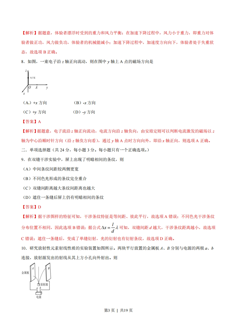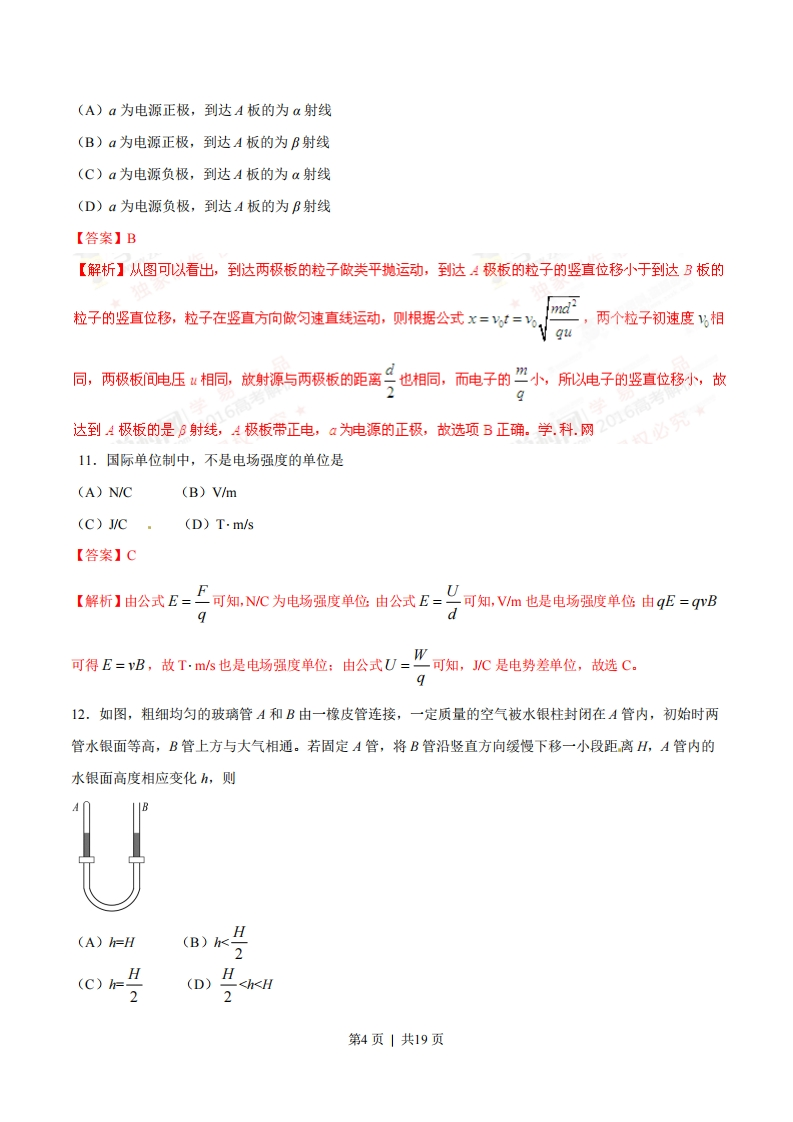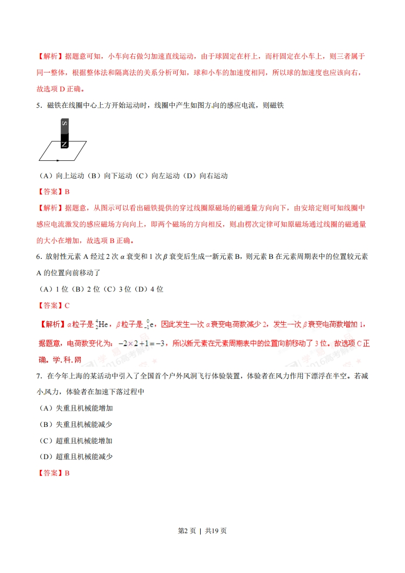 绝密★启封并使用完毕前2016年高考上海卷物理试题(正式版)一,单项选择题(共16分,每小题2分。每小题只有一个正确选项。)1.卢瑟福通过对α粒子散射实验结果的分析,提出了原子内部存在(A)电子(B)中子(C)质子(D)原子核【答案】D【解析】卢瑟福在《粒子散射实验中观察到绝大多数α粒子穿过金箔后几乎不改变运动方向,只有极少数的α粒子发生了大角度的偏转,说明在原子的中央存在一个体积很小的带正电的物质,将其称为原子核。故选项D正确。2.一束单色光由空气进入水中,则该光在空气和水中传播时(A)速度相同,波长相同(B)速度不同,波长相同(C)速度相同,频率相同(D)速度不同,频率相同【答案】D【解析】不同的单色光频率不相同,同一单色光在不同的介质内传播过程中,光的频率不会发生改变:由公式v=二可以判断,水的折射率大于空气的,所以该单色光进入水中后传播速度减小。故选项D正确。3.各种不同频率范围的电磁波按频率由大到小的排列顺序是(A)y射线、紫外线、可见光、红外线(B)y射线、红外线、紫外线、可见光(C)紫外线、可见光、红外线、y射线(D)红外线、可见光、紫外线、"射线【答案】A【解析】在电磁波谱中,各电磁波按照频率从小到大的排列顺序是无线电波、红外线、可见光、紫外线、射线、y射线,所以选项A正确。4.如图,顶端固定着小球的直杆固定在小车上,当小车向右做匀加速运动时,球所受合外力的方向沿图中的B(A)OA方向(B)OB方向(C)OC方向(D)OD方向【答案】D第1页1共19页【解析】据题意可知,小车向右做匀加速直线运动,由于球固定在杆上,而杆固定在小车上,则三者属于同一整体,根据整体法和隔离法的关系分析可知,球和小车的加速度相同,所以球的加速度也应该向右,故选项D正确。5.磁铁在线圈中心上方开始运动时,线圈中产生如图方向的感应电流,则磁铁(A)向上运动(B)向下运动(C)向左运动(D)向右运动【答案】B【解析】据题意,从图示可以看出磁铁提供的穿过线圈原磁场的磁通量方向向下,由安培定则可知线圈中感应电流激发的感应磁场方向向上,即两个磁场的方向相反,则由楞次定律可知原磁场通过线圈的磁通量的大小在增加,故选项B正确。6.放射性元素A经过2次α衰变和1次B衰变后生成一新元素B,则元素B在元素周期表中的位置较元素A的位置向前移动了(A)1位(B)2位(C)3位(D)4位【答案】C【解析】a粒子是He,B粒子是e,因此发生一次a衰变电荷数减少2,发生一次B衰变电荷数增加1,据题意,电荷数变化为:-2×2+1=-3,所以新元素在元素周期表中的位置向前移动了3位。故选项C正确。学科.网7.在今年上海的某活动中引入了全国首个户外风洞飞行体验装置,体验者在风力作用下漂浮在半空。若减小风力,体验者在加速下落过程中(A)失重且机械能增加(B)失重且机械能减少(C)超重且机械能增加(D)超重且机械能减少【答案】B第2页1共19页【解析】据题意,体验者漂浮时受到的重力和风力平衡:在加速下降过程中,风力小于重力,即重力对体验者做正功,风力做负功,体验者的机械能减小:加速下降过程中,加速度方向向下,体验者处于失重状态,故选项B正确。8.如图,一束电子沿:轴正向流动,则在图中y轴上A点的磁场方向是0(A)+x方向(B)x方向(C)y方向(D)y方向【答案】A【解析】据题意,电子流沿:轴正向流动,电流方向沿:轴负向,由安培定则可以判断电流激发的磁场以:轴为中心沿顺时针方向(沿:轴负方向看),通过y轴A点时方向向外,即沿x轴正向,则选项A正确。二.单项选择题(共24分,每小题3分。每小题只有一个正确选项。)9.在双缝干涉实验中,屏上出现了明暗相间的条纹,则(A)中间条纹间距较两侧更宽(B)不同色光形成的条纹完全重合(C)双缝间距离越大条纹间距离也越大(D)遮住一条缝后屏上仍有明暗相间的条纹【答案】D【解析】据干涉图样的特征可知,干涉条纹特征是等间距、彼此平行,故选项A错误:不同色光干涉条纹分布位置不相同,因此选项B错误:据公式△x=入可知,双缝间距d越大,干涉条纹距离越小,故选项dC错误:遮住一条缝后,变成了单缝衍射,光的衍射也有衍射条纹,故选项D正确。10.研究放射性元素射线性质的实验装置如图所示。两块平行放置的金属板A、B分别与电源的两极、b连接,放射源发出的射线从其上方小孔向外射出。则金属板放射源电源第3页1共19页