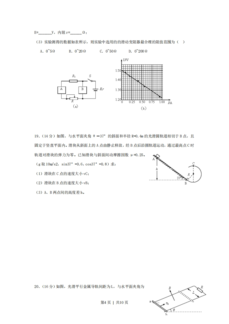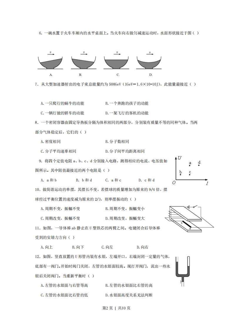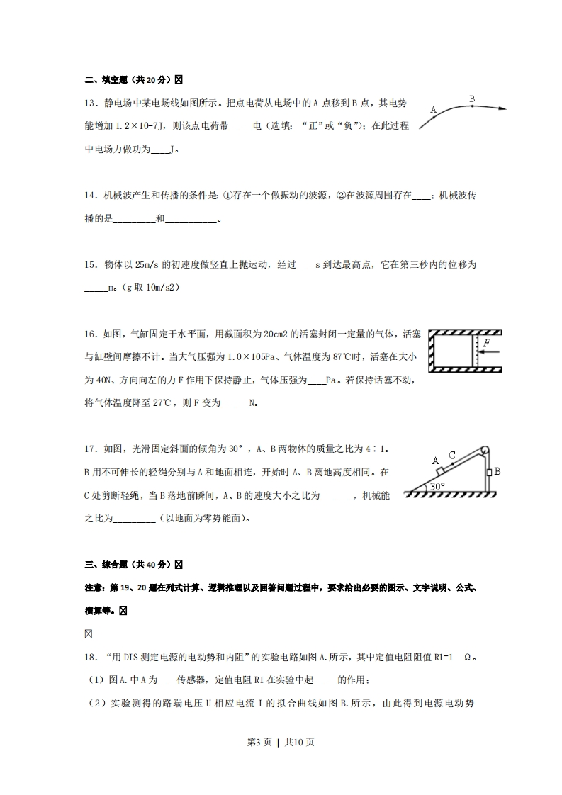 2017年上海市普通高中学业水平等级性考试-物理试卷考生注意:1.试卷满分100分,考试时间60分钟。2.本考试分设试卷和答题纸。试卷包括三部分,第一部分为选择题,第二部分为填空题,第三部分为综台题。3.答题前,务必在答题纸上填写姓名、报名号、考场号和座位号,并将核对后的条形码贴在指定位置上。作答必须涂或写在答题纸上,在试卷上作答一律不得分。第一部分的作答必须涂在答题纸上相应的区域,第二、三部分的作答必须写在答题纸上与试卷题号对应的位置。一、选择愿(共40分。第1-8小愿,每小愿3分,第9-12小题,每小愿4分。每小惠只有一个正确答案.)☒1.由放射性元素放出的氦核流被称为()A.阴极射线B.a射线C.B射线D.Y射线2.光子的能量与其()A.频率成正比B.波长成正比C速度成正比D.速度平方成正比3.在同位素氢、氘,氚的核内具有相同的()A.核子数B.电子数C.中子数D.质子数4.用单色光照射位于竖直平面内的肥皂液薄膜,所观察到的干涉条纹为()AB5.如图,在匀强电场中,悬线一端固定于地面,另一端拉住一个带电小球,使之处于静止状态。忽略空气阻力,当悬线断裂后,小球将做()A.曲线运动B.匀速直线运动777777777777C.匀加速直线运动D.变加速直线运动第1页|共10页6.一碗水置于火车车厢内的水平桌面上。当火车向右做匀减速运动时,水面形状接近于图()AD7.从大型加速器射出的电子束总能量约为500GeV(1GeV=1.6×10-10J),此能量最接近()A.一只爬行的蜗牛的动能B.一个奔跑的孩子的动能C.一辆行驶的轿车的动能D.一架飞行的客机的动能8.一个密闭容器由固定导热板分隔为体积相同的两部分,分别装有质量不等的同种气体。当两部分气体稳定后,它们的()A.密度相同B.分子数相同C.分子平均速率相同D.分子间平均距离相同49.将四个定值电阻a、b、c、d分别接入电路,测得相应的电流、电压值如图所示。其中阻值最接近的两个电阻是()A.a和bB.b和dC.a和cD.c和d10.做简谐运动的单摆,其摆长不变,若摆球的质量增加为原来的9/4倍,摆球经过平衡位置的速度减为原来的2/3,则单摆振动的()A.周期不变,振幅不变B.周期不变,振幅变小C.周期改变,振幅不变D.周期改变,振幅变大11.如图,一导体棒b静止在U型铁芯的两臂之间。电键闭合后导体棒受到的安培力方向()A.向上B.向下C.向左D.向右12.如图,竖直放置的U形管内装有水银,左端开口,右端封闭一定量的气体,底部有一阀门。开始时阀门关闭,左管的水银面较高。现打开阀门,流出一些水银后关闭阀门。当重新平衡时()A.左管的水银面与右管等高B.左管的水银面比右管的高C.左管的水银面比右管的低D.水银面高度关系无法判断第2页|共10页二、填空题(共20分)☒13.静电场中某电场线如图所示。把点电荷从电场中的A点移到B点,其电势B能增加1.2×10-7J,则该点电荷带_电(选填:“正”或“负"”):在此过程中电场力做功为J。14.机械波产生和传播的条件是①存在一个做振动的波源,②在波源周围存在_一:机械波传播的是」和15.物体以25m/s的初速度做竖直上抛运动,经过s到达最高点,它在第三秒内的位移为m。(g取10m/s2)16.如图,气缸固定于水平面,用截面积为20cm2的活塞封闭一定量的气体,活塞与红壁间摩擦不计。当大气压强为1.0×105Pa、气体温度为87℃时,活塞在大小为4ON、方向向左的力F作用下保持静止,气体压强为__P。若保持话塞不动,将气体温度降至27℃,则F变为_N。17.如图,光滑固定斜面的倾角为30°,A、B两物体的质量之比为4:1。CB用不可伸长的轻绳分别与A和地面相连,开始时A、B离地高度相同。在B30°C处剪断轻绳,当B落地前瞬间,A、B的速度大小之比为,机械能27777之比为」(以地面为零势能面)。三、综合愿(共40分)☒注意:第19、20愿在列式计算、逻辑推理以及回答问惠过程中,要求给出必要的图示、文字说明、公式、演算等。☒☒18.“用DIS测定电源的电动势和内阻”的实验电路如图A.所示,其中定值电阻阻值R1=12。(1)图A.中A为_传感器,定值电阻R1在实验中起_的作用:(2)实验测得的路端电压U相应电流I的拟合曲线如图B.所示,由此得到电源电动势第3页|共10页