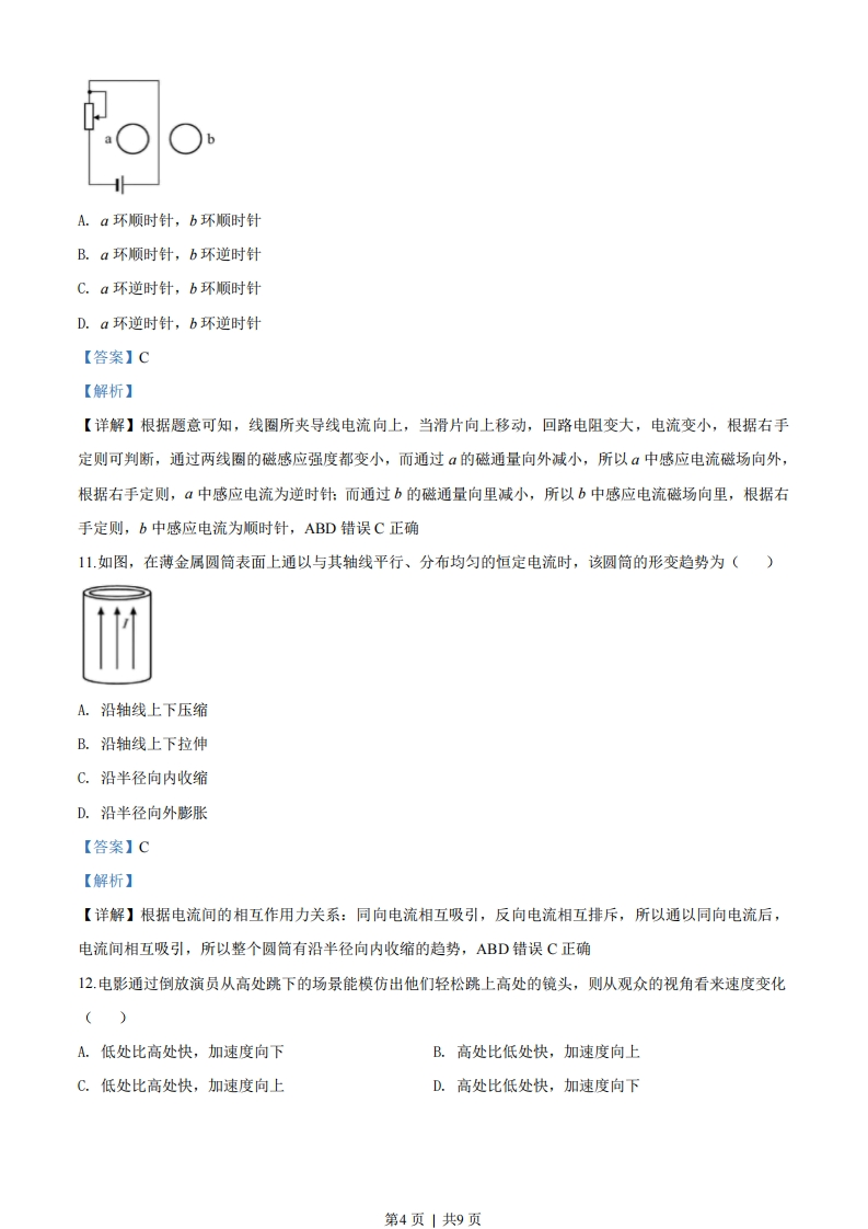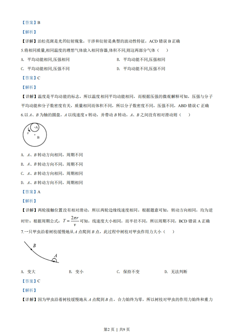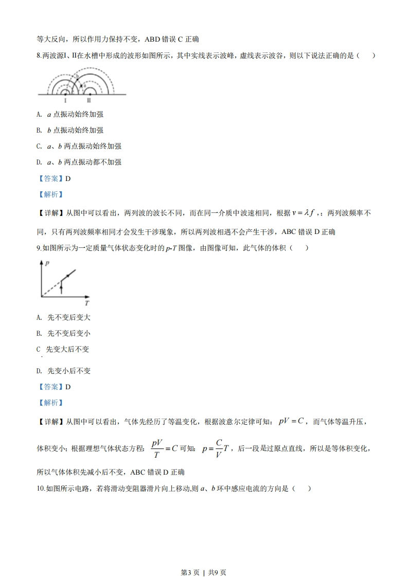 2019年上海市普通高中学业水平等级性考试物理试卷一、选择题1.以下运动中加速度保持不变的是()A.简谐振动B.匀速圆周运动C.竖直上抛运动D.加速直线运动【答案】C【解析】【详解】加速度不变即:所受合外力不变,竖直上抛运动过程中只受重力,加速度不变:简谐振动合外力与位移有关,不是恒定的:匀速圆周运动的合外力始终指向圆心,方向一直在变:加速直线运动,加速度不一定恒定:ABD错误C正确2.原子核内部有()A.质子B.a粒子C.电子D.光电子【答案】A【解析】【详解】根据原子核的内部结构可知,原子核是由质子和中子组成的,A正确BCD错误3.一个做简谐振动的弹簣振子,0时位于平衡位置,其机械能随时间变化的图像应为()【答案】D【解析】【详解】简谐振动的弹簣振子,只有弹簧弹力做功,系统动能和弹性势能相互转化,系统总的机械能不变,ABC错误D正确4.泊松亮斑是光的()A.干涉现象,说明光有波动性B.衍射现象,说明光有波动性C.干涉现象,说明光有粒子性D.衍射现象,说明光有粒子性第1页|共9页【答案】B【解析】【详解】泊松亮斑是光的衍射现象,干涉和衍射是典型的波动性特征,ACD错误B正确5.将相同质量,相同温度的理想气体放入相同容器,体积不同,则这两部分气体()A.平均动能相同,压强相同B.平均动能不同压强相同C.平均动能相同,压强不同D.平均动能不同,压强不同【答案】C【解析】【详解】温度是平均动能的标志,所以温度相同平均动能相同,而根据压强的微观解释可知,压强与分子平均动能和分子数密度有关,质量相同而体积不同,所以分子数密度不同,压强不同,ABD错误C正确6以A、B为轴的圆盘,A以线速度v转动,并带动B转动,A、B之间没有相对滑动则()A.A、B转动方向相同,周期不同B.A、B转动方向不同,周期不同C.A、B转动方向相同,周期相同D.A、B转动方向不同,周期相同【答案】A【解析】【详解】两轮接触位置没有相对滑动,所以两轮边缘线速度相同,根据题意可知,转动方向相同,均为逆时针:根据周期公式:T=2”可知,线速度大小相同,而半径不同,所以周期不同,BCD错误A正确7.一只甲虫沿着树枝缓慢地从A点爬到B点,此过程中树枝对甲虫作用力大小()BA.变大B.变小C.保持不变D.无法判断【答案】C【解析】【详解】因为甲虫沿着树枝缓慢地从A点爬到B点,合力始终为零,所以树枝对甲虫的作用力始终和重力第2页|共9页等大反向,所以作用力保持不变,ABD错误C正确8两波源I、Ⅱ在水槽中形成的波形如图所示,其中实线表示波峰,虚线表示波谷,则以下说法正确的是()A.a点振动始终加强B.b点振动始终加强C.a、b两点振动始终加强D.a、b两点振动都不加强【答案】D【解析】【详解】从图中可以看出,两列波的波长不同,而在同一介质中波速相同,根据ⅴ=入∫,:两列波频率不同,只有两列波频率相同才会发生干涉现象,所以两列波相遇不会产生干涉,ABC错误D正确9.如图所示为一定质量气体状态变化时的p-T图像,由图像可知,此气体的体积()A.先不变后变大B.先不变后变小C先变大后不变D.先变小后不变【答案】D【解析】【详解】从图中可以看出,气体先经历了等温变化,根据波意尔定律可知:pV=C,而气体等温升压,C体积变小:根据理想气体状态方程=C可知:p=T,后一段是过原点直线,所以是等体积变化,T所以气体体积先减小后不变,ABC错误D正确10.如图所示电路,若将滑动变阻器滑片向上移动,则α、b环中感应电流的方向是()第3页|共9页