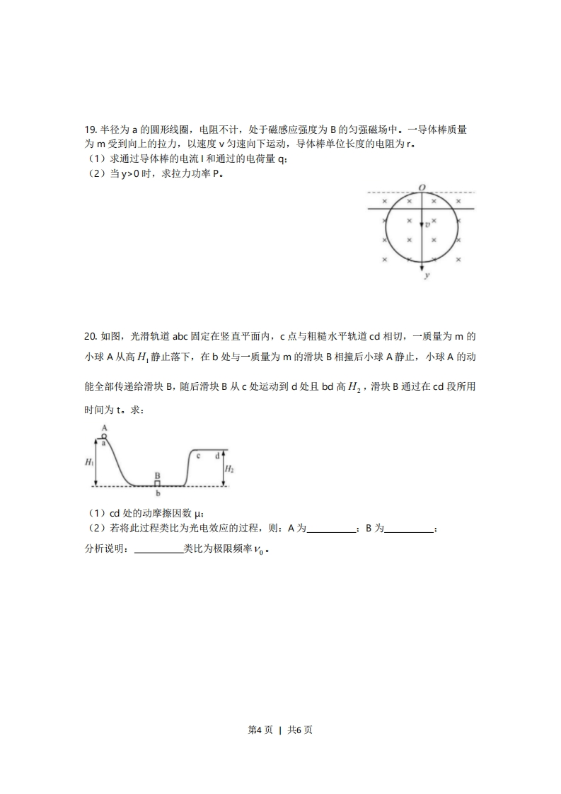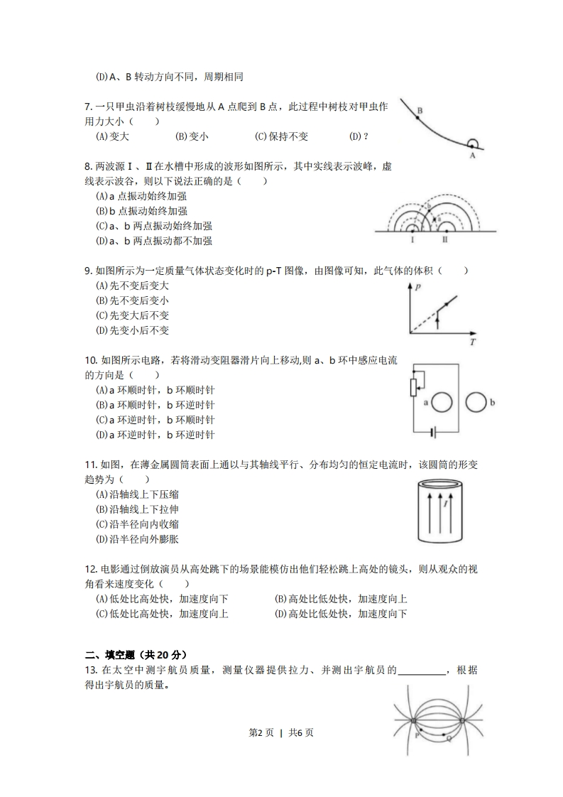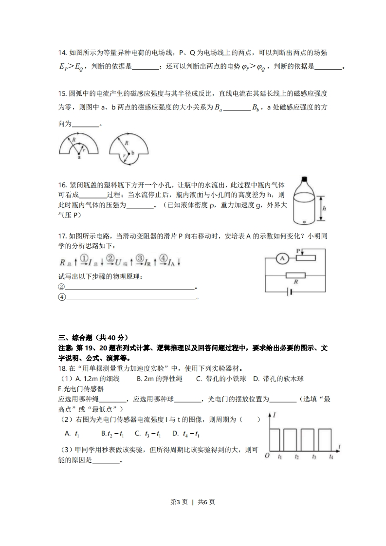 2019年上海市普通高中学业水平等级性考试物理试卷考生注意:1.试卷满分100分,考试时间60分钟。2.本考试分设试卷和答题纸。试卷包括三部分,第一部分为选择题,第二部分为填空题,第三部分为综台题。3。答题前,务必在答题纸上填写姓名、报名号、考场号和座位号,并将核对后的条形码贴在指定位置上。作答必须涂或写在答题纸上,在试卷上作答一律不得分。第一部分的作答必须涂在答题纸上相应的区域,第二、三部分的作答必须写在答题纸上与试卷题号对应的位量。一、选择题(共40分。第1-8小题,每小题3分,第9-12小题,每小题4分。每小题只有一个正确答案。)1.以下运动中加速度保持不变的是()(A)简谐振动(B)匀速圆周运动(C)竖直上抛运动(①)加速直线运动2.原子核内部有((A)质子(B)a粒子(C)电子(①)光电子3.一个做简谐振动的弹簣振子,t=0时位于平衡位置,其机械能随时间变化的图像应为()CA(B)(C】(D)4.泊松亮斑是光的()(A)干涉现象,说明光有波动性(B)衍射现象,说明光有波动性(C)干涉现象,说明光有粒子性(D)衍射现象,说明光有粒子性5.将相同质量,相同温度的理想气体放入相同容器,体积不同,则这两部分气体((A)平均动能相同,压强相同(B)平均动能不同,压强相同(C)平均动能相同,压强不同(①)平均动能不同,压强不同6.以A、B为轴的圆盘,A以线速度V转动,并带动B转动,A、B之间没有相对滑动则((A)A、B转动方向相同,周期不同(B)A、B转动方向不同,周期不同(C)A、B转动方向相同,周期相同第1页1共6页(D)A、B转动方向不同,周期相同7.一只甲虫沿着树枝缓慢地从A点爬到B点,此过程中树枝对甲虫作用力大小((A)变大(B)变小(C)保持不变(D)?8.两波源I、Ⅱ在水槽中形成的波形如图所示,其中实线表示波峰,虚线表示波谷,则以下说法正确的是()(A)a点振动始终加强(B)b点振动始终加强(C)a、b两点振动始终加强(D)a、b两点振动都不加强9.如图所示为一定质量气体状态变化时的p-T图像,由图像可知,此气体的体积((A)先不变后变大(B)先不变后变小(C)先变大后不变(D)先变小后不变10.如图所示电路,若将滑动变阻器滑片向上移动,则a、b环中感应电流的方向是()(A)a环顺时针,b环顺时针(B)a环顺时针,b环逆时针(C)a环逆时针,b环顺时针(D)a环逆时针,b环逆时针11.如图,在薄金属圆筒表面上通以与其轴线平行、分布均匀的恒定电流时,该圆筒的形变趋势为()(A)沿轴线上下压缩(B)沿轴线上下拉伸(C)沿半径向内收缩(D)沿半径向外膨胀12.电影通过倒放演员从高处跳下的场景能模仿出他们轻松跳上高处的镜头,则从观众的视角看来速度变化()(A)低处比高处快,加速度向下(B)高处比低处快,加速度向上(C)低处比高处快,加速度向上(D)高处比低处快,加速度向下二、填空题(共20分)13.在太空中测宇航员质量,测量仪器提供拉力、并测出宇航员的,根据得出宇航员的质量。第2页1共6页14.如图所示为等量异种电荷的电场线,P、Q为电场线上的两点,可以判断出两点的场强Ep>Eo,判断的依据是一:还可以判断出两点的电势pp>po,判断的依据是15.圆弧中的电流产生的磁感应强度与其半径成反比,直线电流在其延长线上的磁感应强度为零,则图中a、b两点的磁感应强度的大小关系为B,B。,a处磁感应强度的方向为16.紧闭瓶盖的塑料瓶下方开一个小孔,让瓶中的水流出,此过程中瓶内气体可看成过程:当水流停止后,瓶内液面与小孔间的高度差为h,则此时瓶内气体的压强为一。(己知液体密度P,重力加速度g,外界大气压P)17.如图所示电路,当滑动变阻器的滑片P向右移动时,安培表A的示数如何变化?小明同学的分析思路如下:Rat91a!②Uat图Rt9a试写出以下步骤的物理原理:②」④三、综合题(共40分)注意第19、20题在列式计算、逻辑推理以及回答问题过程中,要求给出必要的图示、文字说明、公式、演算等。18.在“用单摆测量重力加速度实验”中,使用下列实验器材。(1)A.1.2m的细线B.2m的弹性绳C.带孔的小铁球D.带孔的软木球E.光电门传感器应选用哪种绳应选用哪种球,光电门的摆放位置为(选填“最高点”或“最低点”)(2)右图为光电门传感器电流强度1与t的图像,则周期为(A.tB.t2-tC.4-41D.t4-t(3)甲同学用秒表做该实验,但所得周期比该实验得到的大,则可能的原因是」0 n第3页1共6页