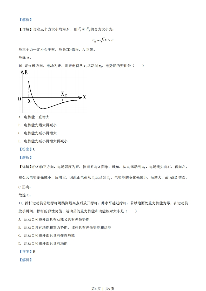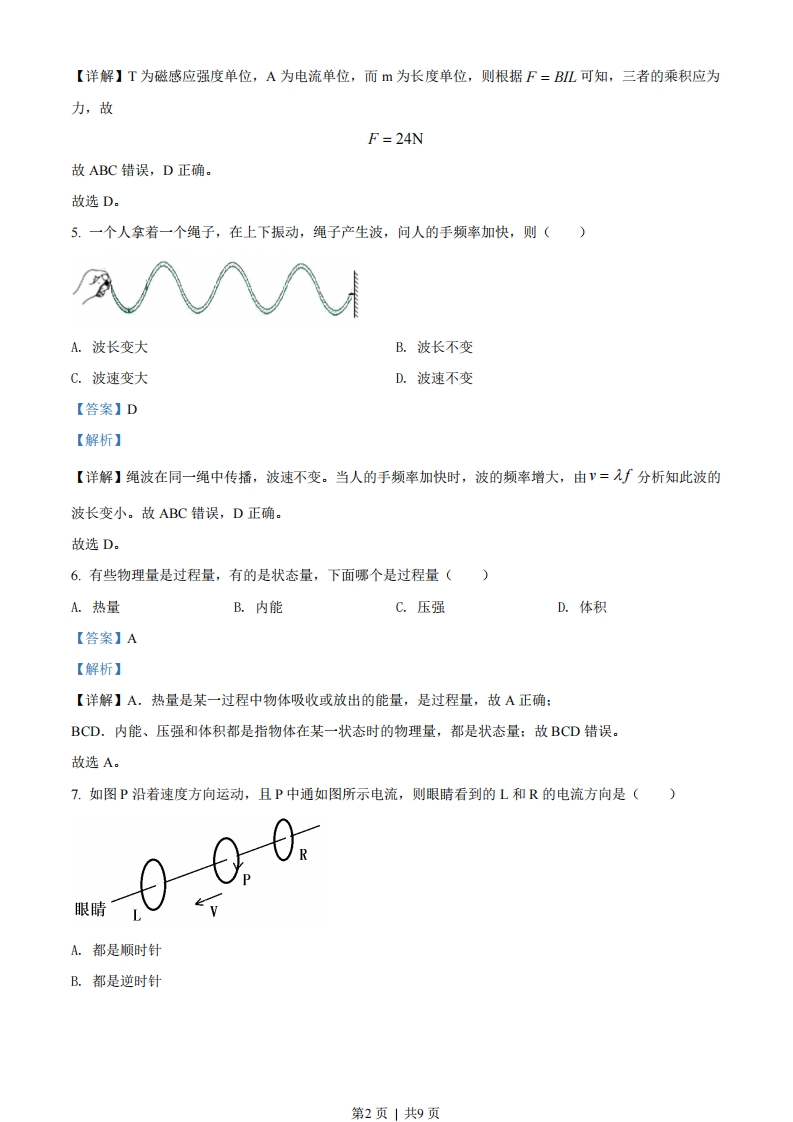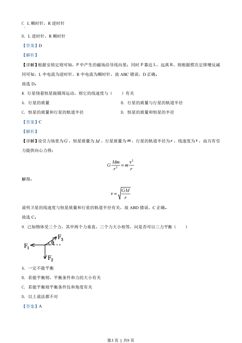 2018年上海市普通高中学业水平等级性考试物理试卷一、选释题1.a粒子是()A.原子核B.原子C.分子D.光子【答案】A【解析】【详解】α粒子是氨原子核A.原子核与分析相符,故A项正确:B.原子与分析不符,故B项错误:C.分子与分析不符,故C项错误:D.光子与分析不符,故D项错误。2.用来解释光电效应的科学家的理论是()A.爱因斯坦的光子说B.麦克斯韦电磁场理论C.牛顿的微粒说D.惠更斯的波动说【答案】A【解析】【详解】用来解释光电效应的科学家的理论是爱因斯坦的光子说,故BCD错误,A正确。故选A。3.查德威克用c粒子轰击铍核,核反应方程式是He+Be→X+C,其中X是A.质子B.中子C.电子D.正电子【答案】B【解析】【详解】根据质量数和电荷数守恒可知,x的质量数为4+9-12=1,电荷数为0,故x为中子,故B正确ACD错误.故选B.4.4(T)乘以2(A)乘以3(m)是()A.24WB.24JC.24VD.24N【答案】D【解析】【分析】第1页」共9页【详解】T为磁感应强度单位,A为电流单位,而为长度单位,则根据F=BL可知,三者的乘积应为力,故F=24N故ABC错误,D正确。故选D。5.一个人拿着一个绳子,在上下振动,绳子产生波,问人的手频率加快,则()A.波长变大B.波长不变C.波速变大D.波速不变【答案】D【解析】【详解】绳波在同一绳中传播,波速不变。当人的手频率加快时,波的频率增大,由ⅴ=入∫分析知此波的波长变小。故ABC错误,D正确。故选D。6.有些物理量是过程量,有的是状态量,下面哪个是过程量()A.热量B.内能C.压强D.体积【答案】A【解析】【详解】A,热量是某一过程中物体吸收或放出的能量,是过程量,故A正确:BCD.内能、压强和体积都是指物体在某一状态时的物理量,都是状态量:故BCD错误。故选A。7.如图P沿着速度方向运动,且P中通如图所示电流,则眼睛看到的L和R的电流方向是()眼晴A.都是顺时针B.都是逆时针第2页|共9页CL顺时针,R逆时针D.L逆时针,R顺时针【答案】D【解析】【详解】根据安培定则可知,P中产生的磁场沿导线向里:同时P靠近L,远离R,则根据楞次定律增反减同可知,L中电流为逆时针,R中电流为顺时针,故ABC错误,D正确。故选D。8.行星绕着恒星做圆周运动,则它的线速度与()有关A.行星的质量B.行星的质量与行星的轨道半径C.恒星的质量和行星的轨道半径D.恒星的质量和恒星的半径【答案】C【解析】【详解】设引力场里为G,恒星质量为M,行星质量为m,行星的轨道半径为”,线速度为v,由万有引力提供向心力得:Mm12G=m7解得:GM说明卫星的线速度与恒星质量和行星的轨道半径有关,故ABD错误,C正确。故选C。9.己知物体受三个力,其中两个力垂直,三个力大小相等,问是否可以三力平衡()F≤VF2A.一定不能平衡B.若能平衡则,平衡条件和力的大小有关C.若能平衡则平衡条件仅和角度有关D.以上说法都不对【答案】A第3页|共9页