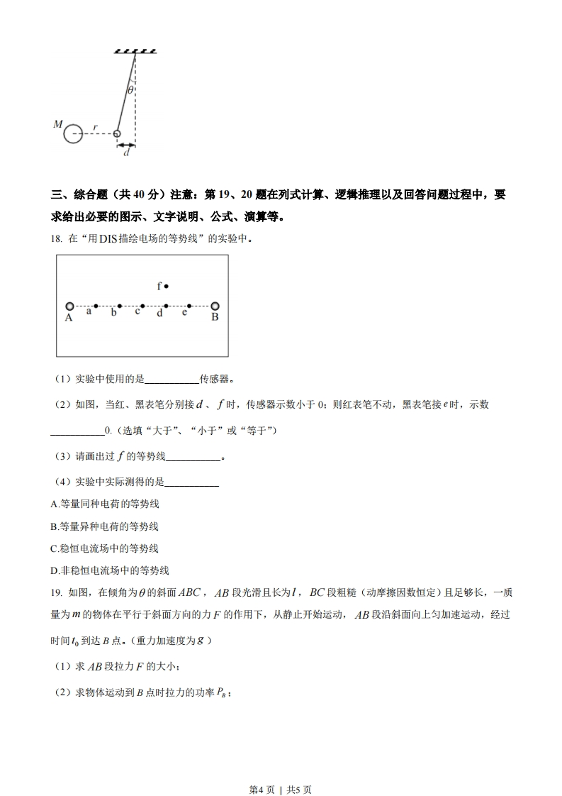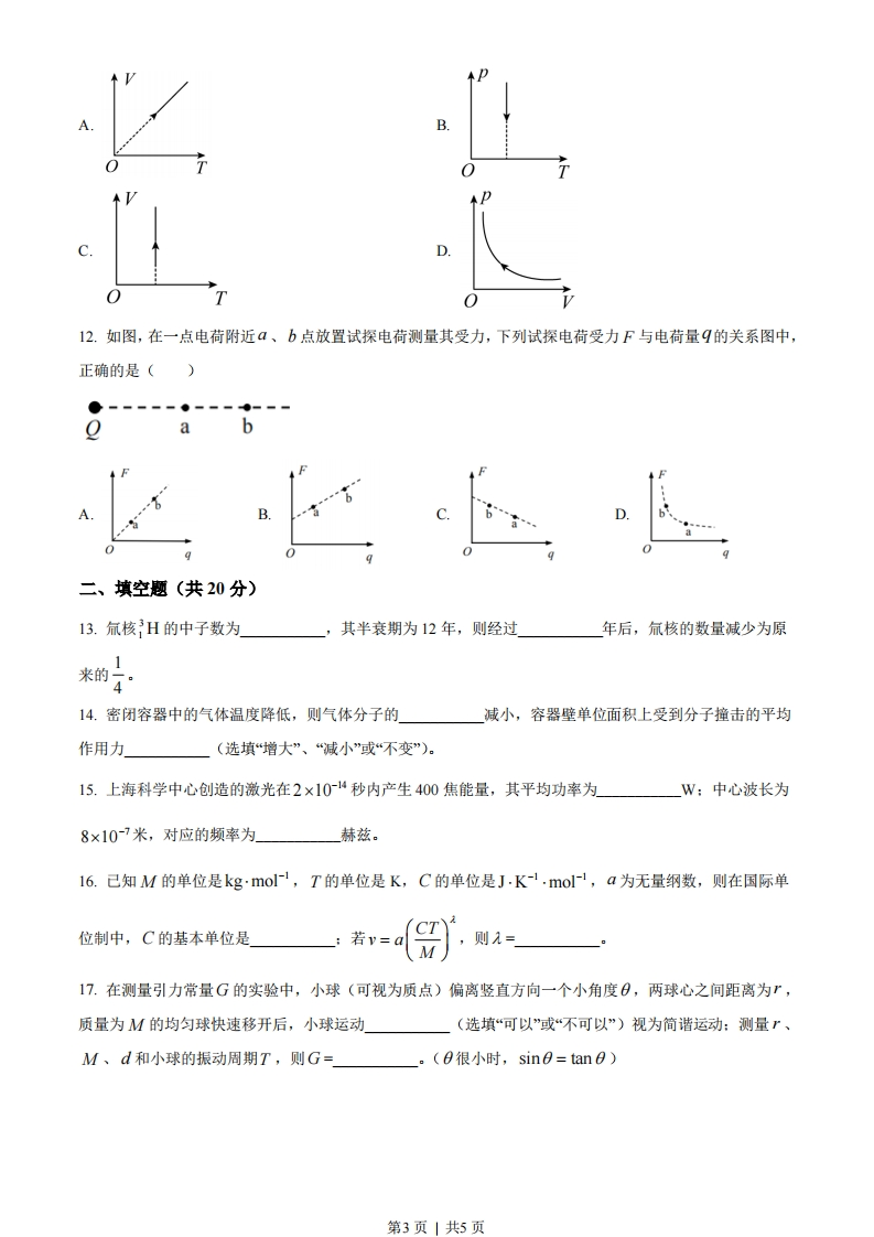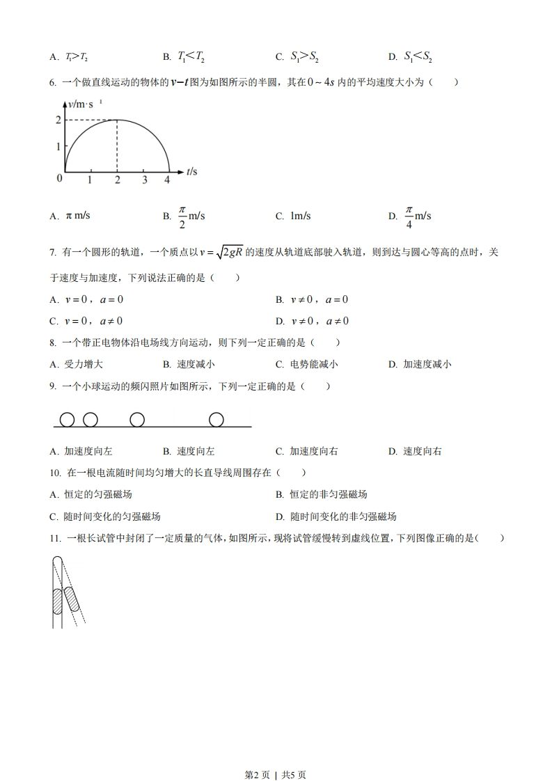 2021年上海市普通高中学业水平等级性考试物理一、选释题(共40分,第1-8小题,每小题3分;第9-12小题,每小题4分。每小题只有一个正确答案)1.B粒子来源于()A.原子核外电子B.原子核内中子转化而来C.原子核内电子D.原子核内质子转化而来2.:粒子散射实验中,有部分大角度偏转的α粒子,说明了()A.由于原子中的电子碰撞造成的B.受到金原子核库仑引力C.原子核由质子和中子组成D.原子中有带正电的原子核3.中心波源O的振动频率逐渐增大时,可能的波形图为()子AAAA4.“天问一号”计划在火星表面悬停以寻找最佳着陆点,其在空中水平匀速直线移动(不考虑空气阻力),喷气方向为()A.竖直向上B.斜向上C.竖直向下D.斜向下5.如图为气体速率分布图,纵坐标表示该速率的分子占总分子数的百分比,T图线下的面积为S,,T,图线下的面积为S2,下列说法正确的是()分子数4百分率速率第1页」共5页A.T>TB.T