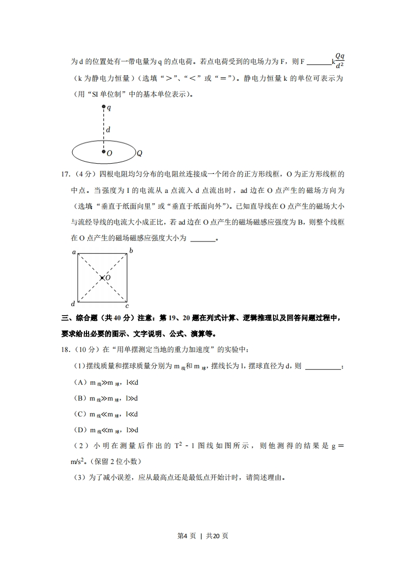 fbD.AaVn,a>anB.v1>Vn,aianD.VIR2,V1R2,V1>V2D.R1V211.(4分)神舟十三号在返回地面的过程中打开降落伞后,在大气层中经历了竖直向下的减速运动。若返回舱所受的空气阻力随速度的减小而减小,则加速度大小()A.一直减小B.一直增大C.先增大后减小D.先减小后增大12.(4分)如图,一个正方形导线框以初速Vo向右穿过一个有界的匀强磁场。线框两次速度发生变化所用时间分别为1和2,以及这两段时间内克服安培力做的功分别为W1和W2,则()0××××××A.t1<2,W1W2C.t>t,Wt,W1>W2二、填空题(共20分)13.(4分)在描述气体状态的参量中,是气体分子空间所能达到的范围。压强从微观角度来说,是的宏观体现。14.(4分)“玉兔号”月球车的电池中具有同位素“钚”。请补充该元素原子核发生的核反应方程式:Pu→4U+:该反应属于反应。(选填:“裂变”或“衰变”)15.(4分)半径为R的金属圆环里,有一个垂直于纸面向里且半径为r的圆形区域匀强磁场,磁感应强度的大小为B。若增大该区域内的磁感应强度,则金属圆环的感应电流方向为(选填:“顺时针”或“逆时针”):若保持圆形区域内磁场的磁感应强度大小不变,方向变化180°,则金属圆环的磁通量变化的大小为R16.(4分)水平面上有一带电量为Q的均匀带电圆环,圆心为0。其中央轴线上距离0点第3页|共20页