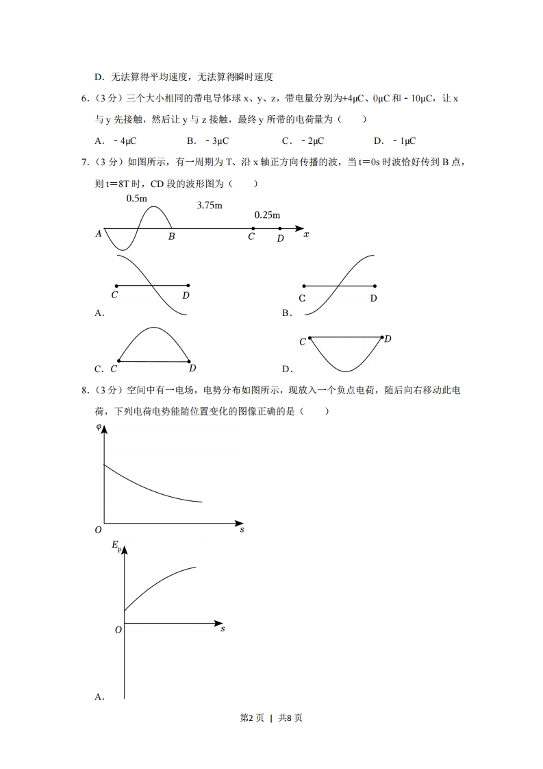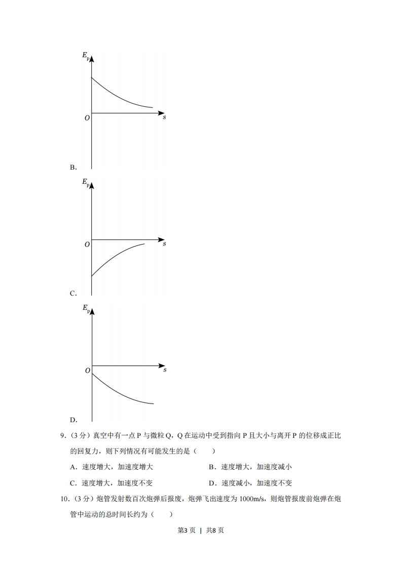 2023年上海市高考物理试卷(回忆版)一、选释题(共40分,第1-8小题,每题3分;第9-12小题,每题4分。每小题只有一个正确答案)1.(3分)关于α粒子散射实验正确的是()A.实验要在真空中进行B.荧光屏是为了阻挡粒子C.实验中显微镜必须正对放射源D.证明了原子核中有质子存在2.(3分)如图所示,四个完全相同的灯泡,亮度最高的是()A.LIB.L2C.L3D.L43.(3分)一物块爆炸分裂为速率相同、质量不同的三个物块,对三者落地速率大小判断正确的是()A.质量大的落地速率大B.质量小的落地速率大C.三者落地速率都相同D.无法判断4.(3分)一定质量的理想气体,经历如图过程,其中b、cd分别为双曲线的一部分。下列对a、b、c、d四点温度大小比较正确的是()0A.Ta>TbB.To>TeC.Te>TaD.Ta>Ta5.(3分)一场跑步比赛中,第三跑道的运动员跑到30m处时,秒表计时为3.29s。根据以上信总,能否算得该运动员在这段时间内的平均速度和瞬时速度()A,可以算得平均速度,可以算得瞬时速度B.无法算得平均速度,可以算得瞬时速度C.可以算得平均速度,无法算得瞬时速度第1页1共8页D.无法算得平均速度,无法算得瞬时速度6.(3分)三个大小相同的带电导体球x、y、z,带电量分别为+4μC、0μC和-10μC,让x与y先接触,然后让y与z接触,最终y所带的电荷量为()A.-4μCB.-3μCC.-2μCD.-1μC7.(3分)如图所示,有一周期为T、沿x轴正方向传播的波,当=0s时波恰好传到B点,则t=8T时,CD段的波形图为()0.5m3.75m0.25mBDBC.C8.(3分)空间中有一电场,电势分布如图所示,现放入一个负点电荷,随后向右移动此电荷,下列电荷电势能随位置变化的图像正确的是()0YsA第2页1共8页BE0D9.(3分)真空中有一点P与微粒Q,Q在运动中受到指向P且大小与离开P的位移成正比的回复力,则下列情况有可能发生的是()A.速度增大,加速度增大B.速度增大,加速度减小C.速度增大,加速度不变D.速度减小,加速度不变10.(3分)炮管发射数百次炮弹后报废,炮弹飞出速度为1000m/s,则炮管报废前炮弹在炮管中运动的总时间长约为()第3页1共8页