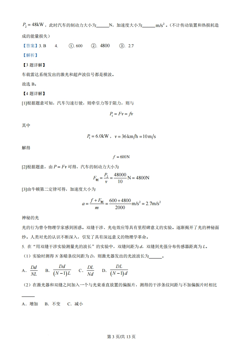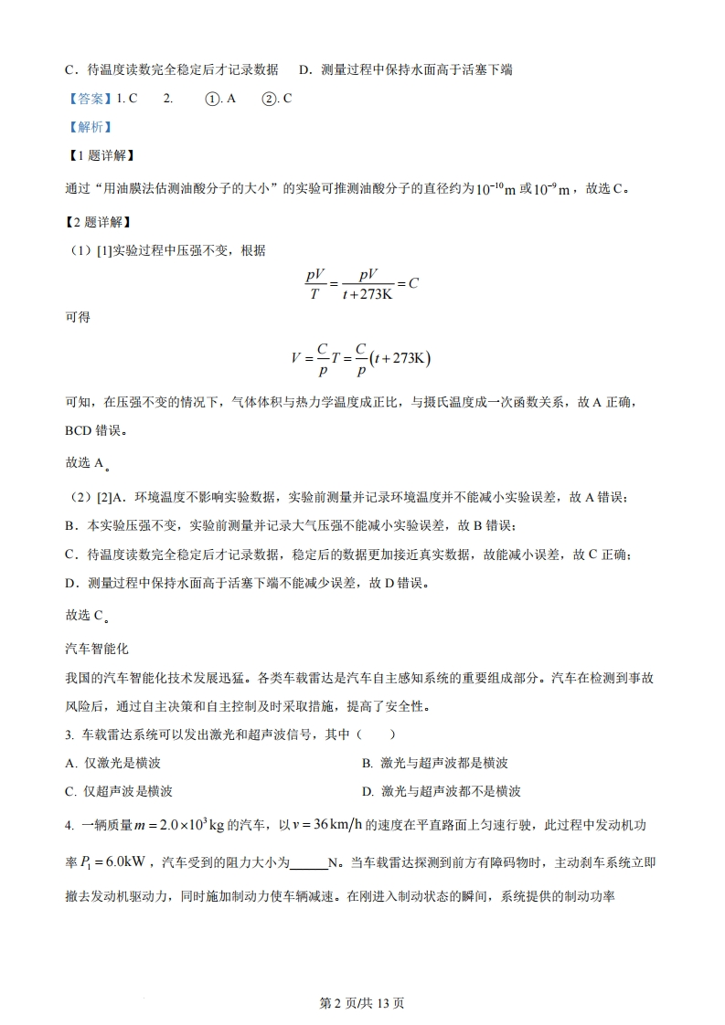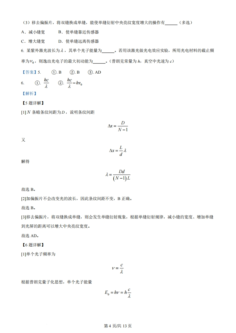 2024年上海市普通高中学业水平等级性考试物理试卷(考试时间60分钟,满分100分)“试题来自网络,非官方渠道,学科网不对真实性负责,请自行鉴别”特别提示:1。本试卷标注“多选”的试题,每小题有2~3个正确选项,漏选给一半分,错选不给分:未特别标注的选择类试题,每小题只有1个正确选项。2,在列式计算、逻辑推理以及回答问题过程中,须给出必要的图示、文字说明、公式、演算等。3.除特殊说明外,本卷所用重力加速度g大小均取9.8ms2。物质性质实验是人类认识物质世界的宏观性质与微观结构的重要手段之一,也是物理学研究的重要方法。1.通过“用油膜法估测油酸分子的大小”的实验可推测油酸分子的直径约为()A.10-15mB.10-12mC.10-9mD.10-6m2.验证气体体积随温度变化关系的实验装置如图所示,用支架将封有一定质量气体的注射器和温度传感器固定在盛有热水的烧杯中。实验过程中,随着水温的缓慢下降,记录多组气体温度和体积的数据。温度传感器(1)不考虑漏气因素,符合理论预期的图线是V/mL◆mLAT/KB.OT/K//mLV/mL∥dD.O∥o(2)下列有助于减小实验误差的操作是A.实验前测量并记录环境温度B.实验前测量并记录大气压强第1页供13页C.待温度读数完全稳定后才记录数据D.测量过程中保持水面高于活塞下端【答案】1.C2.①.A②.C【解析】【1题详解】通过“用油膜法估测油酸分子的大小”的实验可推测油酸分子的直径约为10-10m或10-9m,故选C。【2题详解】(1)[1]实验过程中压强不变,根据T1+273K=C可得=ST=9+273K)可知,在压强不变的情况下,气体体积与热力学温度成正比,与摄氏温度成一次函数关系,故A正确,BCD错误.故选A。(2)[2]A.环境温度不影响实验数据,实验前测量并记录环境温度并不能减小实验误差,故A错误:B.本实验压强不变,实验前测量并记录大气压强不能减小实验误差,故B错误:C.待温度读数完全稳定后才记录数据,稳定后的数据更加接近真实数据,故能减小误差,故C正确:D.测量过程中保持水面高于活塞下端不能减少误差,故D错误。故选C。汽车智能化我国的汽车智能化技术发展迅猛。各类车载雷达是汽车自主感知系统的重要组成部分。汽车在检测到事故风险后,通过自主决策和自主控制及时采取措施,提高了安全性。3.车载雷达系统可以发出激光和超声波信号,其中()A.仅激光是横波B.激光与超声波都是横波C.仅超声波是横波D.激光与超声波都不是横波4.一辆质量m=2.0×103kg的汽车,以v=36km/h的速度在平直路面上匀速行驶,此过程中发动机功率P=6.0kW,汽车受到的阻力大小为N。当车载雷达探测到前方有障码物时,主动刹车系统立即撤去发动机驱动力,同时施加制动力使车辆减速。在刚进入制动状态的瞬间,系统提供的制动功率第2页供13页P2=48kW,此时汽车的制动力大小为N,加速度大小为ms2。(不计传动装置和热损耗造成的能量损失)【答案】3.B4.①.600②.4800③.2.7【解析】【3题详解】车载雷达系统发出的激光和超声波信号都是横波。故选B。【4题详解】[1]根据题意可知,汽车匀速行驶,则牵引力等于阻力,则与P=Fv=fv其中P =6.0kW,v=36km/h =10m/s解得f=600N2]根据题意,由P=Fv可得,汽车的制动力大小为-卡-g2N=4N[3]由牛顿第二定律可得,加速度大小为a=f+F1=600+4800/s2=2.7ms2m2000神秘的光光的行为曾令物理学家感到困惑。双缝干涉、光电效应等具有里程碑意义的实验。逐渐揭开了光的神秘面纱。人类对光的认识不断深入,引发了具有深远意义的物理学革命。5.在“用双缝干涉实验测量光的波长”的实验中,双缝间距为d,双缝到光强分布传感器距离为L。(1)实验时测得N条暗条纹间距为D,则激光器发出的光波波长为DdDdDLANLB.(N-1)LC.DLNdD.(N-1)d(2)在激光器和双缝之间加入一个与光束垂直放置的偏振片,测得的干涉条纹间距与不加偏振片时相比A.增加B.不变C.减小第3页供13页