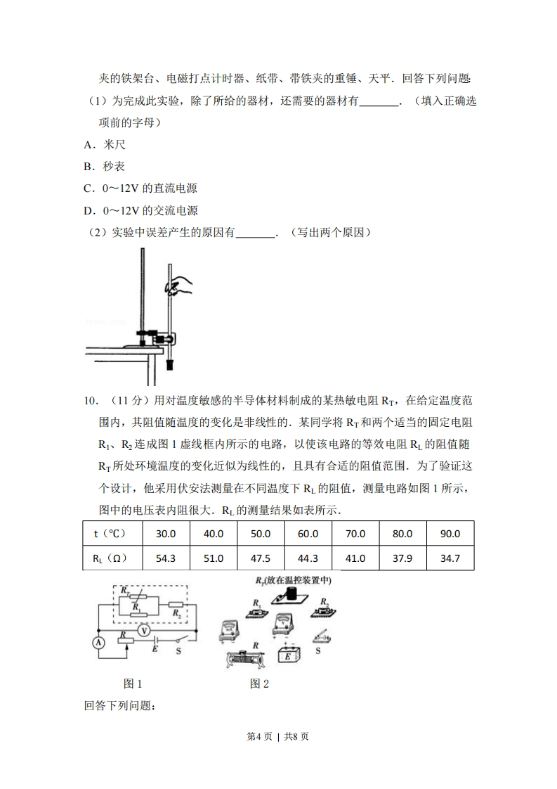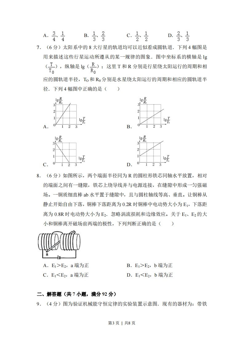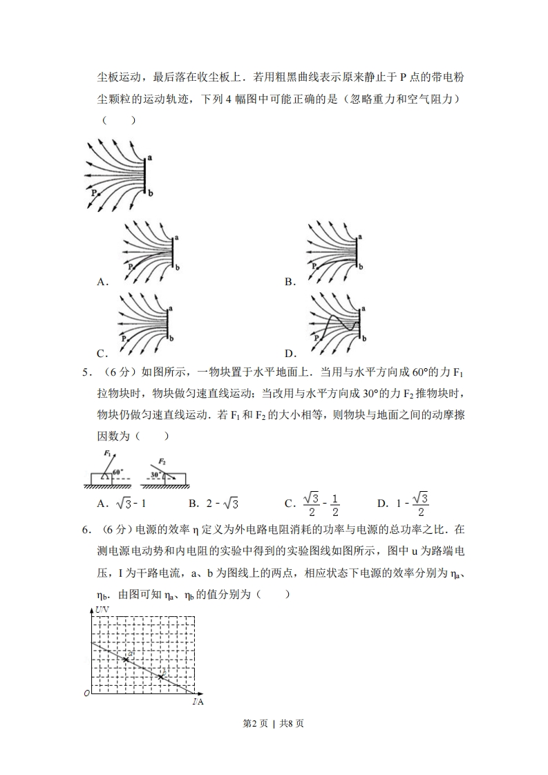 2010年全国高考物理试卷(新课标I)一、选择题(共8小题,每小题6分,满分48分)1,(6分)在电磁学发展过程中,许多科学家做出了贡献.下列说法正确的是()A.奥斯特发现了电流磁效应:法拉第发现了电磁感应现象B.麦克斯韦预言了电磁波:楞次用实验证实了电磁波的存在C.库仑发现了点电荷的相互作用规律密立根通过油滴实验测定了元电荷的数值D.安培发现了磁场对运动电荷的作用规律洛仑兹发现了磁场对电流的作用规律2.(6分)一根轻质弹簧一端固定,用大小为F1的力压弹簧的另一端,平衡时长度为1:改用大小为F2的力拉弹簧,平衡时长度为2,弹簧的拉伸或压缩均在弹性限度内,该弹簧的劲度系数为()A.F2-F1B.F2+F1C.F2+F1D.F2-F112-1112+1112-1112+113.(6分)如图所示,在外力作用下某质点运动的)-t图象为正弦曲线。从图中可以判断()VA.在0~t时间内,外力做正功B.在0~t时间内,外力的功率逐渐增大C.在2时刻,外力的功率最大D.在~t2时间内,外力做的总功为零4,(6分)静电除尘器是目前普遍采用的一种高效除尘器.某除尘器模型的收尘板是很长的条形金属板,图中直线b为该收尘板的横截面.工作时收尘板带正电,其左侧的电场线分布如图所示:粉尘带负电,在电场力作用下向收第1页|共8页尘板运动,最后落在收尘板上.若用粗黑曲线表示原来静止于P点的带电粉尘颗粒的运动轨迹,下列4幅图中可能正确的是(忽略重力和空气阻力)5.(6分)如图所示,一物块置于水平地面上.当用与水平方向成60的力F1拉物块时,物块做匀速直线运动:当改用与水平方向成30°的力F2推物块时,物块仍做匀速直线运动.若F,和F2的大小相等,则物块与地面之间的动摩擦因数为(A.√3-1B.2-V3c.3.122D.1-326,(6分)电源的效率1定义为外电路电阻消耗的功率与电源的总功率之比.在测电源电动势和内电阻的实验中得到的实验图线如图所示,图中山为路端电压,I为千路电流,a、b为图线上的两点,相应状态下电源的效率分别为na、nb.由图可知na、的值分别为()V第2页|共8页A子音B子号c合号D景号7.(6分)太阳系中的8大行星的轨道均可以近似看成圆轨道.下列4幅图是用来描述这些行星运动所遵从的某一规律的图象.图中坐标系的横轴是g(工),纵轴是g(R);这里T和R分别是行星绕太阳运行的周期和相ToRo应的圆轨道半径,To和R0分别是水星绕太阳运行的周期和相应的圆轨道半径.下列4幅图中正确的是()B08.(6分)如图所示,两个端面半径同为R的圆柱形铁芯同轴水平放置,相对的端面之间有一缝隙,铁芯上绕导线并与电源连接,在缝隙中形成一匀强磁场。一铜质细直棒b水平置于缝隙中,且与圆柱轴线等高、垂直。让铜棒从静止开始自由下落,铜棒下落距离为0.2R时铜棒中电动势大小为E1,下落距离为0.8R时电动势大小为E2.忽略涡流损耗和边缘效应。关于E1、E2的大小和铜棒离开磁场前两端的极性,下列判断正确的是()A.E1>E2,a端为正B.E1>E2,b端为正C.E1