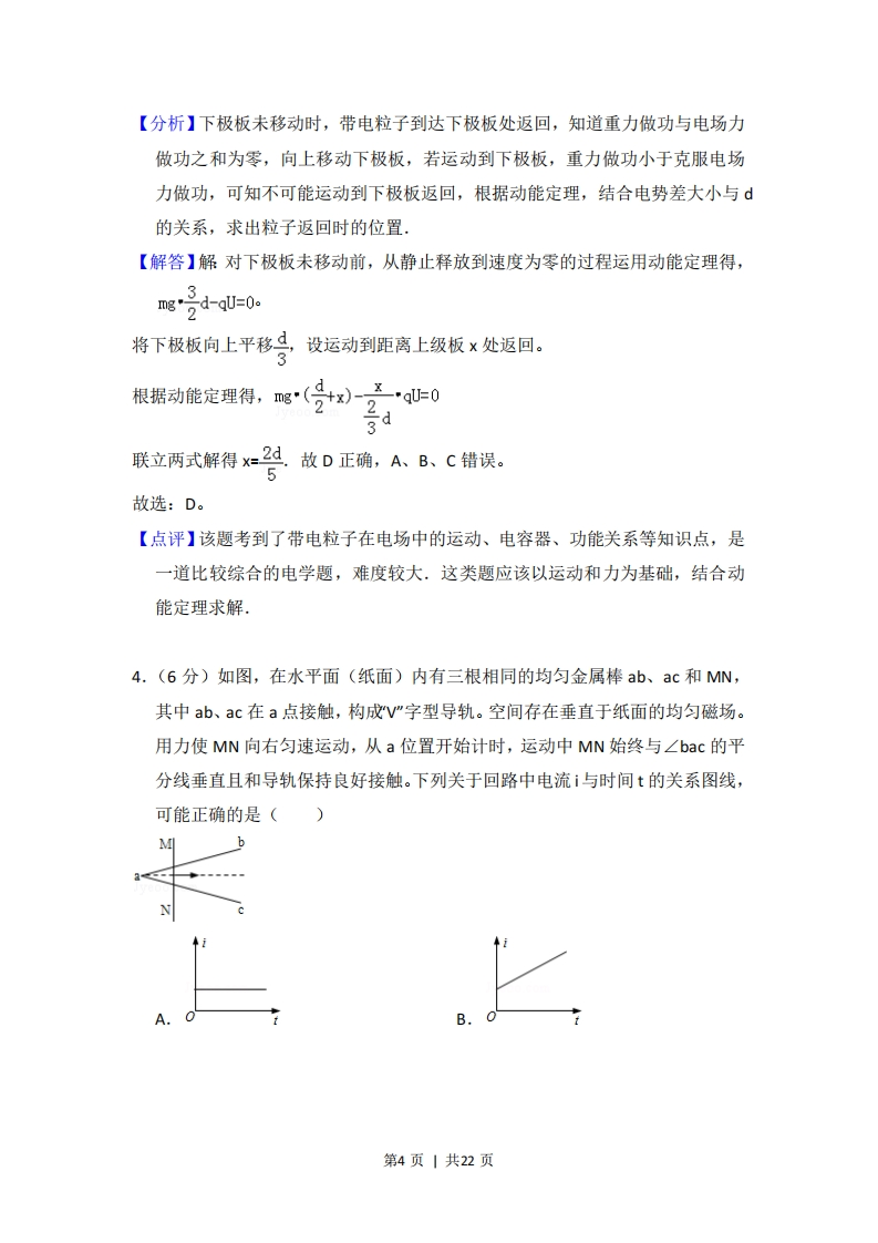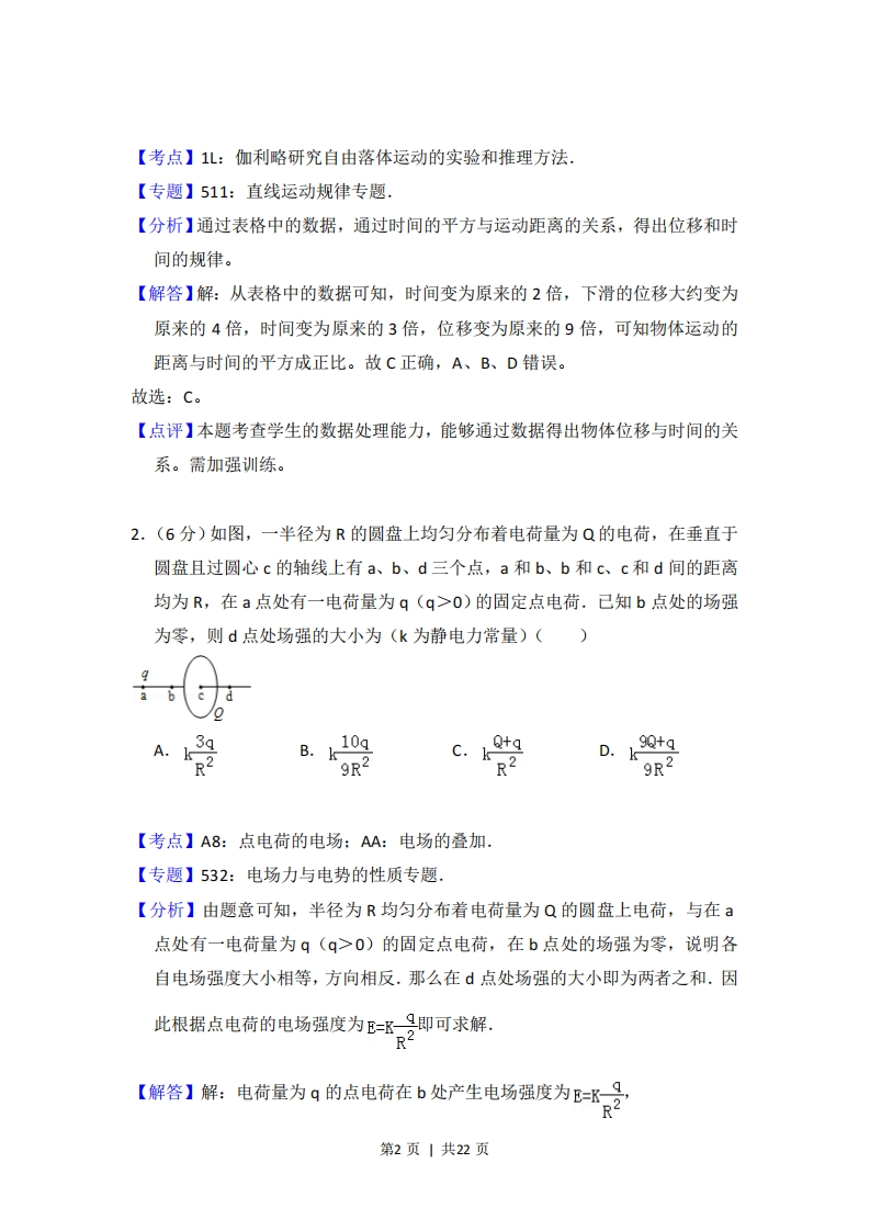 2013年全国统一高考物理试卷(新课标I)事考答来与试想解析一、选择题本题共8小题,每小题6分.在每小题给出的四个选项中,第1~5题只有一项符合题目要求,第6-8题有多项符合题目要求.全部选对的得6分,选对但不全的得3分,有选错的得0分,1.(6分)如图是伽利略1604年做斜面实验时的一页手稿照片,照片左上角的三列数据如下表。表中第二列是时间,第三列是物体沿斜面运动的距离,第一列是伽利略在分析实验数据时添加的。根据表中的数据,伽利略可以得出的结论是(1132413093298164526255824366119249716006482104A.物体具有惯性B.斜面倾角一定时,加速度与质量无关C.物体运动的距离与时间的平方成正比D.物体运动的加速度与重力加速度成正比第1页|共22页【考点】1L:伽利略研究自由落体运动的实验和推理方法.【专题】511:直线运动规律专题,【分析】通过表格中的数据,通过时间的平方与运动距离的关系,得出位移和时间的规律。【解答】解:从表格中的数据可知,时间变为原来的2倍,下滑的位移大约变为原来的4倍,时间变为原来的3倍,位移变为原来的9倍,可知物体运动的距离与时间的平方成正比。故C正确,A、B、D错误。故选:C。【点评】本题考查学生的数据处理能力,能够通过数据得出物体位移与时间的关系。需加强训练。2.(6分)如图,一半径为R的圆盘上均匀分布着电荷量为Q的电荷,在垂直于圆盘且过圆心c的轴线上有a、b、d三个点,a和b、b和c、c和d间的距离均为R,在a点处有一电荷量为q(q>0)的固定点电荷.已知b点处的场强为零,则d点处场强的大小为(k为静电力常量)()A.3q10qB.kC.k R2Q+4D.k9Q+q9R29R2【考点】A8:点电荷的电场:AA:电场的叠加.【专题】532:电场力与电势的性质专题【分析】由题意可知,半径为R均匀分布着电荷量为Q的圆盘上电荷,与在点处有一电荷量为q(q>0)的固定点电荷,在b点处的场强为零,说明各自电场强度大小相等,方向相反.那么在d点处场强的大小即为两者之和.因此根据点电荷的电场强度为=g即可求解。【解答】解:电荷量为g的点电荷在b处产生电场强度为=K号,第2页|共22页而半径为R均匀分布着电荷量为Q的圆盘上电荷,与在a点处有一电荷量为q(q>0)的固定点电荷,在b点处的场强为零,则圆盘在此处产生电场强度也为E=K号.那么圆盘在此d产生电场强度则仍为R8R2而电荷量为g的点电荷在d处产生电场强度为S)28.2'由于都在d9R2处产生电场强度方向相同,即为两者大小相加。所以两者这d处产生电场强度为K10g,故B正确,ACD错误。9R2故选:B。【点评】考查点电荷与圆盘电荷在某处的电场强度叠加,紧扣电场强度的大小与方向关系,从而为解题奠定基础3,(6分)一水平放置的平行板电容器的两极板间距为d,极板分别与电池两极相连,上极板中心有一小孔(小孔对电场的影响可忽略不计)。小孔正上方处的P点有一带电粒子,该粒子从静止开始下落,经过小孔进入电容器,并在下极板处(未与极板接触)返回。若将下极板向上平移¢,则从P点开始下落的相同粒子将()PA.打到下极板上B.在下极板处返回C.在距上极板d处返回D.在距上极板2d处返回25【考点】AK:带电粒子在匀强电场中的运动:AS:电容器的动态分析.【专题】533:电容器专题.第3页|共22页