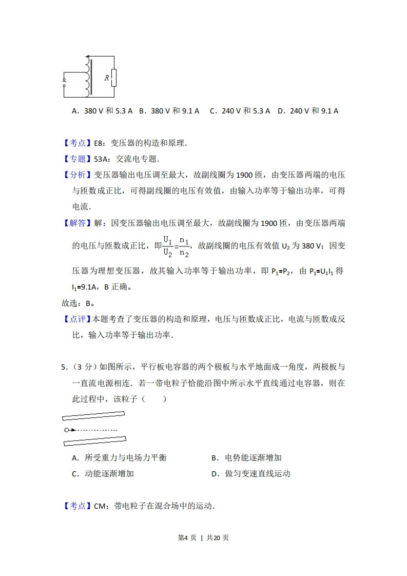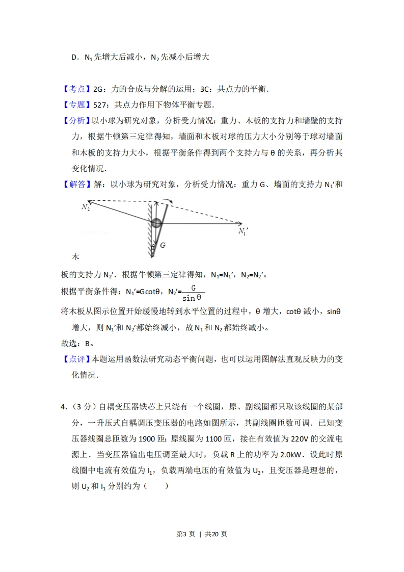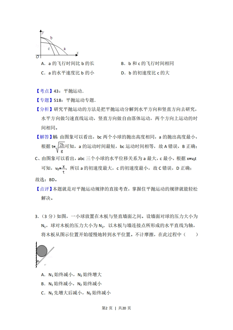 2012年全国统一高考物理试卷(新课标)考答来与试想解析一,选择题1.(3分)伽利略根据小球在斜面上运动的实验和理想实验,提出了惯性的概念,从而奠定了牛顿力学的基础.早期物理学家关于惯性有下列说法,其中正确的是()A.物体抵抗运动状态变化的性质是惯性B.没有力作用,物体只能处于静止状态C.行星在圆周轨道上保持匀速率运动的性质是惯性D.运动物体如果没有受到力的作用,将继续以同一速度沿同一直线运动【考点】31:惯性与质量.【分析】根据惯性定律解释即可:任何物体都有保持原来运动状态的性质,惯性的大小只跟质量有关,与其它任何因素无关,【解答】解:A、任何物体都有保持原来运动状态的性质,叫着惯性,所以物体抵抗运动状态变化的性质是惯性,故A正确:B、没有力作用,物体可以做匀速直线运动,故B错误:C、惯性是保持原来运动状态的性质,圆周运动速度是改变的,故C错误:D、运动的物体在不受力时,将保持匀速直线运动,故D正确:故选:AD。【点评】牢记惯性概念,知道一切物体在任何时候都有惯性,质量是惯性的唯一量度2.(3分)如图,×轴在水平地面内,y轴沿竖直方向。图中画出了从y轴上沿×轴正向抛出的三个小球a、b和c的运动轨迹,其中b和c是从同一点抛出的,不计空气阻力,则()第1页|共20页A.a的飞行时间比b的长B.b和c的飞行时间相同C.a的水平速度比b的小D.b的初速度比c的大【考点】43:平抛运动,【专题】518:平抛运动专题.【分析】研究平抛运动的方法是把平抛运动分解到水平方向和竖直方向去研究,水平方向做匀速直线运动,竖直方向做自由落体运动,两个方向上运动的时间相同。【解答】解由图象可以看出,bc两个小球的抛出高度相同,a的抛出高度最小,根据t=,h可知,a的运动时间最短,bc运动时间相等,故A错误,B正确:C、由图象可以看出,abc三个小球的水平位移关系为a最大,c最小,根据x=vot可知,vo=X,所以a的初速度最大,c的初速度最小,故C错误,D正确:故选:BD。【点评】本题就是对平抛运动规律的直接考查,掌握住平抛运动的规律就能轻松解决。3.(3分)如图,一小球放置在木板与竖直墙面之间。设墙面对球的压力大小为N1,球对木板的压力大小为N2,以木板与墙连接点所形成的水平直线为轴,将木板从图示位置开始缓慢地转到水平位置。不计摩擦,在此过程中()A.N1始终减小,N2始终增大B.N1始终减小,N2始终减小C.N1先增大后减小,N2始终减小第2页|共20页D.N先增大后减小,N2先减小后增大【考点】2G:力的合成与分解的运用:3C:共点力的平衡.【专题】527:共点力作用下物体平衡专题.【分析】以小球为研究对象,分析受力情况:重力、木板的支持力和墙壁的支持力,根据牛顿第三定律得知,墙面和木板对球的压力大小分别等于球对墙面和木板的支持力大小,根据平衡条件得到两个支持力与日的关系,再分析其变化情况.【解答】解:以小球为研究对象,分析受力情况:重力G、墙面的支持力N'和安外木板的支持力N2'.根据牛顿第三定律得知,N1=N1',N2=N2'。根据平衡条件得:N'=Gcot旧,N2=,Gsine将木板从图示位置开始缓慢地转到水平位置的过程中,日增大,cot旧减小,si日增大,则N1'和N2'都始终减小,故N1和N2都始终减小。故选:B。【点评】本题运用函数法研究动态平衡问题,也可以运用图解法直观反映力的变化情况4.(3分)自耦变压器铁芯上只绕有一个线圈,原、副线圈都只取该线圈的某部分,一升压式自耦调压变压器的电路如图所示,其副线圈匝数可调.已知变压器线圈总匝数为1900匝:原线圈为1100匝,接在有效值为220V的交流电源上.当变压器输出电压调至最大时,负载R上的功率为2.0kW.设此时原线圈中电流有效值为1,负载两端电压的有效值为U2,且变压器是理想的,则U2和11分别约为()第3页|共20页