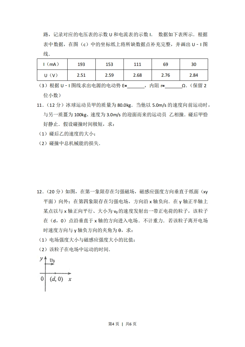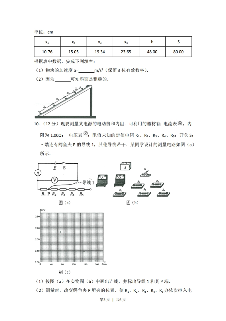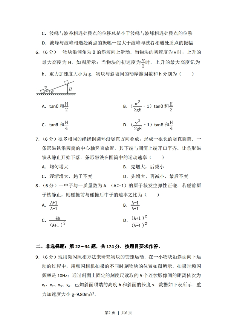 2014年全国统一高考物理试卷(大纲卷)一、选择题:本题共8小题,每小题6分。在每小题给出的四个选项中,有的只有一项符合题目要求,有的有多项符合题目要求。全部选对的得6分,选对但不全的得3分,有选错的得0分.1.(6分)一质点沿x轴做直线运动,其v-t图象如图所示.质点在t=0时位于x=5m处,开始沿x轴正向运动.当t=8s时,质点在x轴上的位置为()↑zlms0123486778sA.x=3mB.x=8mC.x=9mD.x=14m2.(6分)地球表面附近某区域存在大小为150N/C、方向竖直向下的电场.一质量为1.00×I0-4kg、带电量为-1.00×10-7c的小球从静止释放,在电场区域内下落10.0m,对此过程,该小球的电势能和动能的改变量分别为(重力加速度大小取9.80m/s2,忽略空气阻力)()A.-1.50×10-4和9.95×103JB.1.50X10-4和9.95×10-3JC.-1.50×10-4」和9.65×10-3JD.1.50×10-4J和9.65×10-3J3.(6分)对于一定量的稀薄气体,下列说法正确的是()A.压强变大时,分子热运动必然变得剧烈B.保持压强不变时,分子热运动可能变得剧烈C.压强变大时,分子间的平均距离必然变小D.压强变小时,分子间的平均距离可能变小4.6分)在双缝干涉实验中,一钠灯发出的波长为589m的光,在距双缝1.00m的屏上形成干涉图样.图样上相邻两明纹中心间距为0.350cm,则双缝的间距为()A.2.06X10-7mB.2.06×10-4mC.1.68X10-4mD.1.68×10-3m5,(6分)两列振动方向相同、振幅分别为A1和A2的相干简谐横波相遇.下列说法正确的是()A.波峰与波谷相遇处质点的振幅为A1-A2]B.波峰与波峰相遇处质点离开平衡位置的位移始终为A+A2第1页1共6页C.波峰与波谷相遇处质点的位移总是小于波峰与波峰相遇处质点的位移D.波峰与波峰相遇处质点的振幅一定大于波峰与波谷相遇处质点的振幅6.(6分)一物块沿倾角为日的斜坡向上滑动.当物块的初速度为V时,上升的最大高度为H,如图所示:当物块的初速度为二时,上升的最大高度记为h.重力加速度大小为g.物块与斜坡间的动摩擦因数和h分别为()A.tan日和28.(22gH~1)tan6和马C.tan和马D.(22gH~1)tan8和47.(6分)很多相同的绝缘铜圆环沿竖直方向叠放,形成一很长的竖直圆筒.一条形磁铁沿圆简的中心轴竖直放置,其下端与圆筒上端开口平齐.让条形磁铁从静止开始下落.条形磁铁在圆简中的运动速率()A.均匀增大B.先增大,后减小C.逐渐增大,趋于不变D.先增大,再减小,最后不变8.(6分)一中子与一质量数为A(A>1)的原子核发生弹性正碰.若碰前原子核静止,则碰撞前与碰撞后中子的速率之比为()A.A+1A-1A-1B.A+1C.4AD.A+1)2(A+1)2(A-1)2二、非选择题:第22一34题,共174分.按题目要求作答.9.(6分)现用频闪照相方法来研究物块的变速运动.在一小物块沿斜面向下运动的过程中,用频闪相机拍摄的不同时刻物块的位置如图所示.拍摄时频闪频率是10Hz:通过斜面上固定的刻度尺读取的5个连续影像间的距离依次为x1、x2、3、X·己知斜面顶端的高度h和斜面的长度s.数据如下表所示.重力加速度大小g=9.80m/s2.第2页1共6页单位:cmX1为X3七hs10.7615.0519.3423.6548.0080.00根据表中数据,完成下列填空:(1)物块的加速度a=m/s2(保留3位有效数字).(2)因为可知斜面是粗糙的,10.(12分)现要测量某电源的电动势和内阻.可利用的器材有:电流表@,内阻为1.000:电压表O:阻值未知的定值电阻R1、R2、R3、R4、R5:开关S:-端连有鳄鱼夹P的导线1,其他导线若干.某同学设计的测量电路如图(a)所示.EA40-导线1R P R2 R3 R4 Rs图(a)图(b)2272.625080120160200图(c)(1)按图(a)在实物图(b)中画出连线,并标出导线1和其P端(2)测量时,改变鳄鱼夹P所夹的位置,使R1、R2、R、R4、R5办依次串入电第3页1共6页