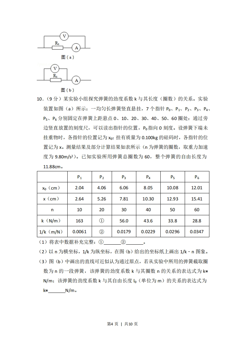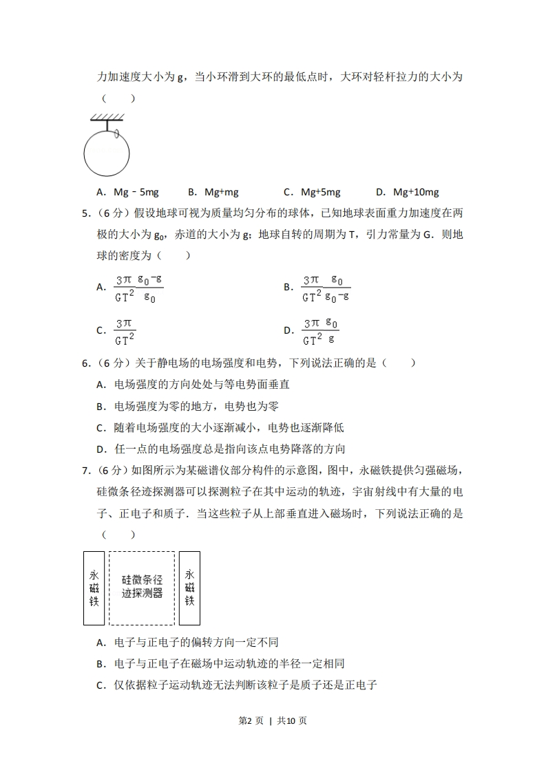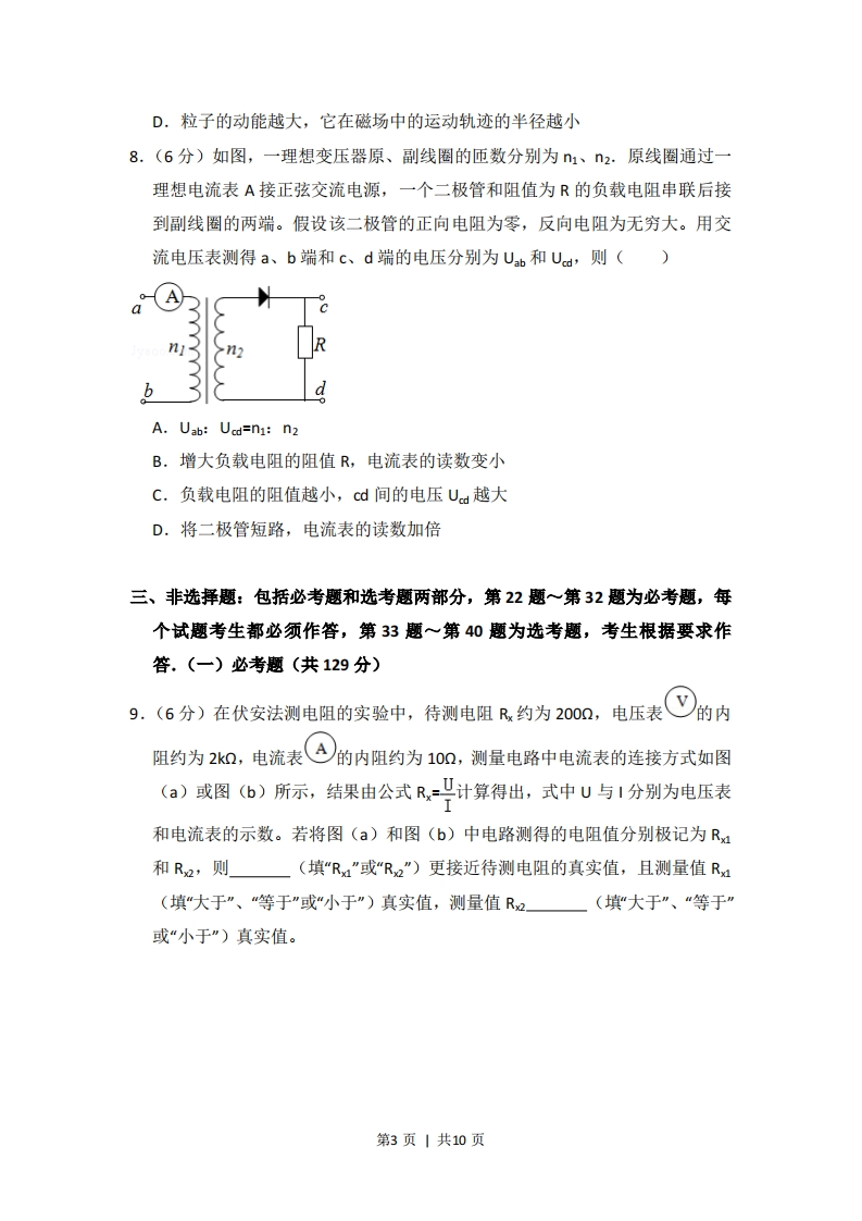 2014年全国统一高考物理试卷(新课标Ⅱ)二、选择题本题共8小题,每小题6分,在每小题给出的四个选项中,第14~18题只有一项符合题目要求,第19~21题有多项符合题目要求.全部选对的得6分,选对但不全的得3分,有选错的得0分,1.(6分)甲乙两汽车在一平直公路上同向行驶,在t=0到t=t1的时间内,它们的V-t图象如图所示。在这段时间内()甲A.汽车甲的平均速度比乙的大B.汽车乙的平均速度等于V1+v22C.甲乙两汽车的位移相同D.汽车甲的加速度大小逐渐减小,汽车乙的加速度大小逐渐增大2.(6分)取水平地面为重力势能零点,一物块从某一高度水平抛出,在抛出点其动能与重力势能恰好相等,不计空气阻力,该物块落地时的速度方向与水平方向的夹角为()A晋8.4c.D.5π123.6分)一物体静止在粗糙水平地面上,现用一大小为F1的水平拉力拉动物体,经过一段时间后其速度为,若将水平拉力的大小改为F2,物体从静止开始经过同样的时间后速度变为2v,对于上述两个过程,用W1、W2分别表示拉力F1、F2所做的功,WH、W2分别表示前两次克服摩擦力所做的功,则()A.WF2>4WF1,Wr>2WnB.WF2>4WF1,Wf2=2Wf1C.Wr2<4W,Wp=2WnD.Wp2<4W1,Wp<2W4.(6分)如图,一质量为M的光滑大圆环,用一细轻杆固定在竖直平面内:套在大环上质量为m的小环(可视为质点),从大环的最高处由静止滑下.重第1页|共10页力加速度大小为g,当小环滑到大环的最低点时,大环对轻杆拉力的大小为()A.Mg-5mgB.Mg+mgC.Mg+5mgD.Mg+10mg5,(6分)假设地球可视为质量均匀分布的球体,已知地球表面重力加速度在两极的大小为g0,赤道的大小为g:地球自转的周期为T,引力常量为G.则地球的密度为()A.3兀808B.3元80GT2 EoGT28o-8c.3πGT2D.3元80GT2g6.(6分)关于静电场的电场强度和电势,下列说法正确的是()A.电场强度的方向处处与等电势面垂直B.电场强度为零的地方,电势也为零C.随着电场强度的大小逐渐减小,电势也逐渐降低D.任一点的电场强度总是指向该点电势降落的方向7.(6分)如图所示为某磁谱仪部分构件的示意图,图中,永磁铁提供匀强磁场,硅微条径迹探测器可以探测粒子在其中运动的轨迹,宇宙射线中有大量的电子、正电子和质子.当这些粒子从上部垂直进入磁场时,下列说法正确的是()永!硅微条径永迹探测器铁铁A.电子与正电子的偏转方向一定不同B.电子与正电子在磁场中运动轨迹的半径一定相同C,仅依据粒子运动轨迹无法判断该粒子是质子还是正电子第2页|共10页D.粒子的动能越大,它在磁场中的运动轨迹的半径越小8.(6分)如图,一理想变压器原、副线圈的匝数分别为1、n2,原线圈通过一理想电流表A接正弦交流电源,一个二极管和阻值为R的负载电阻串联后接到副线圈的两端。假设该二极管的正向电阻为零,反向电阻为无穷大。用交流电压表测得a、b端和c、d端的电压分别为Uab和Uca,则()bA.Uab:Ucd=n1:n2B.增大负载电阻的阻值R,电流表的读数变小C.负载电阻的阻值越小,cd间的电压Ua越大D.将二极管短路,电流表的读数加倍三、非选择题:包括必考题和选考题两部分,第22题~第32题为必考题,每个试题考生都必须作答,第33题~第40题为选考题,考生根据要求作答.(一)必考题(共129分)9.(6分)在伏安法测电阻的实验中,待测电阻R约为200Q,电压表的内阻约为2kQ,电流表8的内阻约为10Q,测量电路中电流表的连接方式如图(a)或图(b)所示,结果由公式R,-'计算得出,式中U与1分别为电压表和电流表的示数。若将图(a)和图(b)中电路测得的电阻值分别极记为R:和Ra,则(填“R”或"Rz”)更接近待测电阻的真实值,且测量值R(填“大于”、"等于”或“小于”)真实值,测量值R2(填大于”、“等于”或“小于”)真实值。第3页|共10页