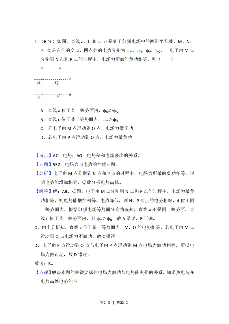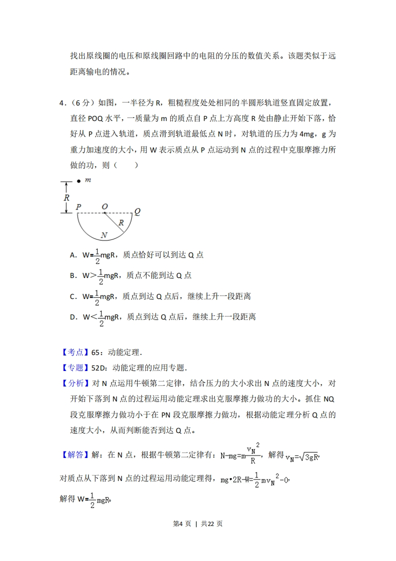2015年全国统一高考物理试卷(新课标I)事考答案与试题佩折一、选择题(本题共8小题,每小题6分,在每小题给出的四个选项中,第1-5题只有一项符合题目要求。第6-8题有多项符合题目要求。全部选对的得6分,选对但不全的得3分,有选错的得0分)1.(6分)两相邻匀强磁场区域的磁感应强度大小不同、方向平行。一速度方向与磁感应强度方向垂直的带电粒子(不计重力),从较强磁场区域进入到较弱磁场区域后粒子的()A.轨道半径增大,角速度增大B.轨道半径增大,角速度减小C.轨道半径减小,速度增大D.轨道半径减小,速度不变【考点】C1:带电粒子在匀强磁场中的运动.【专题】34:比较思想:43:推理法:536:带电粒子在磁场中的运动专题.【分析】通过洛伦兹力提供向心力得知轨道半径的公式,结合该公式即可得知进入到较弱磁场区域后时,半径的变化情况:再利用线速度与角速度半径之间的关系式,即可得知进入弱磁场区域后角速度的变化情况。【解答】解:带电粒子在匀强磁场中做匀速圆周运动,根据洛伦兹力提供向,心力:qv8mR可得:R=YaB从较强磁场区域进入到较弱磁场区域后,B减小,所以R增大。线速度、角速度的关系为:v=ωR因为洛伦兹力不做功,故线速度V的大小不变,半径增大,所以角速度减小,故B正确,ACD错误。故选:B。【点评】本题考查带电粒子在磁场中的运动,解答该题要明确洛伦兹力始终不做功,洛伦兹力只是改变带电粒子的运动方向。还要熟练的掌握半径公式=严aB和周期公式T=2T四的运用。aB第1页|共22页2.(6分)如图,直线a、b和c、d是处于匀强电场中的两组平行线,M、N、P、Q是它们的交点,四点处的电势分别为中M,中N,中P,a,一电子由M点分别到N点和P点的过程中,电场力所做的负功相等,则()A.直线a位于某一等势面内,中M>中aB.直线c位于某一等势面内,中M>中NC.若电子由M点运动到Q点,电场力做正功D,若电子由P点运动到Q点,电场力做负功【考点】AC:电势:AG:电势差和电场强度的关系.【专题】532:电场力与电势的性质专题.【分析】电子由M点分别到N点和P点的过程中,电场力所做的负功相等,说明电势能增加相等,据此分析电势高低。【解答】解:AB、据题,电子由M点分别到N点和P点的过程中,电场力做负功相等,则电势能增加相等,电势降低,则N、P两点的电势相等,d位于同一等势面内,根据匀强电场等势面分布情况知,直线a不是同一等势面,直线c位于某一等势面内,且中M>中N,故A错误,B正确。C、由上分析知,直线c位于某一等势面内,M、Q的电势相等,若电子由M点运动到Q点电场力不做功,故C错误。D、电子由P点运动到Q点与电子由P点运动到M点电场力做功相等,所以电场力做正功,故D错误。故选:B。【点评】解决本题的关键要抓住电场力做功与电势能变化的关系,知道负电荷在电势高处电势能小。第2页|共22页3.(6分)一理想变压器的原,副线圈的匝数比为3:1,在原、副线圈的回路中分别接有阻值相同的电阻,原线圈一侧接在电压为220V的正弦交流电源上,如图所示,设副线圈回路中电阻两端的电压为U,原、副线圈回路中电阻消耗的功率的比值为k,则()A.U=66V,k=1B.U=22V,k=c.U=66v,k=号D.U=22V,k=19【考点】E8:变压器的构造和原理【专题】53A:交流电专题,【分析】首先计算出通过副线圈的电流,由变比关系可知原线圈的电流,继而可表示出与原线圈串联的电阻的分压,结合题意即可在原线圈上列出电压的等式,可求出副线圈上的电压。利用焦耳定律可表示出两个电阻的功率,继而可解的比值k。【解答】解:由愿意知:副线圈的电流为:6贵则原线圈的电流为:4号1录与原线圈串联的电阻的电压为:UR=lR=3由变压器的变比可知,原线圈的电压为3U,所以有:号+320v解得:U=66V原线圈回路中的电阻的功率为:P=IR=09R副线圈回路中的电阻的功率为:P,=R所以kP1-1P29选项A正确,BCD错误故选:A。【点评】该题的突破口是表示出原线圈中的电流和原线圈回路中的电阻的分压,第3页|共22页