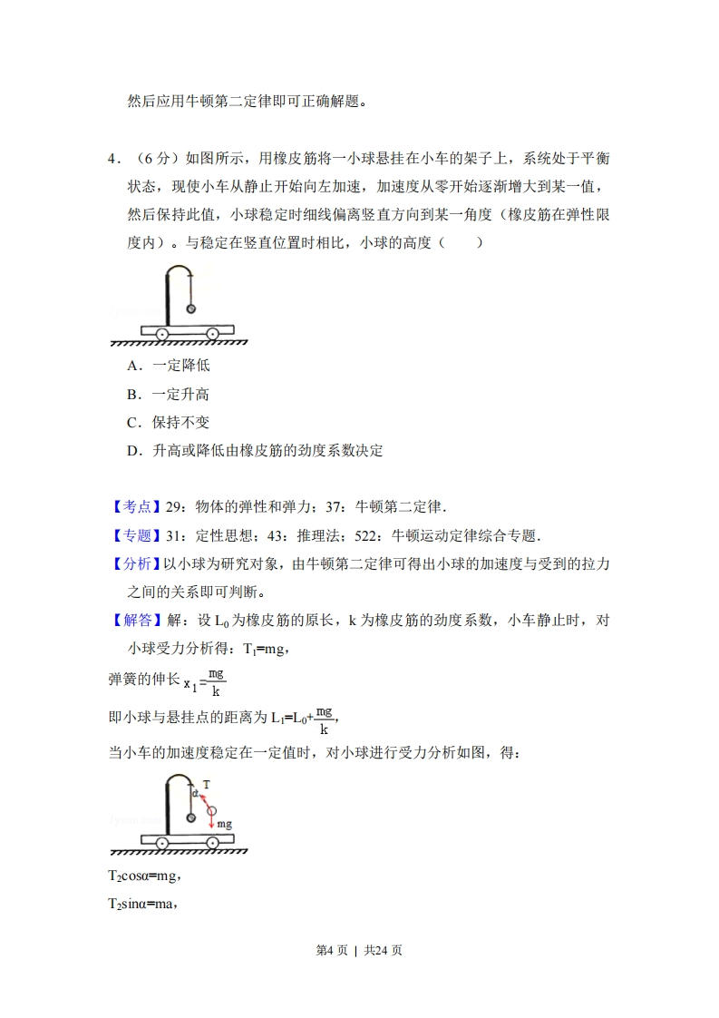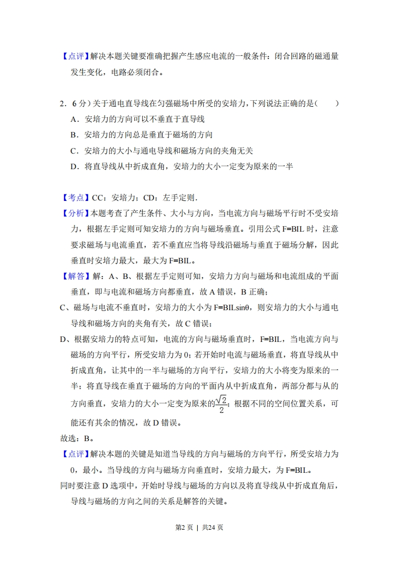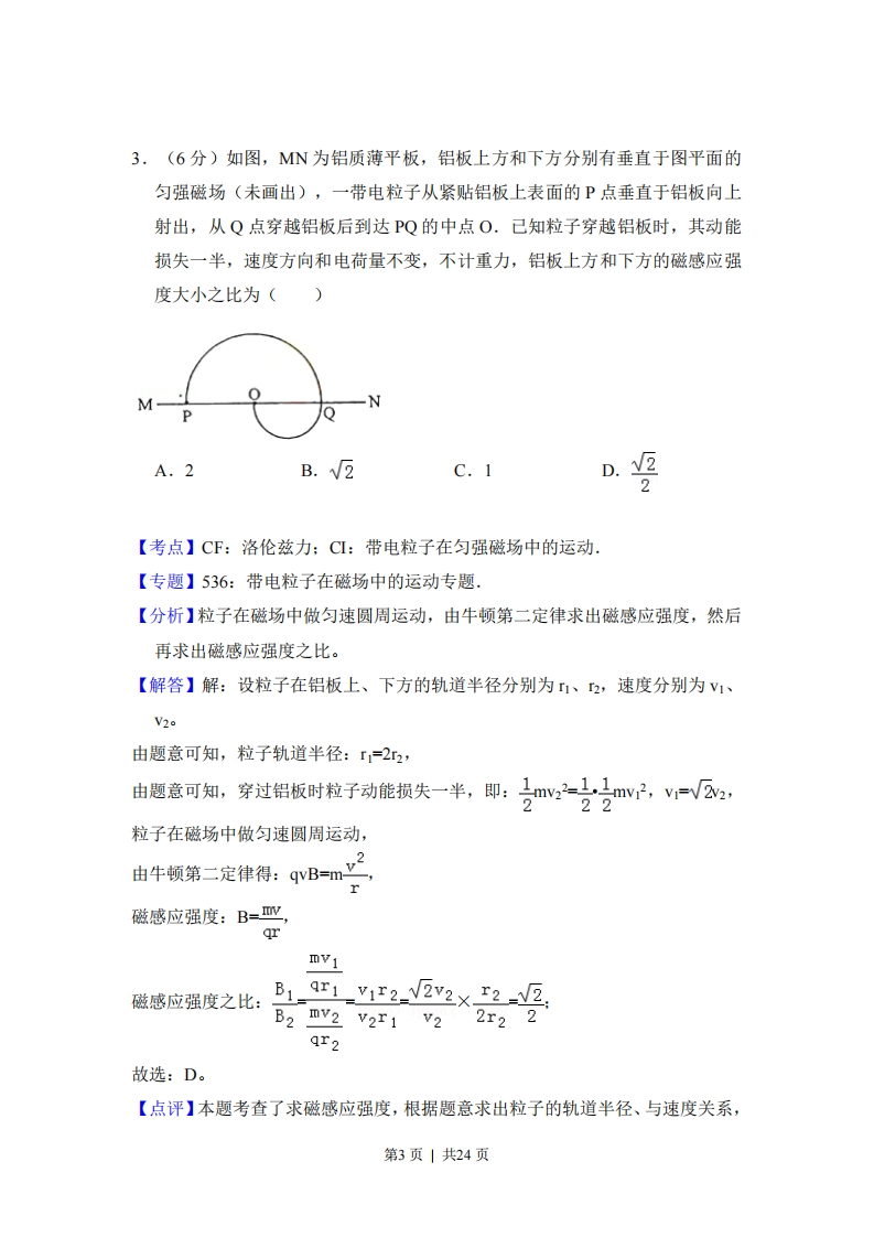 2014年全国统一高考物理试卷(新课标I)事考答来与试想解析一、选择题:本题共8小题,每小题6分,在每题给出的四个选项中,第14-18题只有一项符合题目要求,第19-21题有多项符合题目要求。全部选对的得6分,选对但不全的得3分,有选错的得0分。1.(6分)在法拉第时代,下列验证“由磁产生电”设想的实验中,能观察到感应电流的是()A,将绕在磁铁上的线圈与电流表组成一闭合回路,然后观察电流表的变化B.在一通电线圈旁放置一连有电流表的闭合线圈,然后观察电流表的变化C.将一房间内的线圈两端与相邻房间的电流表连接,往线圈中插入条形磁铁后,再到相邻房间去观察电流表的变化D.绕在同一铁环上的两个线圈,分别接电源和电流表,在给线圈通电或断电的瞬间,观察电流表的变化【考点】D2:感应电流的产生条件.【分析】产生感应电流的条件:闭合回路的磁通量发生变化或闭合电路的一部分导体在磁场中做切割磁感线运动,导体中有感应电流。【解答】解:A、将绕在磁铁上的线圈与电流表组成一闭合回路,回路中没有磁通量的变化,不能产生感应电流,观察到电流表没有变化,故A错误:B、在一通电线圈旁放置一连有电流表的闭合线圈,回路中没有磁通量的变化,不能产生感应电流,观察到电流表没有变化,故B错误:C、将一房间内的线圈两端与相邻房间的电流表连接,往线圈中插入条形磁铁的过程中有感应电流产生,但是之后,再到相邻房间去观察时,回路中已经没有磁通量的变化,此时观察到的电流表没有变化,故C错误:D、绕在同一铁环上的两个线圈,分别接电源和电流表,在给线圈通电或断电的瞬间,回路中的磁通量发生变化,能观察电流表的变化,故D正确。故选:D。第1页|共24页【点评】解决本题关键要准确把握产生感应电流的一般条件:闭合回路的磁通量发生变化,电路必须闭合。2.6分)关于通电直导线在匀强磁场中所受的安培力,下列说法正确的是()A.安培力的方向可以不垂直于直导线B.安培力的方向总是垂直于磁场的方向C.安培力的大小与通电导线和磁场方向的夹角无关D.将直导线从中折成直角,安培力的大小一定变为原来的一半【考点】CC:安培力:CD:左手定则:【分析】本题考查了产生条件、大小与方向,当电流方向与磁场平行时不受安培力,根据左手定则可知安培力的方向与磁场垂直。引用公式F=BL时,注意要求磁场与电流垂直,若不垂直应当将导线沿磁场与垂直于磁场分解,因此垂直时安培力最大,最大为F=BL。【解答】解:A、B、根据左手定则可知,安培力方向与磁场和电流组成的平面垂直,即与电流和磁场方向都垂直,故A错误,B正确:C、磁场与电流不垂直时,安培力的大小为F=BLsi0,则安培力的大小与通电导线和磁场方向的夹角有关,故C错误:D、根据安培力的特点可知,电流的方向与磁场垂直时,F=BL,当电流方向与磁场的方向平行,所受安培力为0:若开始时电流与磁场垂直,将直导线从中折成直角,让其中的一半与磁场的方向平行,安培力的大小将变为原来的一半:将直导线在垂直于磁场的方向的平面内从中折成直角,两部分都与从的方向垂直,安培力的大小一定变为原来的三,根据不同的空间位置关系,可能还有其余的情况,故D错误。故选:B。【点评】解决本题的关键是知道当导线的方向与磁场的方向平行,所受安培力为0,最小。当导线的方向与磁场方向垂直时,安培力最大,为F=BL。同时要注意D选项中,开始时导线与磁场的方向以及将直导线从中折成直角后,导线与磁场的方向之间的关系是解答的关键。第2页|共24页3.(6分)如图,MN为铝质薄平板,铝板上方和下方分别有垂直于图平面的匀强磁场(未画出),一带电粒子从紧贴铝板上表面的P点垂直于铝板向上射出,从Q点穿越铝板后到达PQ的中点O.已知粒子穿越铝板时,其动能损失一半,速度方向和电荷量不变,不计重力,铝板上方和下方的磁感应强度大小之比为()MA.2B.√2C.1D.2【考点】C℉:洛伦兹力:C:带电粒子在匀强磁场中的运动【专题】536:带电粒子在磁场中的运动专题.【分析】粒子在磁场中做匀速圆周运动,由牛顿第二定律求出磁感应强度,然后再求出磁感应强度之比。【解答】解:设粒子在铝板上、下方的轨道半径分别为1、2,速度分别为V1、V2e由题意可知,粒子轨道半径:「=2r2,由您意可知,穿过铝板时粒子动能损失一半,即:mv,之v,V-,22粒子在磁场中做匀速圆周运动,由牛顿第二定律得:qvBm2磁感应强度:B=Vgrmv1磁感应强度之比:B1F1_V1T2-V2V2X F2-V2B2 mv2 v2T1 V22r22q工2故选:D。【点评】本题考查了求磁感应强度,根据题意求出粒子的轨道半径、与速度关系,第3页|共24页