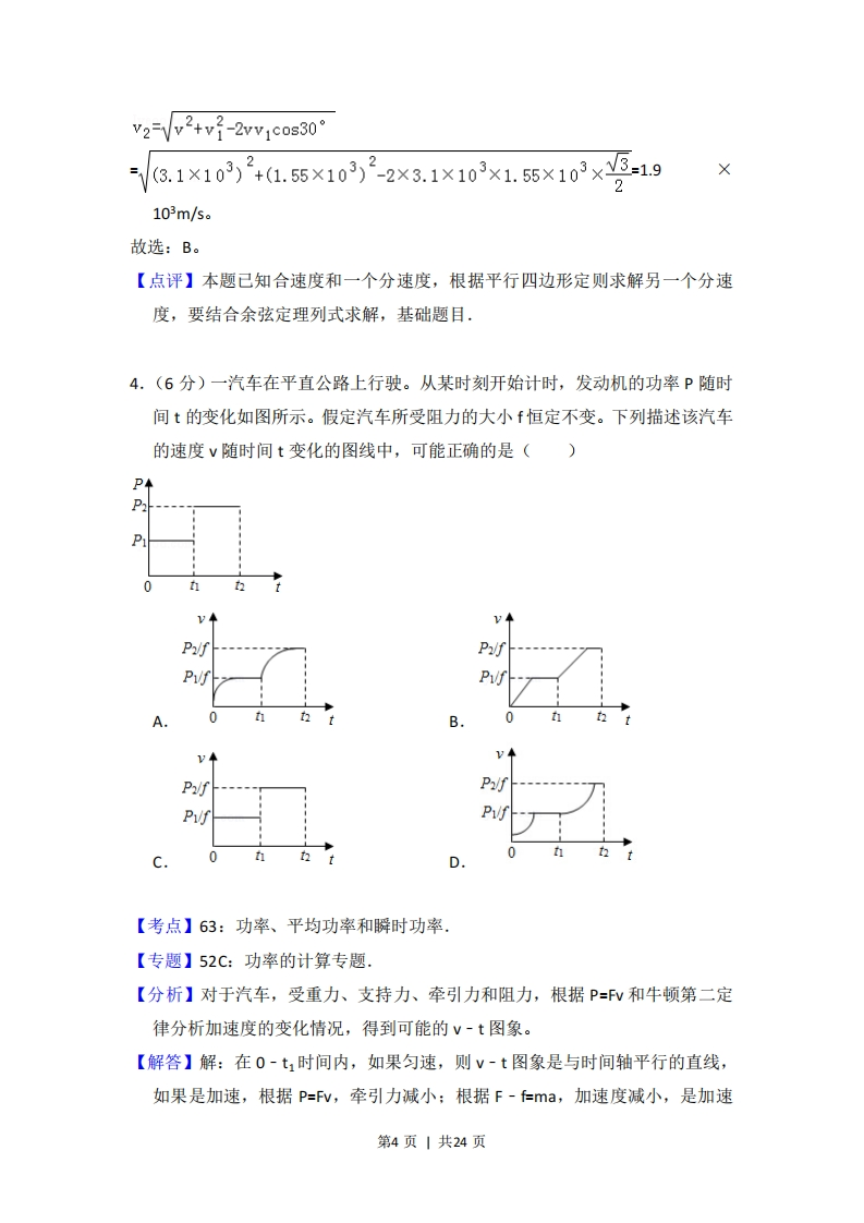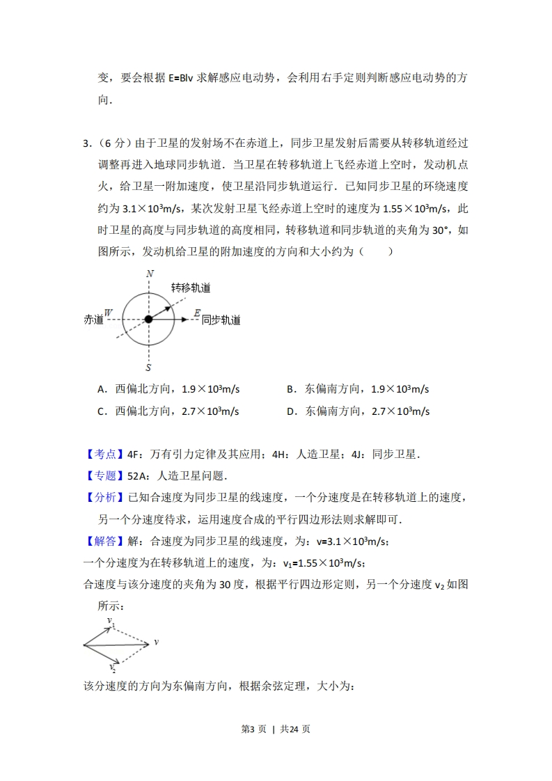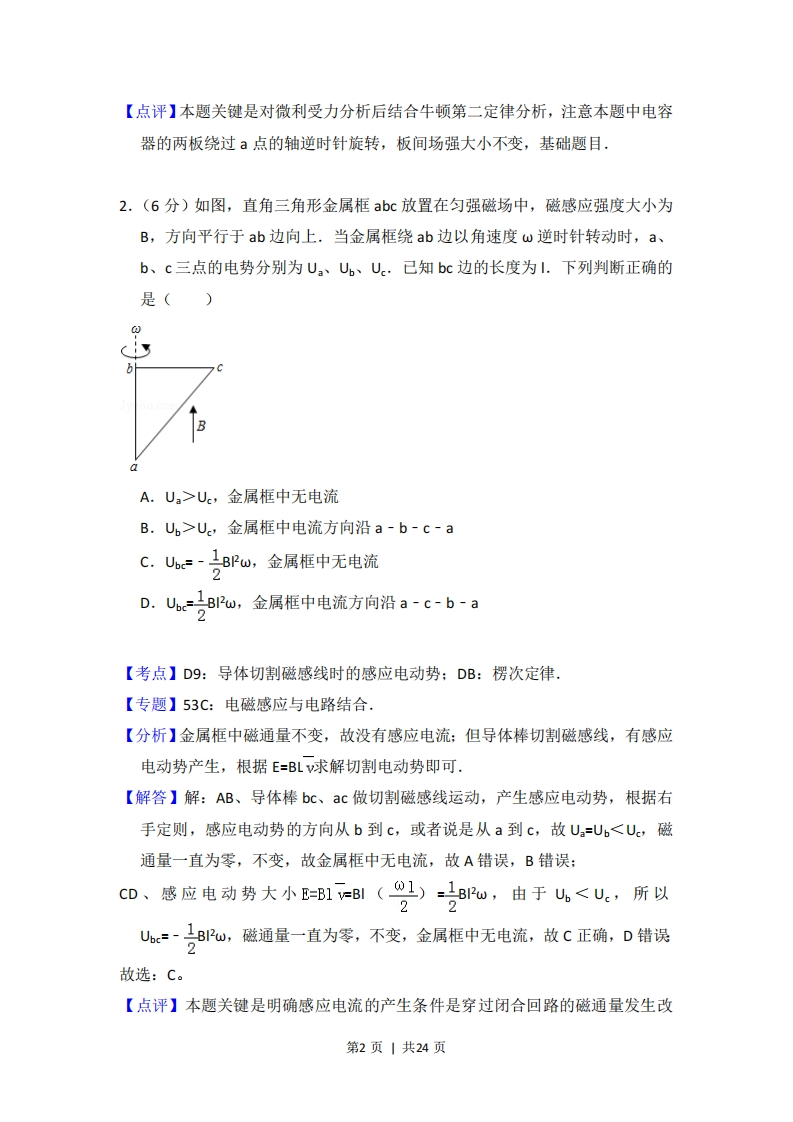 2015年全国统一高考物理试卷(新课标Ⅱ)事考答来与试想解析一、选择题本题共8小题,每小题6分.在每小题给出的四个选项中,第1~4题只有一项符合题目要求,第58题有多项符合题目要求.全部选对的得6分,选对但不全的得3分,有选错的得0分.1.(6分)如图,两平行的带电金属板水平放置。若在两板中间a点从静止释放一带电微粒,微粒恰好保持静止状态。现将两板绕过a点的轴(垂直于纸面)逆时针旋转45°,再由a点从静止释放一同样的微粒,该微粒将()。aA.保持静止状态B,向左上方做匀加速运动C.向正下方做匀加速运动D.向左下方做匀加速运动【考点】CM:带电粒子在混合场中的运动,【专题】537:带电粒子在复合场中的运动专题.【分析】开始时刻微粒保持静止,受重力和电场力而平衡:将两板绕过a点的轴(垂直于纸面)逆时针旋转45°,电容器带电量不变,间距不变,正对面积也不变,故电场强度的大小不变,电场力的大小不变,方向逆时针旋转45°,根据平行四边形定则求解出合力的方向,确定微粒的运动即可,【解答】解:在两板中间a点从静止释放一带电微粒,微粒恰好保持静止状态,微粒受重力和电场力平衡,故电场力大小F=mg,方向竖直向上:将两板绕过a点的轴(垂直于纸面)逆时针旋转45°,电场强度大小不变,方向逆时针旋转45°,故电场力逆时针旋转45°,大小仍然为mg:故重力和电场力的大小均为mg,方向夹角为135°,故合力向左下方,微粒的加速度恒定,向左下方做匀加速运动:故ABC错误,D正确:故选:D。第1页|共24页【点评】本题关键是对微利受力分析后结合牛顿第二定律分析,注意本题中电容器的两板绕过a点的轴逆时针旋转,板间场强大小不变,基础题目.2.(6分)如图,直角三角形金属框abc放置在匀强磁场中,磁感应强度大小为B,方向平行于ab边向上.当金属框绕ab边以角速度w逆时针转动时,a、b、c三点的电势分别为Ua、Ub、Uc·已知bc边的长度为I.下列判断正确的是()BA.Ua>Uc,金属框中无电流B.U,>U,金属框中电流方向沿a-b-c-aC.Ubc=-1BPw,金属框中无电流2D.Ubc=1BI2w,金属框中电流方向沿a-c-b-a2【考点】D9:导体切割磁感线时的感应电动势:DB:楞次定律.【专题】53C:电磁感应与电路结合,【分析】金属框中磁通量不变,故没有感应电流:但导体棒切割磁感线,有感应电动势产生,根据E=BL求解切割电动势即可.【解答】解:AB、导体棒bc、ac做切割磁感线运动,产生感应电动势,根据右手定则,感应电动势的方向从b到c,或者说是从a到c,故U=U