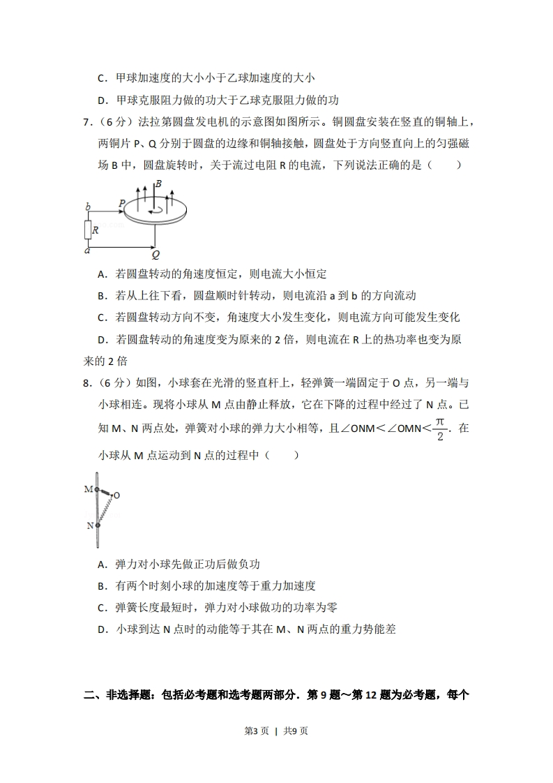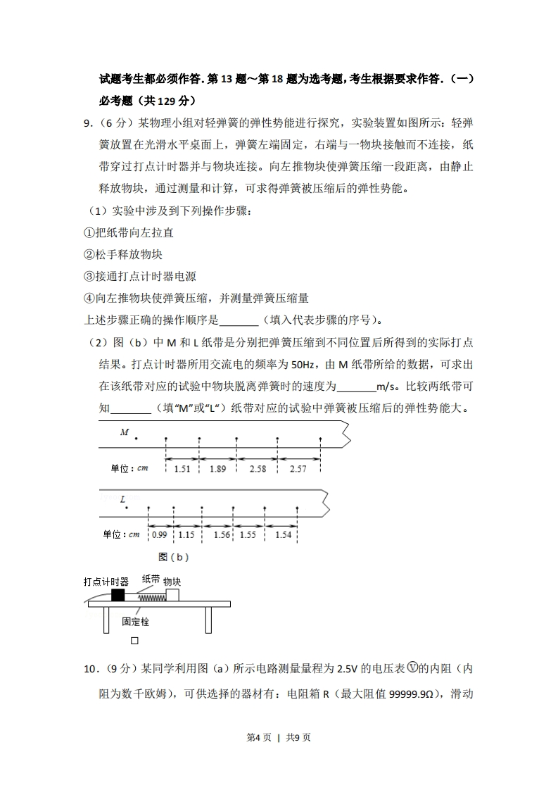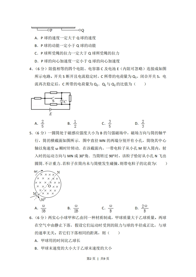 2016年全国统一高考物理试卷(新课标Ⅱ)一、选择题:本大题共8小题,每小题6分。在每小题给出的四个选项中,第1~5题只有一项是符合题目要求,第6~8题有多项符合题目要求。全部选对的得6分,选对但不全的得3分,有选错的得0分,1.(6分)质量为m的物体用轻绳AB悬挂于天花板上。用水平向左的力F缓慢拉动绳的中点O,如图所示。用T表示绳OA段拉力的大小,在O点向左移动的过程中()AF←OBA.F逐渐变大,T逐渐变大B.F逐渐变大,T逐渐变小C.F逐渐变小,T逐渐变大D.F逐渐变小,T逐渐变小2.(6分)如图,P为固定的点电荷,虚线是以P为圆心的两个圆.带电粒子Q在P的电场中运动.运动轨迹与两圆在同一平面内,a、b、c为轨迹上的三个点.若Q仅受P的电场力作用,其在a、b、c点的加速度大小分别为aa、ab、ac,速度大小分别为v、b、vc,则()A.aa>ab>ac,Va>Vc>VbB.aa>ab>ac,Vo>Ve>VaC.ab>ac>aa,Vo>Vc>VaD.ab>ac>aa,Va>Vc>Vb3.(6分)小球P和Q用不可伸长的轻绳悬挂在天花板上,P球的质量大于Q球的质量,悬挂P球的绳比悬挂Q球的绳短。将两球拉起,使两绳均被水平拉直,如图所示。将两球由静止释放。在各自轨迹的最低点,()第1页1共9页OPoQA.P球的速度一定大于Q球的速度B.P球的动能一定小于Q球的动能C.P球所受绳的拉力一定大于Q球所受绳的拉力D.P球的向心加速度一定小于Q球的向心加速度4,(6分)阻值相等的四个电阻、电容器C及电池E(内阻可忽略)连接成如图所示电路。开关S断开且电流稳定时,C所带的电荷量为Q1,闭合开关S,电流再次稳定后,C所带的电荷量为Q2.Q1与Q2的比值为()Ec司5.(6分)一圆筒处于磁感应强度大小为B的匀强磁场中,磁场方向与简的轴平行,简的横截面如图所示.图中直径MN的两端分别开有小孔,筒绕其中心轴以角速度ω顺时针转动.在该截面内,一带电粒子从小孔M射入简内,射入时的运动方向与MN成30°角.当筒转过90°时,该粒子恰好从小孔N飞出圆简.不计重力.若粒子在简内未与简壁发生碰撞,则带电粒子的比荷为()N×XXX】XXXX×××kXX××,0×××,"×XX30A3B82BC.B0.206.(6分)两实心小球甲和乙由同一种材质制成,甲球质量大于乙球质量。两球在空气中由静止下落,假设它们运动时受到的阻力与球的半径成正比,与球的速率无关。若它们下落相同的距离,则()A.甲球用的时间比乙球长B.甲球末速度的大小大于乙球末速度的大小第2页1共9页C.甲球加速度的大小小于乙球加速度的大小D,甲球克服阻力做的功大于乙球克服阻力做的功7,(6分)法拉第圆盘发电机的示意图如图所示。铜圆盘安装在竖直的铜轴上,两铜片P、Q分别于圆盘的边缘和铜轴接触,圆盘处于方向竖直向上的匀强磁场B中,圆盘旋转时,关于流过电阻R的电流,下列说法正确的是()A.若圆盘转动的角速度恒定,则电流大小恒定B.若从上往下看,圆盘顺时针转动,则电流沿a到b的方向流动C.若圆盘转动方向不变,角速度大小发生变化,则电流方向可能发生变化D.若圆盘转动的角速度变为原来的2倍,则电流在R上的热功率也变为原来的2倍8.(6分)如图,小球套在光滑的竖直杆上,轻弹簧一端固定于0点,另一端与小球相连。现将小球从M点由静止释放,它在下降的过程中经过了N点。已知M、N两点处,弹簧对小球的弹力大小相等,且∠ONM<∠OMN<受.在小球从M点运动到N点的过程中()A,弹力对小球先做正功后做负功B.有两个时刻小球的加速度等于重力加速度C,弹簧长度最短时,弹力对小球做功的功率为零D.小球到达N点时的动能等于其在M、N两点的重力势能差二、非选择题:包括必考题和选考题两部分.第9题~第12题为必考题,每个第3页1共9页