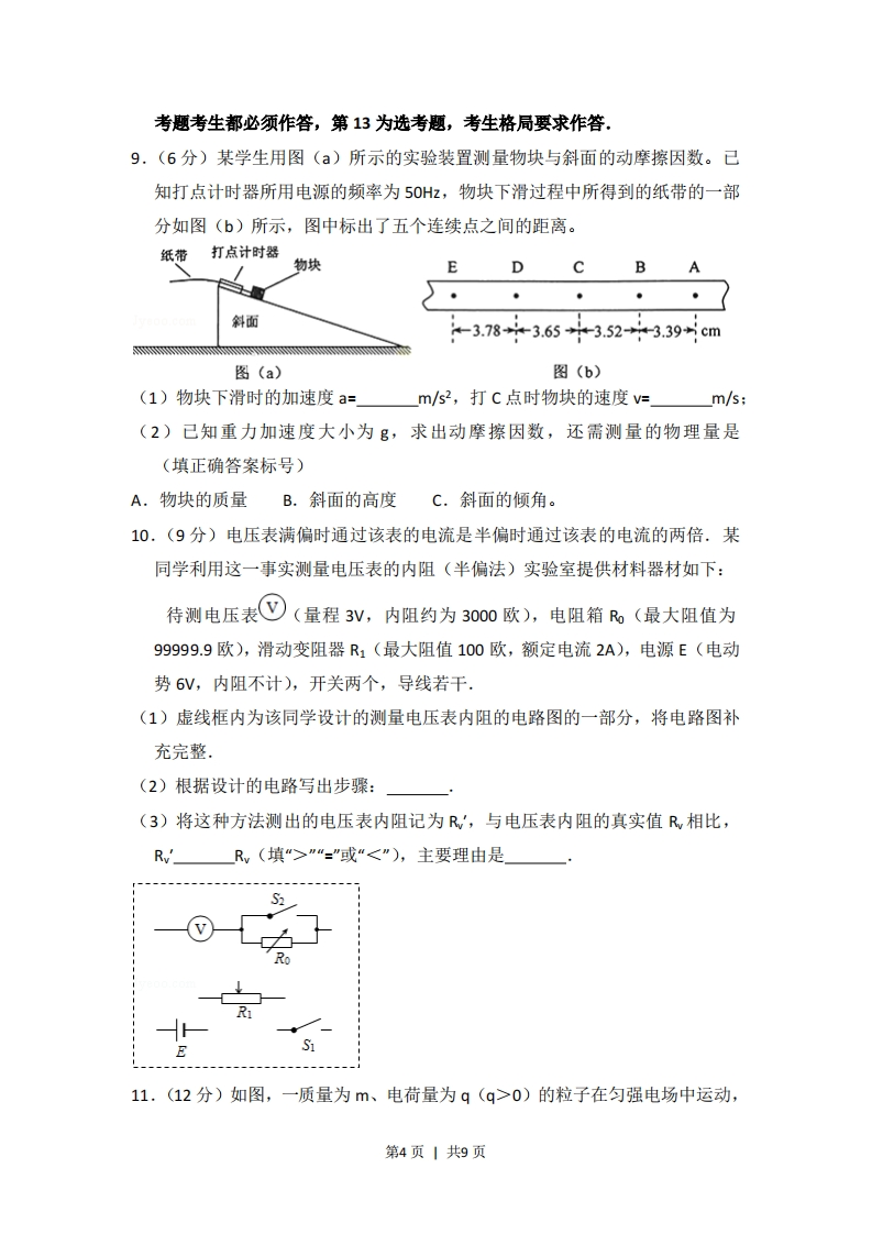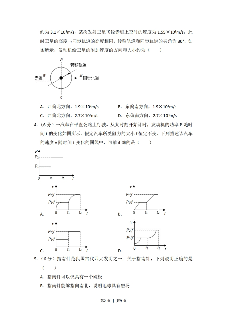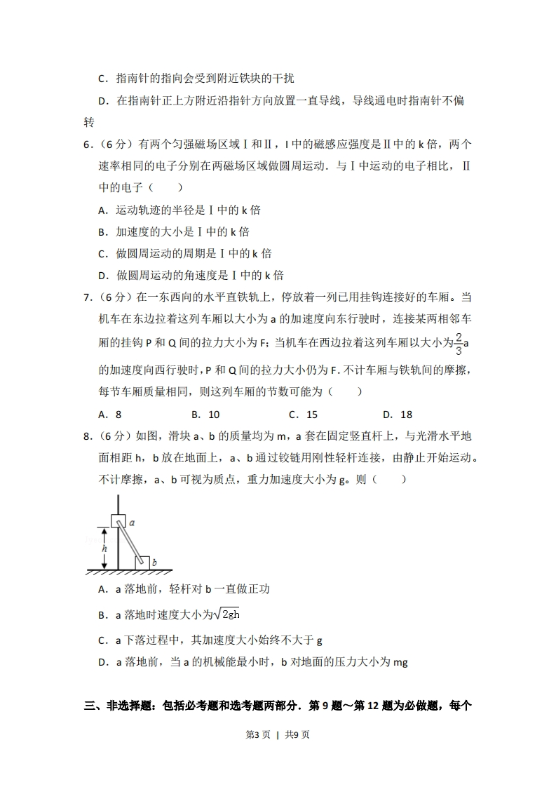 2015年全国统一高考物理试卷(新课标Ⅱ)一、选择题本题共8小题,每小题6分.在每小题给出的四个选项中,第1~4题只有一项符合题目要求,第5~8题有多项符合题目要求.全部选对的得6分,选对但不全的得3分,有选错的得0分,1.(6分)如图,两平行的带电金属板水平放置。若在两板中间a点从静止释放一带电微粒,微粒恰好保持静止状态。现将两板绕过a点的轴(垂直于纸面)逆时针旋转45°,再由a点从静止释放一同样的微粒,该微粒将()。aA.保持静止状态B.向左上方做匀加速运动C.向正下方做匀加速运动D,向左下方做匀加速运动2.(6分)如图,直角三角形金属框ac放置在匀强磁场中,磁感应强度大小为B,方向平行于ab边向上.当金属框绕ab边以角速度w逆时针转动时,a、b、c三点的电势分别为Ua、Ub、Uc.已知bc边的长度为1.下列判断正确的是()BA.Ua>Uc,金属框中无电流B.Ub>Uc,金属框中电流方向沿a-b-c-aC.Uh-8Pw,金属框中无电流D.Unc号Bw,金属框中电流方向沿a-c-b-a3.(6分)由于卫星的发射场不在赤道上,同步卫星发射后需要从转移轨道经过调整再进入地球同步轨道.当卫星在转移轨道上飞经赤道上空时,发动机点火,给卫星一附加速度,使卫星沿同步轨道运行.已知同步卫星的环绕速度第1页1共9页约为3.1×10m/5,某次发射卫星飞经赤道上空时的速度为1.55×10m/5,此时卫星的高度与同步轨道的高度相同,转移轨道和同步轨道的夹角为30°,如图所示,发动机给卫星的附加速度的方向和大小约为()N转移轨道赤道严E+二同步轨道A.西偏北方向,1.9×103m/sB.东偏南方向,1.9×10m/sC.西偏北方向,2.7×10m/sD.东偏南方向,2.7×10m/s4.(6分)一汽车在平直公路上行驶。从某时刻开始计时,发动机的功率P随时间t的变化如图所示。假定汽车所受阻力的大小f恒定不变。下列描述该汽车的速度ν随时间t变化的图线中,可能正确的是()PAB.PufP00CD5,(6分)指南针是我国古代四大发明之一.关于指南针,下列说明正确的是()A.指南针可以仅具有一个磁极B.指南针能够指向南北,说明地球具有磁场第2页1共9页C.指南针的指向会受到附近铁块的干扰D.在指南针正上方附近沿指针方向放置一直导线,导线通电时指南针不偏转6.(6分)有两个匀强磁场区域I和Ⅱ,1中的磁感应强度是Ⅱ中的k倍,两个速率相同的电子分别在两磁场区域做圆周运动.与I中运动的电子相比,Ⅱ中的电子()A.运动轨迹的半径是I中的k倍B.加速度的大小是I中的k倍C.做圆周运动的周期是I中的k倍D.做圆周运动的角速度是I中的k倍7.(6分)在一东西向的水平直铁轨上,停放着一列已用挂钩连接好的车厢。当机车在东边拉着这列车厢以大小为a的加速度向东行驶时,连接某两相邻车厢的挂钩P和Q间的拉力大小为,当机车在西边拉着这列车厢以大小为号的加速度向西行驶时,P和Q间的拉力大小仍为「.不计车厢与铁轨间的摩擦,每节车厢质量相同,则这列车厢的节数可能为()A.8B.10C.15D.188.(6分)如图,滑块a、b的质量均为m,a套在固定竖直杆上,与光滑水平地面相距h,b放在地面上,a、b通过铰链用刚性轻杆连接,由静止开始运动。不计摩擦,a、b可视为质点,重力加速度大小为g。则()A.a落地前,轻杆对b一直做正功B.a落地时速度大小为√2ghC.a下落过程中,其加速度大小始终不大于gD.a落地前,当a的机械能最小时,b对地面的压力大小为mg三、非选择题:包括必考题和选考题两部分.第9题~第12题为必做题,每个第3页1共9页