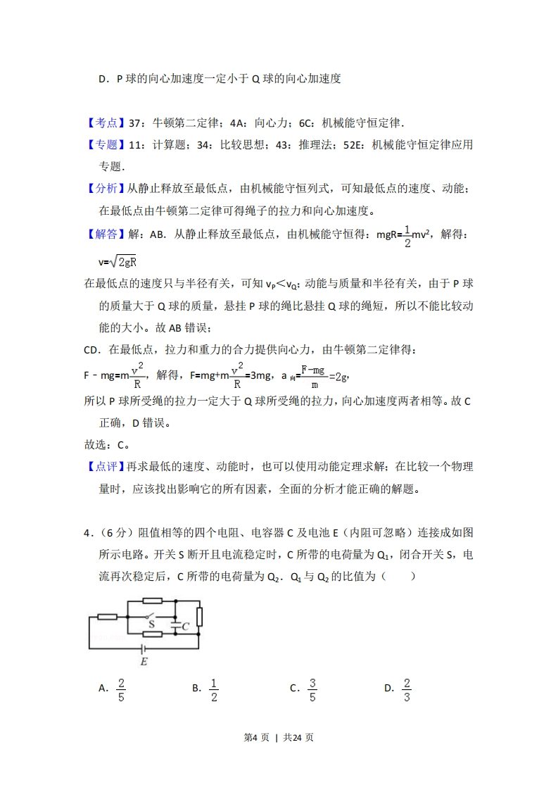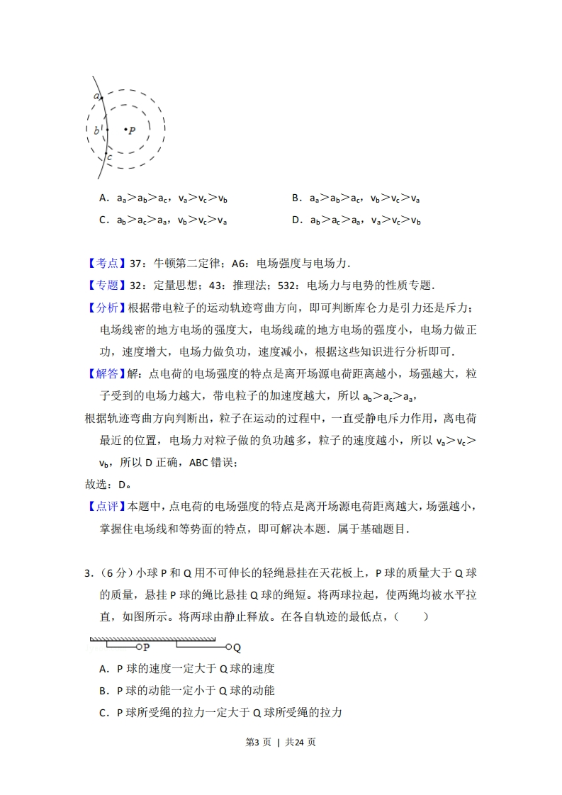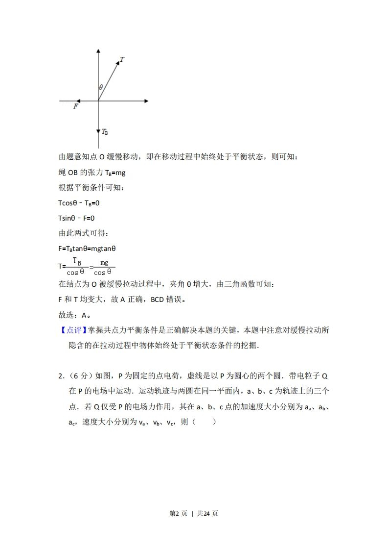 2016年全国统一高考物理试卷(新课标Ⅱ)事考答案与试题佩析一、选释题:本大题共8小题,每小题6分,在每小题给出的四个选项中,第1~5题只有一项是符合题目要求,第6~8题有多项符合题目要求.全部选对的得6分,选对但不全的得3分.有选错的得0分.1.(6分)质量为m的物体用轻绳AB悬挂于天花板上。用水平向左的力F缓慢拉动绳的中点O,如图所示。用T表示绳OA段拉力的大小,在O点向左移动的过程中()BA.F逐渐变大,T逐渐变大B.F逐渐变大,T逐渐变小C.F逐渐变小,T逐渐变大D.F逐渐变小,T逐渐变小【考点】2G:力的合成与分解的运用:3C:共点力的平衡.【专题】11:计算题:12:应用题:31:定性思想:49:合成分解法:527:共点力作用下物体平衡专题.【分析】本题关键是抓住悬挂物B的重力不变,即OB段绳中张力恒定,O点缓慢移动时,点O始终处于平衡状态,根据平衡条件列式求解各力变化情况,【解答】解:以结点O为研究对象受力分析如下图所示:第1页1共24页中T由题意知点O缓慢移动,即在移动过程中始终处于平衡状态,则可知:绳OB的张力T=mg根据平衡条件可知:Tcose-TB=0Tsine-F=0由此两式可得:F=Tatane=mgtaneT=Tamgcos ecos在结点为O被缓慢拉动过程中,夹角日增大,由三角函数可知:F和T均变大,故A正确,BCD错误。故选:A。【点评】掌握共点力平衡条件是正确解决本题的关键,本题中注意对缓慢拉动所隐含的在拉动过程中物体始终处于平衡状态条件的挖掘:2.(6分)如图,P为固定的点电荷,虚线是以P为圆心的两个圆.带电粒子Q在P的电场中运动.运动轨迹与两圆在同一平面内,a、b、c为轨迹上的三个点.若Q仅受P的电场力作用,其在a、b、c点的加速度大小分别为aa、ab、ac,速度大小分别为va、b、vc,则()第2页|共24页A.aa>ab>ac,Va>Vc>VbB.aa>ab>ac,Vo>Vc>VaC.ab>ac>aa,Vo>Vc>VaD.ab>ac>aa,Va>Vc>Vb【考点】37:牛顿第二定律:A6:电场强度与电场力.【专题】32:定量思想;43:推理法:532:电场力与电势的性质专题.【分析】根据带电粒子的运动轨迹弯曲方向,即可判断库仑力是引力还是斥力:电场线密的地方电场的强度大,电场线疏的地方电场的强度小,电场力做正功,速度增大,电场力做负功,速度减小,根据这些知识进行分析即可·【解答】解:点电荷的电场强度的特点是离开场源电荷距离越小,场强越大,粒子受到的电场力越大,带电粒子的加速度越大,所以a,>ac>aa'根据轨迹弯曲方向判断出,粒子在运动的过程中,一直受静电斥力作用,离电荷最近的位置,电场力对粒子做的负功越多,粒子的速度越小,所以a>V>b,所以D正确,ABC错误:故选:D。【点评】本题中,点电荷的电场强度的特点是离开场源电荷距离越大,场强越小,掌握住电场线和等势面的特点,即可解决本题.属于基础题目.3,(6分)小球P和Q用不可伸长的轻绳悬挂在天花板上,P球的质量大于Q球的质量,悬挂P球的绳比悬挂Q球的绳短。将两球拉起,使两绳均被水平拉直,如图所示。将两球由静止释放。在各自轨迹的最低点,()-OP-oQA.P球的速度一定大于Q球的速度B.P球的动能一定小于Q球的动能C.P球所受绳的拉力一定大于Q球所受绳的拉力第3页|共24页