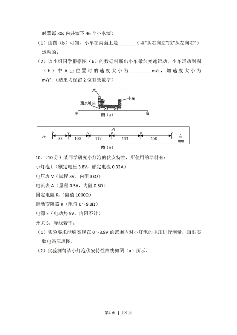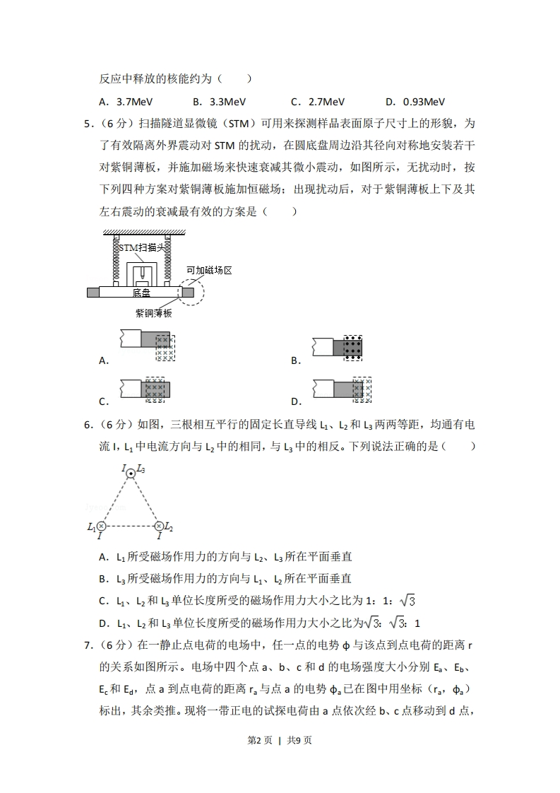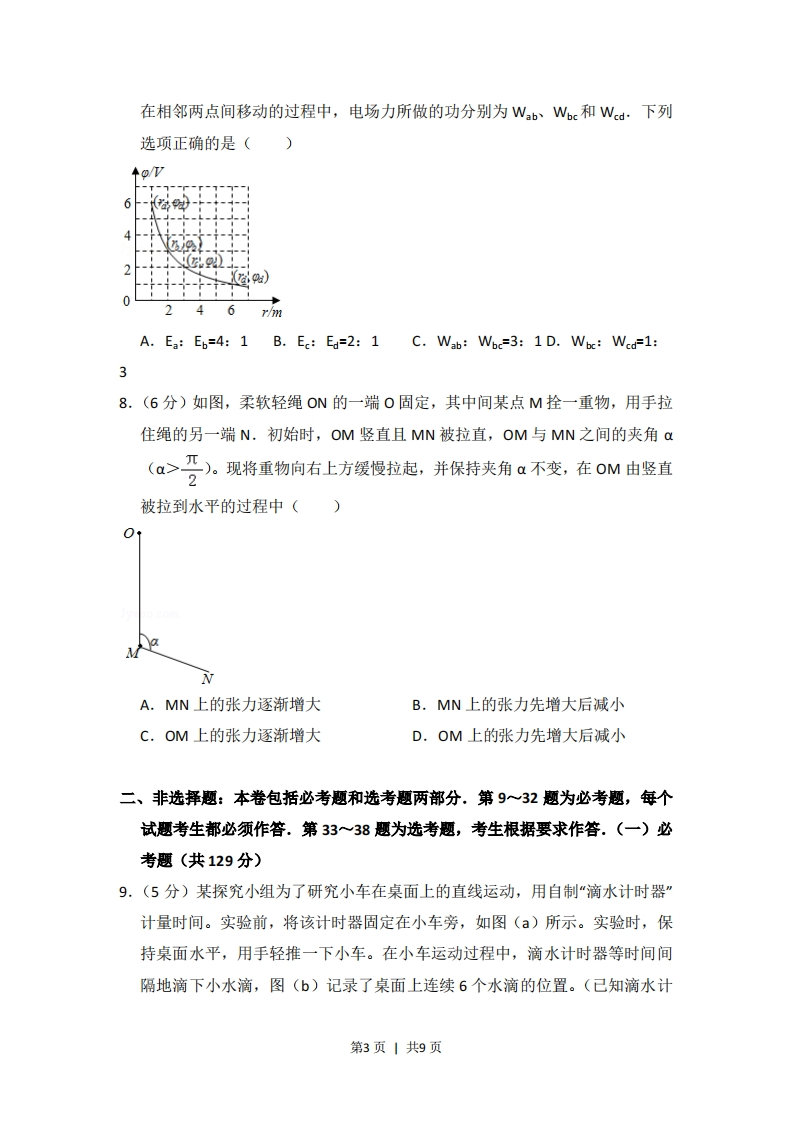 2017年全国统一高考物理试卷(新课标I)一、选择题:本大题共8小题,每小题6分。在每小题给出的四个选项中,第1~5题只有一项是符合题目要求,第6~8题有多项符合题目要求。全部选对的得6分,选对但不全的得3分。有选错的得0分,1.6分)将质量为1.00kg的模型火箭点火升空,50g燃烧的燃气以大小为600m/s的速度从火箭喷口在很短时间内喷出。在燃气喷出后的瞬间,火箭的动量大小为(喷出过程中重力和空气阻力可忽略)()A.30kg.m/sB.5.7×102kgm/sC.6.0X102kg.m/sD.6.3×102kgm/s2.(6分)发球机从同一高度向正前方依次水平射出两个速度不同的乒乓球(忽略空气的影响)。速度较大的球越过球网,速度较小的球没有越过球网:其原因是()A.速度较小的球下降相同距离所用的时间较多B.速度较小的球在下降相同距离时在竖直方向上的速度较大C.速度较大的球通过同一水平距离所用的时间较少D.速度较大的球在相同时间间隔内下降的距离较大3.(6分)如图,空间某区域存在匀强电场和匀强磁场,电场方向竖直向上(与纸面平行),磁场方向垂直于纸面向里。三个带正电的微粒a,b,c电荷量相等,质量分别为m,m。,mc·已知在该区域内,a在纸面内做匀速圆周运动,b在纸面内向右做匀速直线运动,c在纸面内向左做匀速直线运动。下列选项正确的是()左×X+×右×××××A.ma>mp>mc B.mp>ma>me C.me>ma>mo D.m>mo>ma4.(6分)大科学工程“人造太阳”主要是将氘核聚变反应释放的能量用来发电,氘核聚变反应方程是:2H+2H→He+n,已知H的质量为2.0136u,He的质量为3.0150u,n的质量为1.0087u,1u=931MeV/c2.氘核聚变第1页1共9页反应中释放的核能约为()A.3.7MeVB.3.3MeVC.2.7MeVD.0.93MeV5,(6分)扫描隧道显微镜(STM)可用来探测样品表面原子尺寸上的形貌,为了有效隔离外界震动对STM的扰动,在圆底盘周边沿其径向对称地安装若干对紫铜薄板,并施加磁场来快速衰减其微小震动,如图所示,无扰动时,按下列四种方案对紫铜薄板施加恒磁场:出现扰动后,对于紫铜薄板上下及其左右震动的衰减最有效的方案是()iiiiiiiiiiiiiitiieeittiTM扫描头可加磁场区底盘紫铜薄板◆i×××¥¥¥区名D6,(6分)如图,三根相互平行的固定长直导线L1、L2和L3两两等距,均通有电流,L1中电流方向与L2中的相同,与L3中的相反。下列说法正确的是()A.L1所受磁场作用力的方向与L2、L3所在平面垂直B.L3所受磁场作用力的方向与L1、L2所在平面垂直C.L1、L2和单位长度所受的磁场作用力大小之比为1:1:√3D.L1、L2和L3单位长度所受的磁场作用力大小之比为V3:√3:17.(6分)在一静止点电荷的电场中,任一点的电势中与该点到点电荷的距离的关系如图所示。电场中四个点a、b、c和d的电场强度大小分别Ea、Eb、E:和Ea,点a到点电荷的距离ra与点a的电势中已在图中用坐标(ra,中)标出,其余类推。现将一带正电的试探电荷由a点依次经b、c点移动到d点,第2页1共9页在相邻两点间移动的过程中,电场力所做的功分别为Wab、Wc和W·下列选项正确的是()↑o/p64.12@%)6A.Ea:Ep=4:1 B.Ec:Ed=2:1 C.Wab:Wpe=3:1D.Wbe:Wcd=1:38.(6分)如图,柔软轻绳ON的一端O固定,其中间某点M拴一重物,用手拉住绳的另一端N.初始时,OM竖直且MN被拉直,OM与MN之间的夹角a(a>兀)。现将重物向右上方缓慢拉起,并保持夹角α不变,在OM由竖直被拉到水平的过程中()A.MN上的张力逐渐增大B.MN上的张力先增大后减小C.OM上的张力逐渐增大D.OM上的张力先增大后减小二、非选择题:本卷包括必考题和选考题两部分,第9~32题为必考题,每个试题考生都必须作答.第33~38题为选考题,考生根据要求作答.(一)必考题(共129分)9.(5分)某探究小组为了研究小车在桌面上的直线运动,用自制“滴水计时器”计量时间。实验前,将该计时器固定在小车旁,如图(a)所示。实验时,保持桌面水平,用手轻推一下小车。在小车运动过程中,滴水计时器等时间间隔地滴下小水滴,图(b)记录了桌面上连续6个水滴的位置。(已知滴水计第3页1共9页