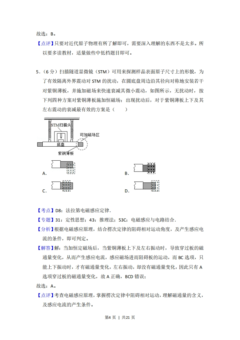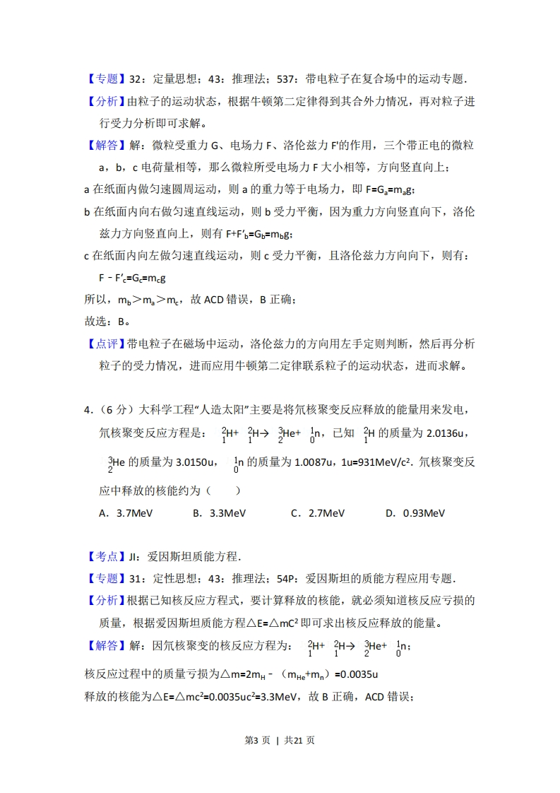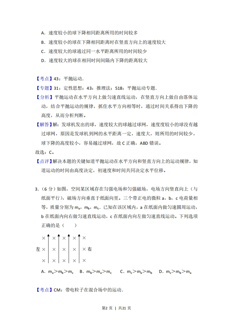 2017年全国统一高考物理试卷(新课标I)事考答来与试想解析一、选择题:本大题共8小题,每小题6分。在每小题给出的四个选项中,第1~5题只有一项是符合题目要求,第6~8题有多项符合题目要求.全部选对的得6分,选对但不全的得3分.有选错的得0分,1.6分)将质量为1.00kg的模型火箭点火升空,50g燃烧的燃气以大小为600m/s的速度从火箭喷口在很短时间内喷出。在燃气喷出后的瞬间,火箭的动量大小为(喷出过程中重力和空气阻力可忽略)()A.30kg◆m/sB.5.7X102kg.m/sC.6.0×102kgm/5D.6.3X102kgm/5【考点】53:动量守恒定律.【专题】32:定量思想:43:推理法:52K:动量与动能定理或能的转化与守恒定律综合】【分析】在喷气的很短时间内,火箭和燃气组成的系统动量守恒,结合动量守恒定律求出燃气喷出后的瞬间火箭的动量大小。【解答】解:开始总动量为零,规定气体喷出的方向为正方向,根据动量守恒定律得,0=mVtP,解得火箭的动量P=-m1v1=-0.05X600kgm/s=-30kgm/s,负号表示方向,故A正确,B、C、D错误。故选:A。【点评】本题考查了动量守恒定律的基本运用,知道喷出燃气的动量和火箭的动量大小相等,方向相反,基础题。2.(6分)发球机从同一高度向正前方依次水平射出两个速度不同的乒乓球(忽略空气的影响)。速度较大的球越过球网,速度较小的球没有越过球网:其原因是()第1页|共21页A.速度较小的球下降相同距离所用的时间较多B.速度较小的球在下降相同距离时在竖直方向上的速度较大C.速度较大的球通过同一水平距离所用的时间较少D.速度较大的球在相同时间间隔内下降的距离较大【考点】43:平抛运动.【专题】31:定性思想:43:推理法:518:平抛运动专题【分析】平抛运动在水平方向上做匀速直线运动,在竖直方向上做自由落体运动,结合平抛运动的规律,抓住水平方向相等时,通过时间关系得出下降的高度,从而分析判断。【解答】解:发球机发出的球,速度较大的球越过球网,速度度较小的球没有越过球网,原因是发球机到网的水平距离一定,速度大,则所用的时间较少,球下降的高度较小,容易越过球网,故C正确,ABD错误。故选:C。【点评】解决本题的关键知道平抛运动在水平方向和竖直方向上的运动规律,知道运动的时间由高度决定,初速度和时间共同决定水平位移。3.(6分)如图,空间某区域存在匀强电场和匀强磁场,电场方向竖直向上(与纸面平行),磁场方向垂直于纸面向里。三个带正电的微粒a,b,c电荷量相等,质量分别为ma,mb,mc·已知在该区域内,a在纸面内做匀速圆周运动,b在纸面内向右做匀速直线运动,c在纸面内向左做匀速直线运动。下列选项正确的是()×↑×↑×↑×↑×左×XX×右×××××A.ma>mp>me B.mp>ma>me C.me>ma>mo D.m>mo>ma【考点】CM:带电粒子在混合场中的运动.第2页|共21页【专题】32:定量思想:43:推理法:537:带电粒子在复合场中的运动专题.【分析】由粒子的运动状态,根据牛顿第二定律得到其合外力情况,再对粒子进行受力分析即可求解。【解答】解:微粒受重力G、电场力F、洛伦兹力的作用,三个带正电的微粒a,b,c电荷量相等,那么微粒所受电场力F大小相等,方向竖直向上:a在纸面内做匀速圆周运动,则a的重力等于电场力,即F=G=mg:b在纸面内向右做匀速直线运动,则b受力平衡,因为重力方向竖直向下,洛伦兹力方向竖直向上,则有F+F'b=Gb=mbg:c在纸面内向左做匀速直线运动,则c受力平衡,且洛伦兹力方向向下,则有:F-F'c=Gc=mcg所以,mb>m>m,故ACD错误,B正确:故选:B。【点评】带电粒子在磁场中运动,洛伦兹力的方向用左手定则判断,然后再分析粒子的受力情况,进而应用牛顿第二定律联系粒子的运动状态,进而求解。4.(6分)大科学工程“人造太阳”主要是将氘核聚变反应释放的能量用来发电,氘核聚变反应方程是:H+H→He+n,已知H的质量为2.0136u,He的质量为3.0150u,1n的质量为1.0087u,1u=931MeV/c2.氘核聚变反应中释放的核能约为()A.3.7MeVB.3.3MeVC.2.7MeVD.0.93MeV【考点】:爱因斯坦质能方程,【专题】31:定性思想:43:推理法:54P:爱因斯坦的质能方程应用专题【分析】根据已知核反应方程式,要计算释放的核能,就必须知道核反应亏损的质量,根据爱因斯坦质能方程△E=△c2即可求出核反应释放的能量。【解答】解:因氘核聚变的核反应方程为:H+H→He+n:核反应过程中的质量亏损为△m=2m4-(mHe+mn)=0.0035u释放的核能为△E=△mc2=0.0035uc2=3.3MeV,故B正确,ACD错误:第3页|共21页