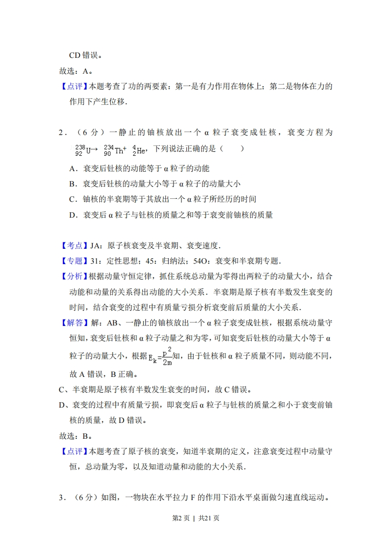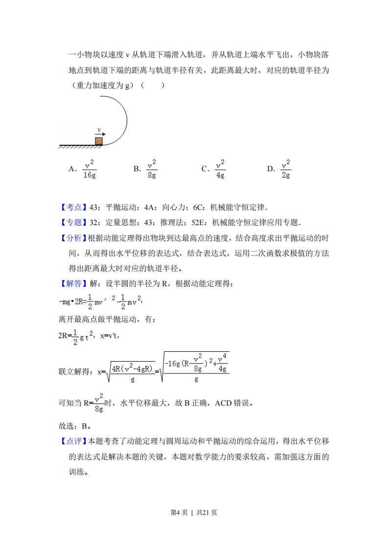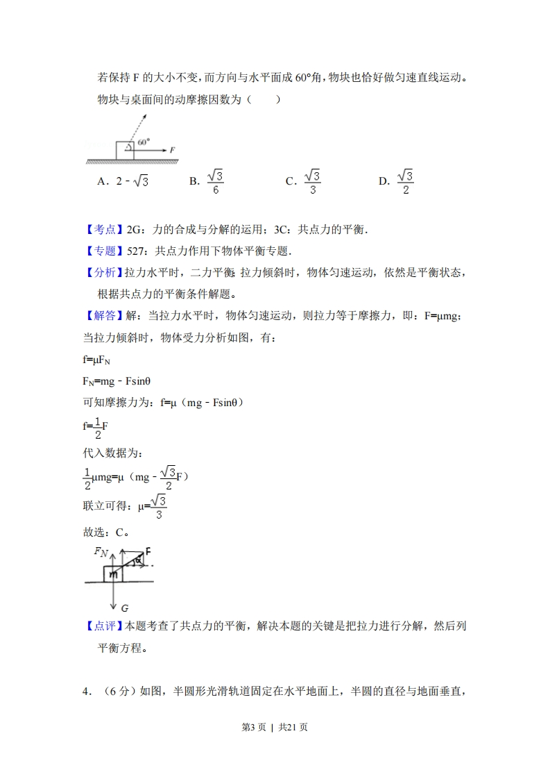 2017年全国统一高考物理试卷(新课标Ⅲ)事考答来与试想解析一、选择题:本大题共8小题,每小题6分.在每小题给出的四个选项中,第1~5题只有一项是符合题目要求,第6~8题有多项符合题目要求.全部选对的得6分,选对但不全的得3分.有选错的得0分.1.(6分)如图,一光滑大圆环固定在桌面上,环面位于竖直平面内,在大圆环上套着一个小环,小环由大圆环的最高点从静止开始下滑,在小环下滑的过程中,大圆环对它的作用力()777777Z77777777777777元A,一直不做功B.一直做正功C.始终指向大圆环圆心D.始终背离大圆环圆心【考点】62:功的计算【专题】31:定性思想:43:推理法:52B:功的计算专题,【分析】小环在运动过程中,大环是固定在桌面上的,大环没有动,大环对小环的作用力垂直于小环的运动方向,根据功的定义分析做功情况【解答】解:AB、大圆环是光滑的,则小环和大环之间没有摩擦力:大环对小环的支持力总是垂直于小环的速度方向,所以大环对小环没有做功,故A正确,B错误:CD、小环在刚刚开始运动时,在大环的接近顶部运动时,大环对小环的支持力背离大环圆心,小环运动到大环的下半部分时,支持力指向大环的圆心,故第1页|共21页CD错误。故选:A。【点评】本题考查了功的两要素:第一是有力作用在物体上:第二是物体在力的作用下产生位移.2.(6分)一静止的铀核放出一个粒子衰变成钍核,衰变方程为经U8Th*He·下列说法正确的是()A.衰变后钍核的动能等于α粒子的动能B,衰变后钍核的动量大小等于α粒子的动量大小C.轴核的半衰期等于其放出一个α粒子所经历的时间D.衰变后α粒子与钍核的质量之和等于衰变前铀核的质量【考点】JA:原子核衰变及半衰期、衰变速度,【专题】31:定性思想:45:归纳法:540:衰变和半衰期专题.【分析】根据动量守恒定律,抓住系统总动量为零得出两粒子的动量大小,结合动能和动量的关系得出动能的大小关系.半衰期是原子核有半数发生衰变的时间,结合衰变的过程中有质量亏损分析衰变前后质量的大小关系,【解答】解:AB、一静止的铀核放出一个α粒子衰变成钍核,根据系统动量守恒知,衰变后钍核和粒子动量之和为零,可知衰变后钍核的动量大小等于粒子的动量大小,根据。知,由于钍核和α粒子质量不同,则动能不同,故A错误,B正确。C、半衰期是原子核有半数发生衰变的时间,故C错误。D、衰变的过程中有质量亏损,即衰变后α粒子与钍核的质量之和小于衰变前轴核的质量,故D错误。故选:B。【点评】本题考查了原子核的衰变,知道半衰期的定义,注意衰变过程中动量守恒,总动量为零,以及知道动量和动能的大小关系.3.(6分)如图,一物块在水平拉力F的作用下沿水平桌面做匀速直线运动。第2页|共21页若保持F的大小不变,而方向与水平面成60°角,物块也恰好做匀速直线运动。物块与桌面间的动摩擦因数为()FA.2-V3B.3c.3D.632【考点】2G:力的合成与分解的运用:3C:共点力的平衡.【专题】527:共点力作用下物体平衡专题【分析】拉力水平时,二力平衡拉力倾斜时,物体匀速运动,依然是平衡状态,根据共点力的平衡条件解题。【解答】解:当拉力水平时,物体匀速运动,则拉力等于摩擦力,即:F=μmg当拉力倾斜时,物体受力分析如图,有:f=uFNFN=mg-Fsine可知摩擦力为:f=μ(mg-Fsine)受代入数据为:umg=μ(mg-3F)2联立可得:μ因3故选:C。FN网【点评】本题考查了共点力的平衡,解决本题的关键是把拉力进行分解,然后列平衡方程。4.(6分)如图,半圆形光滑轨道固定在水平地面上,半圆的直径与地面垂直,第3页|共21页