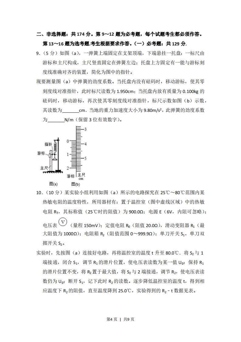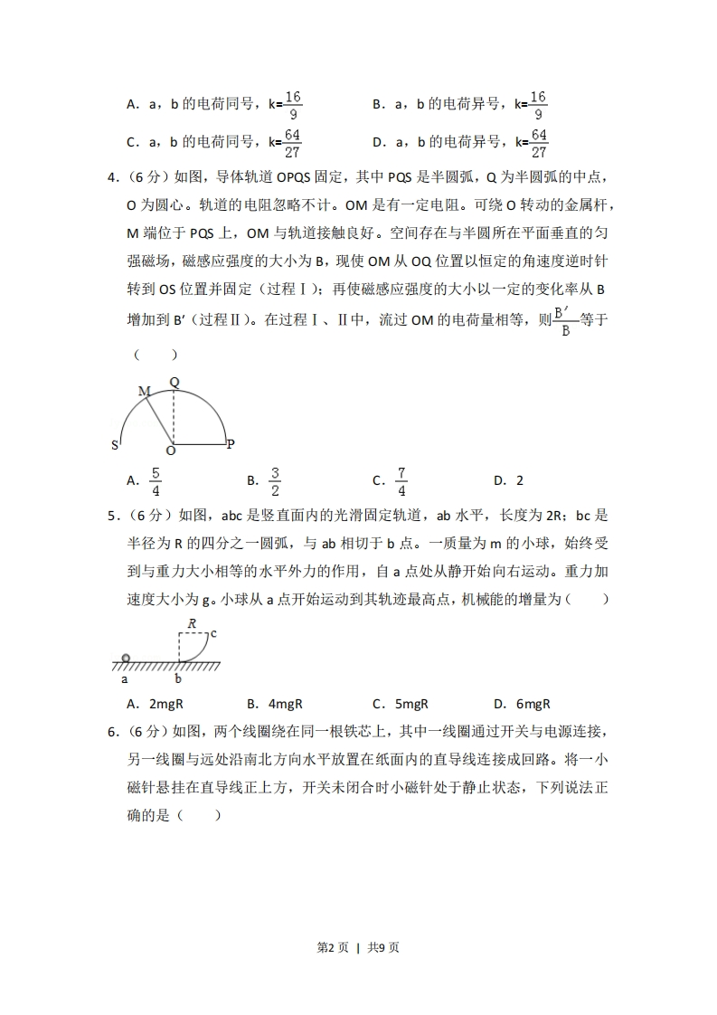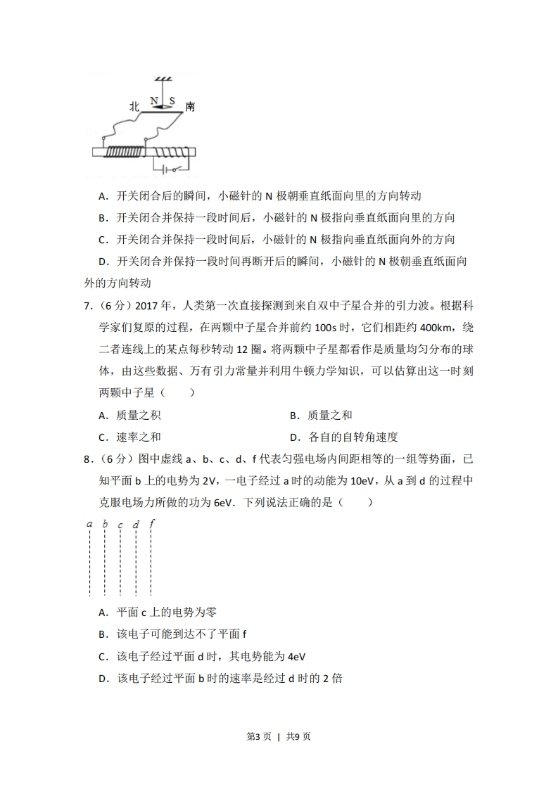 2018年全国统一高考物理试卷(新课标I)一、选择题本题共8小题,每小题6分,共48分.在每小题给出的四个选项中,第1~5题只有一顶符合题目要求,第6~8题有多项符合题目要求全部选对的得6分,选对但不全的得3分,有选错的得0分,1.(6分)高铁列车在启动阶段的运动可看作初速度为零的匀加速直线运动,在启动阶段,列车的动能()A.与它所经历的时间成正比B.与它的位移成正比C.与它的速度成正比D.与它的动量成正比2,(6分)如图,轻弹簧的下端固定在水平桌面上,上端放有物块P,系统处于静止状态,现用一竖直向上的力F作用在P上,使其向上做匀加速直线运动,以x表示P离开静止位置的位移,在弹簧恢复原长前,下列表示「和x之间关系的图象可能正确的是()3.(6分)如图,三个固定的带电小球a,b和c,相互间的距离分别为ab=5cm,bc=3cm,ca=4cm,小球c所受库仑力的合力的方向平行于a,b的连线,设小球a,b所带电荷量的比值的绝对值为k,则()第1页1共9页A.a,b的电荷同号,k=16B.a,b的电荷异号,k=16C.ab的电荷同号,k:号D.a,b的电荷异号,k=274.(6分)如图,导体轨道OPQ5固定,其中PQS是半圆弧,Q为半圆弧的中点,0为圆心。轨道的电阻忽略不计。OM是有一定电阻。可绕O转动的金属杆,M端位于PQS上,OM与轨道接触良好。空间存在与半圆所在平面垂直的匀强磁场,磁感应强度的大小为B,现使OM从OQ位置以恒定的角速度逆时针转到OS位置并固定(过程I):再使磁感应强度的大小以一定的变化率从B增加到B(过程Ⅱ)。在过程I、Ⅱ中,流过OM的电荷量相等,则B等于B0A.5c日D.25,(6分)如图,abc是竖直面内的光滑固定轨道,ab水平,长度为2R:bc是半径为R的四分之一圆弧,与b相切于b点。一质量为m的小球,始终受到与重力大小相等的水平外力的作用,自点处从静开始向右运动。重力加速度大小为g。小球从a点开始运动到其轨迹最高点,机械能的增量为()rmninmnabA.2mgRB.4mgRC.5mgRD.6mgR6.(6分)如图,两个线圈绕在同一根铁芯上,其中一线圈通过开关与电源连接,另一线圈与远处沿南北方向水平放置在纸面内的直导线连接成回路。将一小磁针悬挂在直导线正上方,开关未闭合时小磁针处于静止状态,下列说法正确的是()第2页1共9页北A.开关闭合后的瞬间,小磁针的N极朝垂直纸面向里的方向转动B.开关闭合并保持一段时间后,小磁针的N极指向垂直纸面向里的方向C.开关闭合并保持一段时间后,小磁针的N极指向垂直纸面向外的方向D.开关闭合并保持一段时间再断开后的瞬间,小磁针的N极朝垂直纸面向外的方向转动7.(6分)2017年,人类第一次直接探测到来自双中子星合并的引力波。根据科学家们复原的过程,在两颗中子星合并前约100s时,它们相距约400km,绕二者连线上的某点每秒转动12圈。将两颗中子星都看作是质量均匀分布的球体,由这些数据、万有引力常量并利用牛顿力学知识,可以估算出这一时刻两颗中子星()A.质量之积B.质量之和C.速率之和D.各自的自转角速度8.(6分)图中虚线a、b、c、d、f代表匀强电场内间距相等的一组等势面,已知平面b上的电势为2V,一电子经过a时的动能为10eV,从a到d的过程中克服电场力所做的功为6eV.下列说法正确的是()dA.平面c上的电势为零B.该电子可能到达不了平面fC.该电子经过平面d时,其电势能为4eVD.该电子经过平面b时的速率是经过d时的2倍第3页1共9页