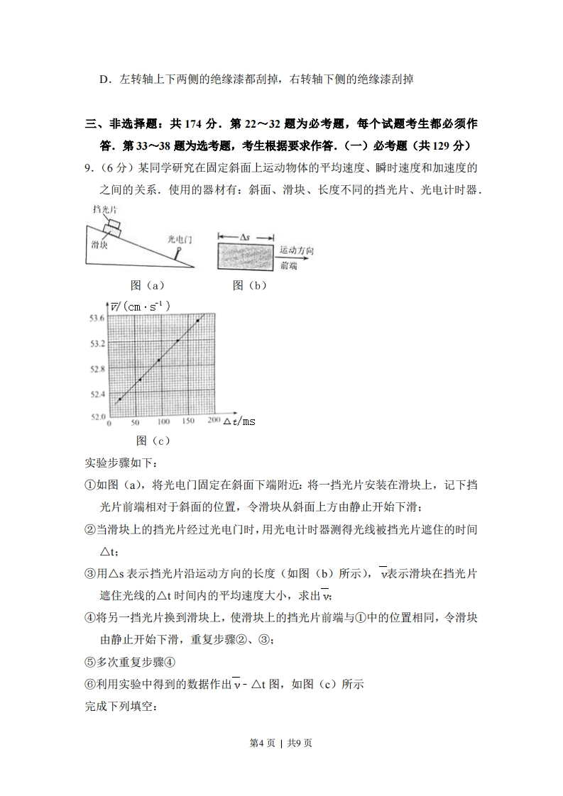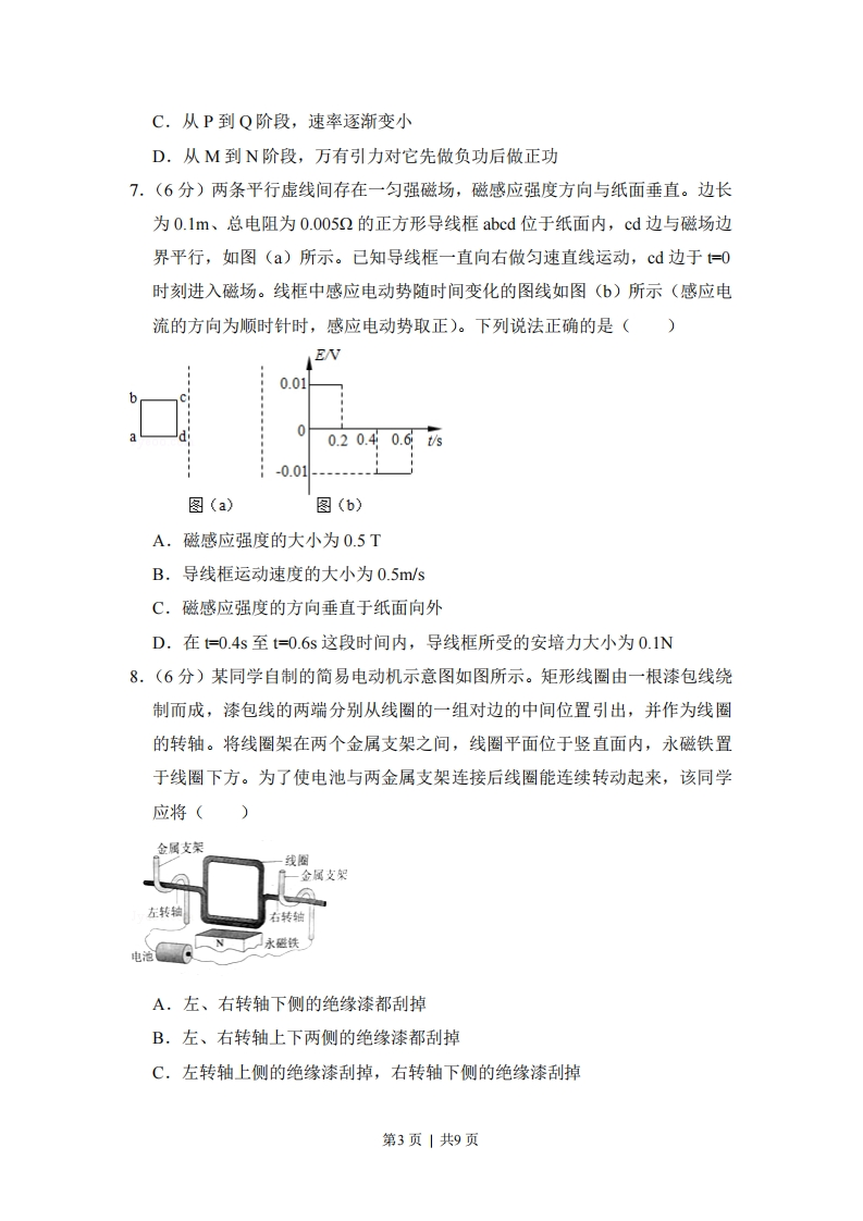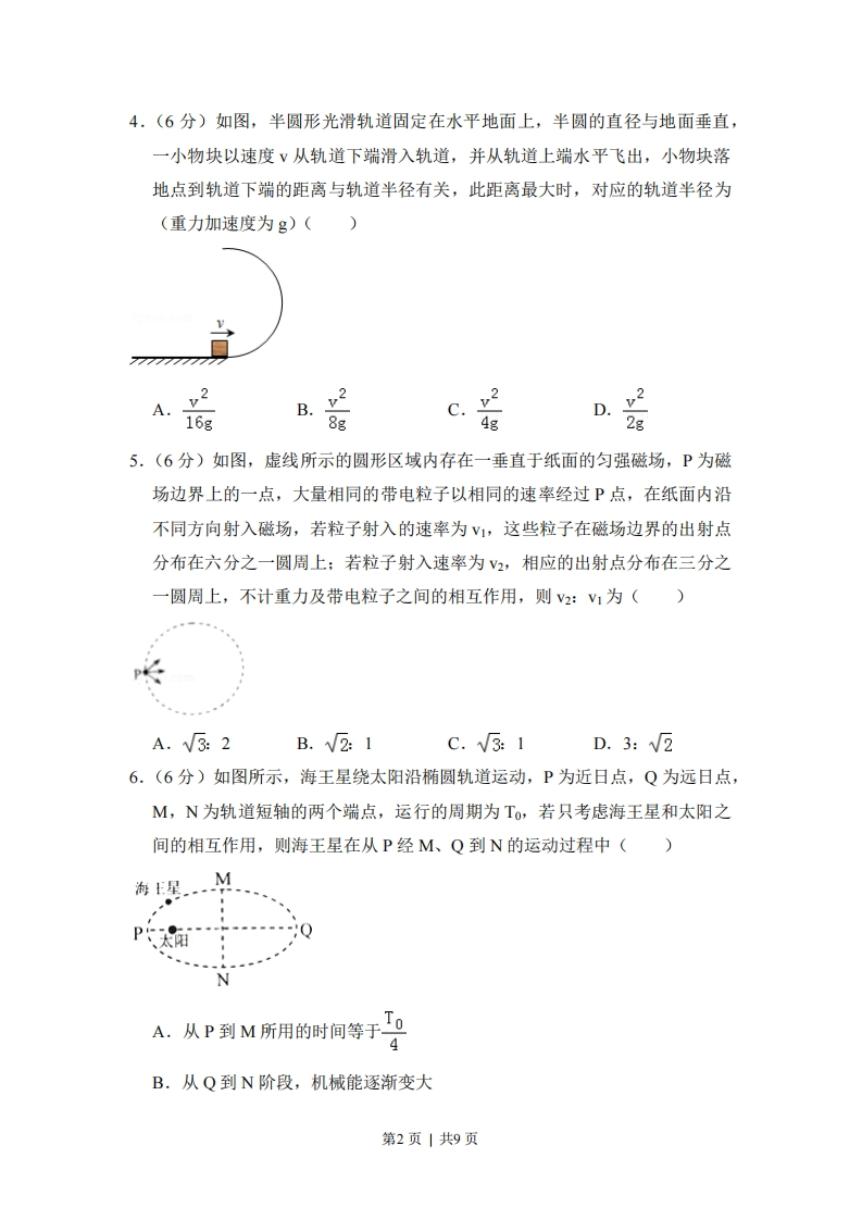 2017年全国统一高考物理试卷(新课标)一、选择题:本大题共8小题,每小题6分。在每小题给出的四个选项中,第1~5题只有一项是符合题目要求,第68题有多项符合题目要求.全部选对的得6分,选对但不全的得3分。有选错的得0分,1.(6分)如图,一光滑大圆环固定在桌面上,环面位于竖直平面内,在大圆环上套着一个小环,小环由大圆环的最高点从静止开始下滑,在小环下滑的过程中,大圆环对它的作用力()77700000000000000A.一直不做功B.一直做正功C.始终指向大圆环圆心D.始终背离大圆环圆心2.6分)一静止的铀核放出一个α粒子衰变成钍核,衰变方程为一Th+He,下列说法正确的是()A,衰变后钍核的动能等于α粒子的动能B.衰变后钍核的动量大小等于粒子的动量大小C.铀核的半衰期等于其放出一个α粒子所经历的时间D.衰变后α粒子与钍核的质量之和等于衰变前铀核的质量3.(6分)如图,一物块在水平拉力F的作用下沿水平桌面做匀速直线运动。若保持F的大小不变,而方向与水平面成60°角,物块也恰好做匀速直线运动。物块与桌面间的动摩擦因数为()760A.2-√3B.6c.D.V32第1页|共9页4,(6分)如图,半圆形光滑轨道固定在水平地面上,半圆的直径与地面垂直,一小物块以速度ⅴ从轨道下端滑入轨道,并从轨道上端水平飞出,小物块落地点到轨道下端的距离与轨道半径有关,此距离最大时,对应的轨道半径为(重力加速度为g)()7777777777A.216gB.28gC.34gD.2g5.(6分)如图,虚线所示的圆形区域内存在一垂直于纸面的匀强磁场,P为磁场边界上的一点,大量相同的带电粒子以相同的速率经过P点,在纸面内沿不同方向射入磁场,若粒子射入的速率为V1,这些粒子在磁场边界的出射点分布在六分之一圆周上:若粒子射入速率为V2,相应的出射点分布在三分之一圆周上,不计重力及带电粒子之间的相互作用,则2:V1为()A.√3:2B.√2:1C.√3:1D.3:√26.(6分)如图所示,海王星绕太阳沿椭圆轨道运动,P为近日点,Q为远日点,M,N为轨道短轴的两个端点,运行的周期为To,若只考虑海王星和太阳之间的相互作用,则海王星在从P经M、Q到N的运动过程中()海上星MP代陌NA.从P到M所用的时间等于T4B.从Q到N阶段,机械能逐渐变大第2页|共9页C.从P到Q阶段,速率逐渐变小D.从M到N阶段,万有引力对它先做负功后做正功7.(6分)两条平行虚线间存在一匀强磁场,磁感应强度方向与纸面垂直。边长为0.1m、总电阻为0.0052的正方形导线框abcd位于纸面内,cd边与磁场边界平行,如图(a)所示。已知导线框一直向右做匀速直线运动,cd边于=0时刻进入磁场。线框中感应电动势随时间变化的图线如图(6b)所示(感应电流的方向为顺时针时,感应电动势取正)。下列说法正确的是()E0.0100.20.40.6ts-0.01----图(a)图(b)A.磁感应强度的大小为0.5TB.导线框运动速度的大小为0.5m/sC.磁感应强度的方向垂直于纸面向外D.在=0.4s至=0.6s这段时间内,导线框所受的安培力大小为0.1N8.(6分)某同学自制的简易电动机示意图如图所示。矩形线圈由一根漆包线绕制而成,漆包线的两端分别从线圈的一组对边的中间位置引出,并作为线圈的转轴。将线圈架在两个金属支架之间,线圈平面位于竖直面内,永磁铁置于线圈下方。为了使电池与两金属支架连接后线圈能连续转动起来,该同学应将()金属支架线圈—金属支架左转轴右转轴」永磁铁电泡A.左、右转轴下侧的绝缘漆都刮掉B.左、右转轴上下两侧的绝缘漆都刮掉C.左转轴上侧的绝缘漆刮掉,右转轴下侧的绝缘漆刮掉第3页|共9页