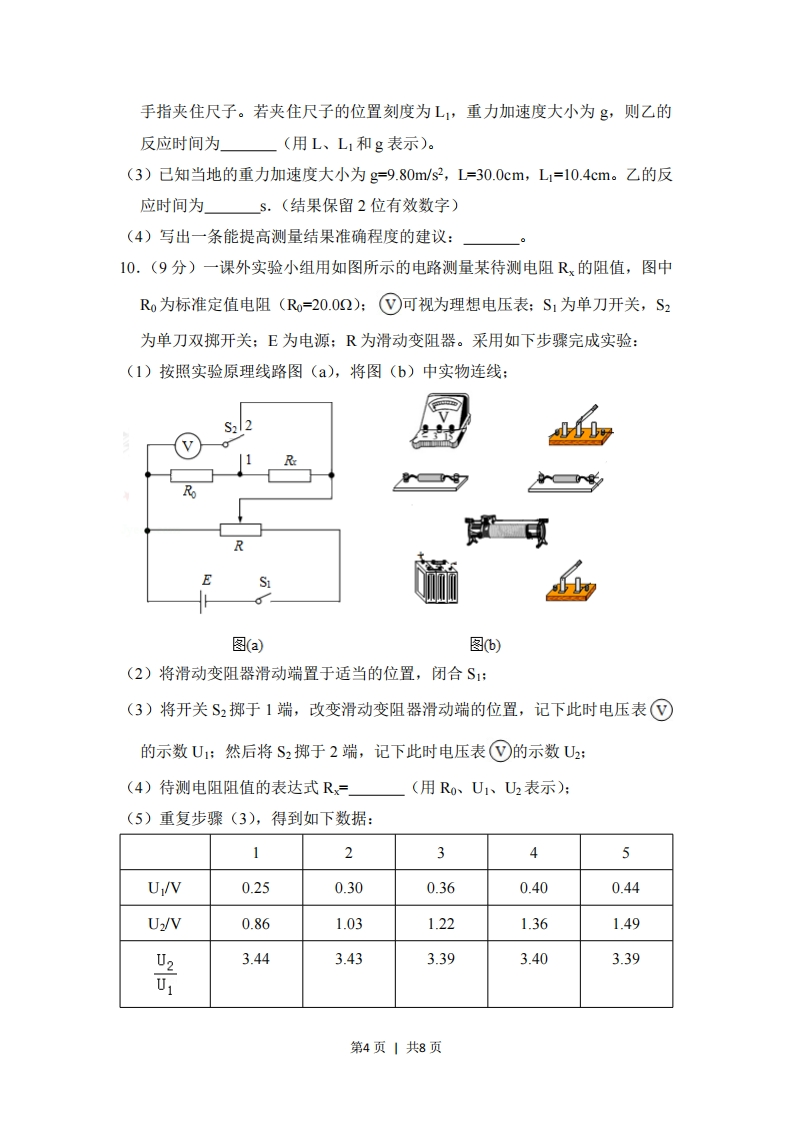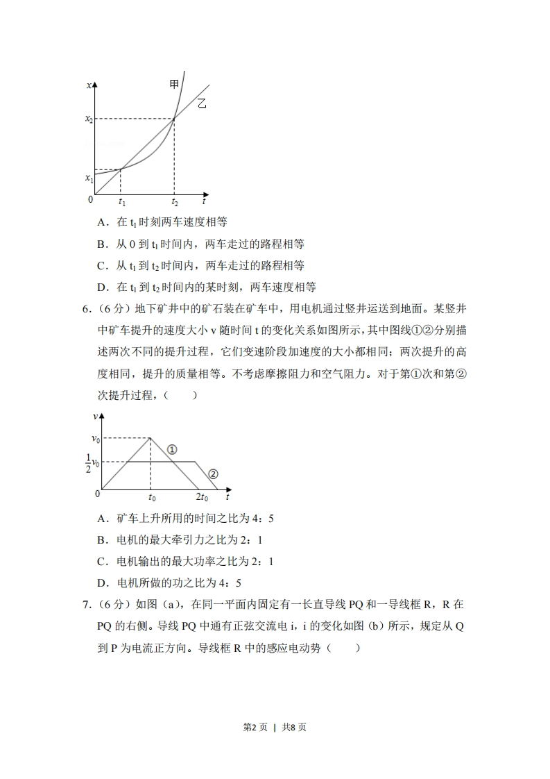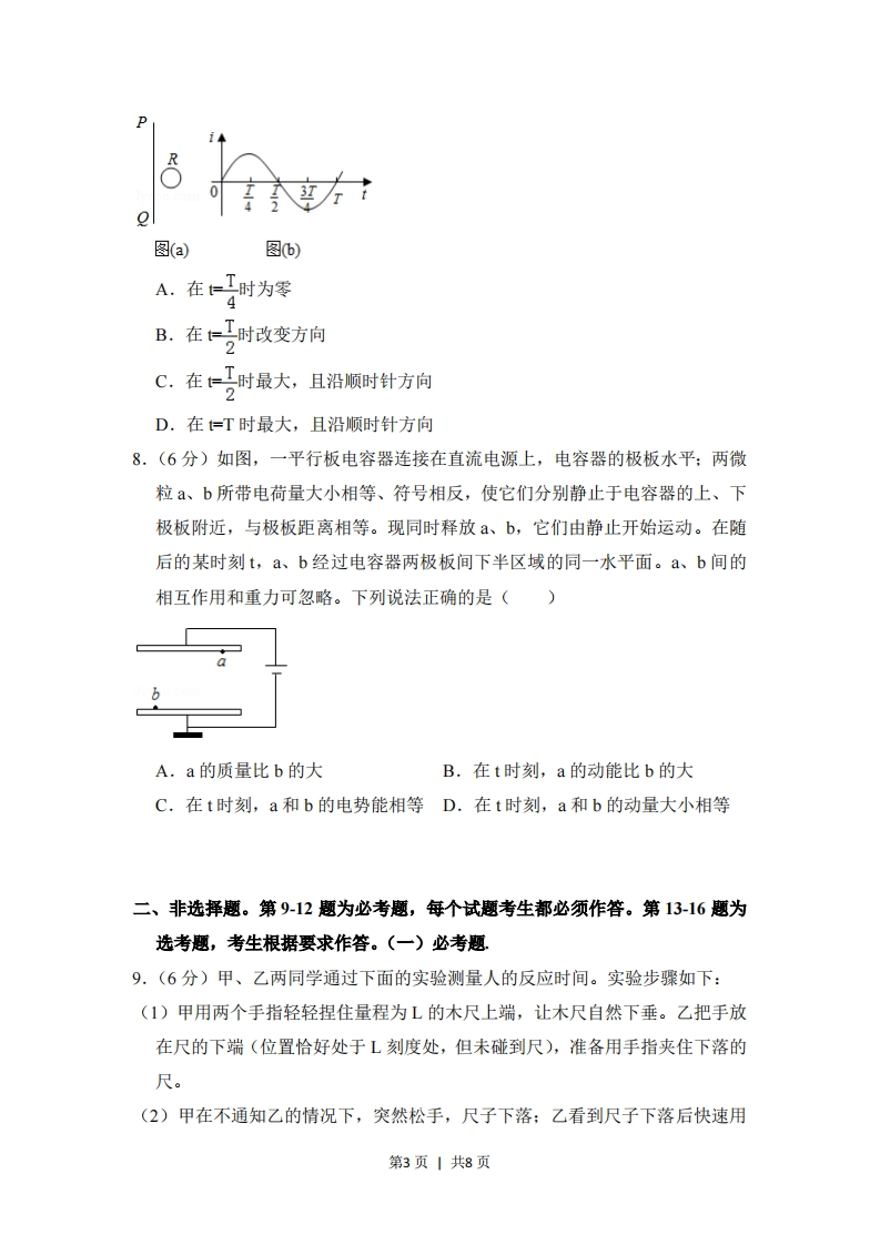 2018年全国统一高考物理试卷(新课标Ⅱ)一、选择题:本题共8个小题,每题6分,共48分。在每个小题给出的四个选项中,第1-4题只有一项符合题目要求,第5-8题有多项符合题目要求。全部选对的得6分,选对不全的得3分,有选错的得0分。1.(6分)1934年,约里奥-居里夫妇用α粒子轰击铝核A1,产生了第一个人工放射性核素X:a+l一+X.X的原子序数和质量数分别为()A.15和28B.15和30C.16和30D.17和312.(6分)为了探测引力波,“天琴计划预计发射地球卫星P,其轨道半径约为地球半径的16倍另一地球卫星Q的轨道半径约为地球半径的4倍。P与Q的周期之比约为()A.2:1B.4:1C.8:1D.16:13.(6分)一电阻接到方波交流电源上,在一个周期内产生的热量为Q方:若该电阻接到正弦交流电源上,在一个周期内产生的热量为Q正·该电阻上电压的峰值均为o,周期均为T,如图所示。则Q:Q等于()◆u八VA.1:√2B.V2:1C.1:2D.2:14.(6分)在一斜面顶端,将甲、乙两个小球分别以V和Y的速度沿同一方向水平抛出,两球都落在该斜面上。甲球落至斜面时的速率是乙球落至斜面时速率的()A.2倍B.4倍C.6倍D.8倍5.(6分)甲、乙两车在同一平直公路上同向运动,甲做匀加速直线运动,乙做匀速直线运动。甲、乙两车的位置x随时间t的变化如图所示。下列说法正确的是()第1页1共8页甲乙5A.在t时刻两车速度相等B.从0到时间内,两车走过的路程相等C.从到2时间内,两车走过的路程相等D.在到t2时间内的某时刻,两车速度相等6.(6分)地下矿井中的矿石装在矿车中,用电机通过竖井运送到地面。某竖井中矿车提升的速度大小ⅴ随时间t的变化关系如图所示,其中图线①②分别描述两次不同的提升过程,它们变速阶段加速度的大小都相同:两次提升的高度相同,提升的质量相等。不考虑摩擦阻力和空气阻力。对于第①次和第②次提升过程,()①To2toA.矿车上升所用的时间之比为4:5B.电机的最大牵引力之比为2:1C.电机输出的最大功率之比为2:1D.电机所做的功之比为4:57.(6分)如图(a),在同一平面内固定有一长直导线PQ和一导线框R,R在PQ的右侧。导线PQ中通有正弦交流电i,i的变化如图(b)所示,规定从Q到P为电流正方向。导线框R中的感应电动势()第2页1共8页P图(a图bA在时为线B.在号时成变方向C.在时最大,且沿顺时针方向D.在=T时最大,且沿顺时针方向8.(6分)如图,一平行板电容器连接在直流电源上,电容器的极板水平:两微粒a、b所带电荷量大小相等、符号相反,使它们分别静止于电容器的上、下极板附近,与极板距离相等。现同时释放a、b,它们由静止开始运动。在随后的某时刻t,a、b经过电容器两极板间下半区域的同一水平面。a、b间的相互作用和重力可忽略。下列说法正确的是()A.a的质量比b的大B.在t时刻,a的动能比b的大C.在t时刻,a和b的电势能相等D.在t时刻,a和b的动量大小相等二、非选择题。第9-12题为必考题,每个试题考生都必须作答。第13-16题为选考题,考生根据要求作答。(一)必考题9.(6分)甲、乙两同学通过下面的实验测量人的反应时间。实验步骤如下:(1)甲用两个手指轻轻捏住量程为L的木尺上端,让木尺自然下垂。乙把手放在尺的下端(位置恰好处于L刻度处,但未碰到尺),准备用手指夹住下落的尺。(2)甲在不通知乙的情况下,突然松手,尺子下落:乙看到尺子下落后快速用第3页1共8页