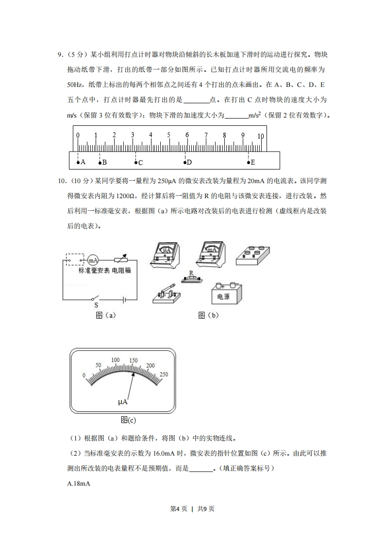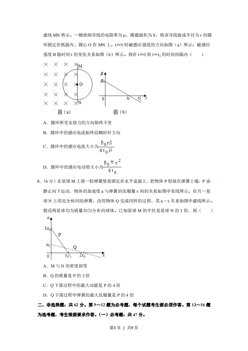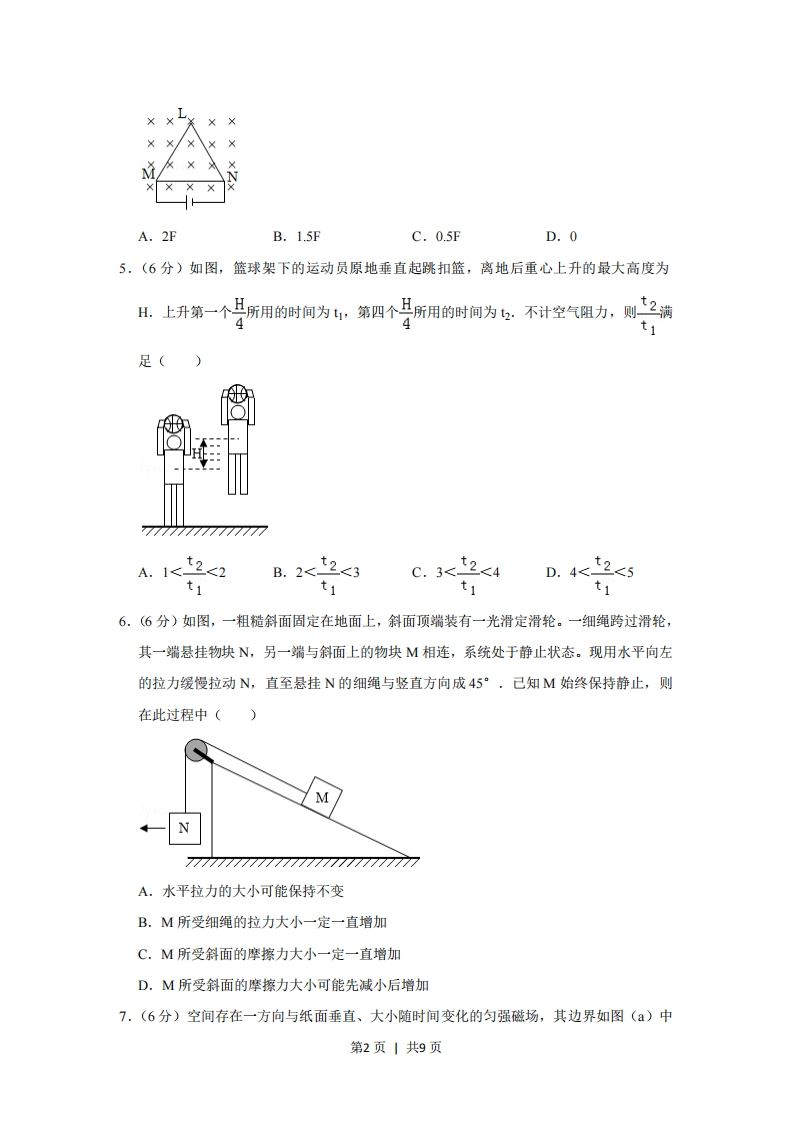 2019年全国统一高考物理试卷(新课标I)一、选挥恶本题共8小题,每小题6分,共48分。在每小题给出的四个选项中,第1~5题只有一项符合题目要求,第6~8题有多项符合题目要求。全部选对的得6分,选对但不全的得3分,有选错的得0分。1.(6分)氢原子能级示意图如图所示。光子能量在1.63eV~3.10eV的光为可见光。要使处于基态(=1)的氢原子被激发后可辐射出可见光光子,最少应给氢原子提供的能量为()E/eV-0312-3.401-13.60A.12.09eVB.10.20eVC.1.89eVD.1.51eV2.(6分)如图,空间存在一方向水平向右的匀强电场,两个带电小球P和Q用相同的绝缘细绳悬挂在水平天花板下,两细绳都恰好与天花板垂直,则()ilitiztiztPA.P和Q都带正电荷B.P和Q都带负电荷C.P带正电荷,Q带负电荷D.P带负电荷,Q带正电荷3.(6分)最近,我国为“长征九号”研制的大推力新型火箭发动机联试成功,这标志着我国重型运载火箭的研发取得突破性进展。若某次实验中该发动机向后喷射的气体速度约为3km/s,产生的推力约为4.8×10N,则它在1s时间内喷射的气体质量约为()A.1.6×102kgB.1.6×103kgC.1.6×105kgD.1.6×10kg4.(6分)如图,等边三角形线框LMN由三根相同的导体棒连接而成,固定于匀强磁场中,线框平面与磁感应强度方向垂直,线框项点M、N与直流电源两端相接。己知导体棒MN受到的安培力大小为F,则线框LMN受到的安培力的大小为()第1页1共9页A.2FB.1.5FC.0.5FD.05,(6分)如图,篮球架下的运动员原地垂直起跳扣篮,离地后重心上升的最大高度为H。上升第一个所用的时间为1,第四个所用的时间为.不计空气阻力,则2满1足(777777777777777A.1