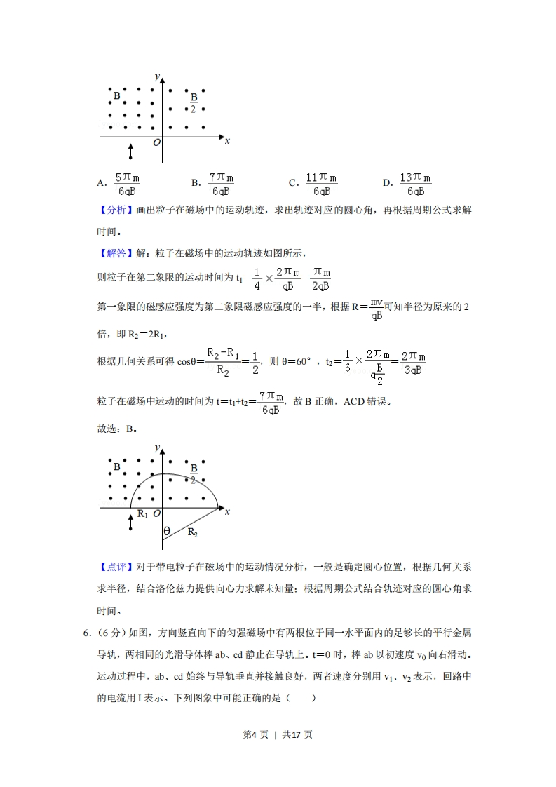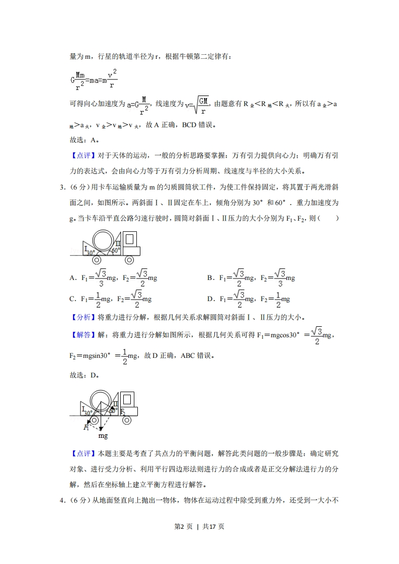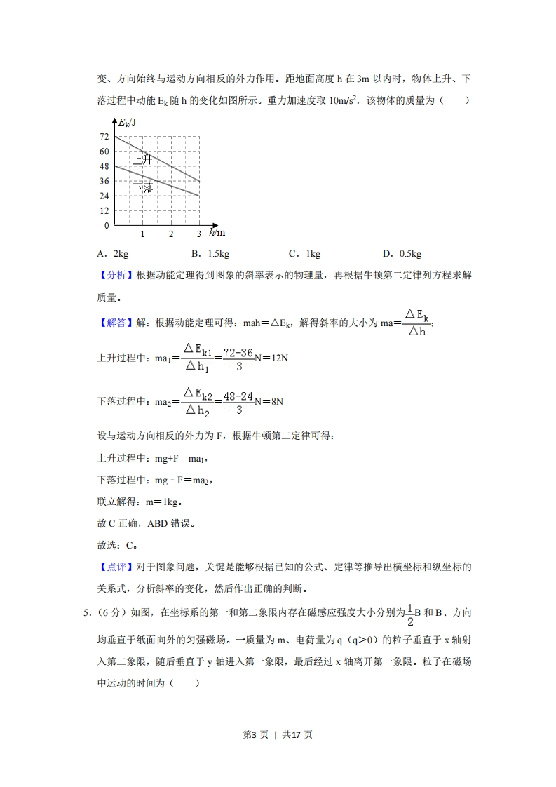 2019年全国统一高考物理试卷(新课标Ⅲ)◆考答案与试题解析一、选择题本题共8小题,每小题6分,共48分。在年小题给出的四个选项中,第1~5题只有一项符合题目要求,第6~8题有多项符合题目要求。全部选对的得6分,选对但不全的得3分,有选错的得0分。1.(6分)楞次定律是下列哪个定律在电磁感应现象中的具体体现?()A.电阻定律B.库仑定律C.欧姆定律D.能量守恒定律【分析】当线圈与磁体间有相对运动时,根据“来拒去留”可知,磁场力都是阻碍线圈与磁体间的相对运动,有外力对系统做了功,导致其他形式的能转化为线圈的电能:当导体做切割磁感线运动时,安培力总是阻碍导体的运动,导体克服安培力做,把其他形式的能转化为电能,据此即可分析。【解答】解:当线圈与磁体间有相对运动时,根据“来拒去留”可知,磁场力都是阻碍线圈与磁体间的相对运动,有外力对系统做了功,导致其他形式的能转化为线圈的电能当导体做切割磁感线运动时,安培力总是阻碍导体的运动,导体克服安培力做,把其他形式的能转化为电能,所以楞次定律是能量守恒定律在电磁感应现象中的体现,故D正确,ABC错误。故选:D。【点评】考查电磁感应原理,掌握楞次定律的内涵,注意从做功与能量转化角度来认识楞次定律的内容。2.(6分)金星、地球和火星绕太阳的公转均可视为匀速圆周运动,它们的向心加速度大小分别为a金、a地、a,它们沿轨道运行的速率分别为v金、v地、V火·已知它们的轨道半径R金a地>a火B.a火>a地>a金C.V地>V火>V金D.V火>V地V金【分析】行星绕太阳做匀速圆周运动,由太阳的万有引力提供向心力,由牛顿第二定律列式分析距离关系、线速度关系及加速度关系。【解答】解:行星绕太阳运动时,万有引力提供向心力,设太阳的质量为M,行星的质第1页|共17页量为m,行星的轨道半径为r,根据牛顿第二定律有:2r2-masm Y可心加速度为a=G”,线速度下GlL,由题意有R金a地>a火,V金>V地>V火,故A正确,BCD错误。故选:A【点评】对于天体的运动,一般的分析思路要掌握:万有引力提供向心力:明确万有引力的表达式,会由向心力等于万有引力分析周期、线速度与半径的大小关系。3.(6分)用卡车运输质量为m的匀质圆筒状工件,为使工件保持固定,将其置于两光滑斜面之间,如图所示。两斜面I、Ⅱ固定在车上,倾角分别为30°和60°·重力加速度为g。当卡车沿平直公路匀速行驶时,圆筒对斜面I、Ⅱ压力的大小分别为F1、F2,则()A.=③g.F:-V3mgB.F-3mg,F1mg223C.F1=1mg.F2-V3mgD.F1-V3mg.F2=1mg22【分析】将重力进行分解,根据几何关系求解圆筒对斜面I、Ⅱ压力的大小。【解答】解:将重力进行分解如图所示,根据几何关系可得F1=mgcos30°=5mg,F2=mgsin30°=1mg,故D正确,ABC错误。2故选:D。mg【点评】本题主要是考查了共点力的平衡问题,解答此类问题的一般步骤是:确定研究对象、进行受力分析、利用平行四边形法则进行力的合成或者是正交分解法进行力的分解,然后在坐标轴上建立平衡方程进行解答。4.(6分)从地面竖直向上抛出一物体,物体在运动过程中除受到重力外,还受到一大小不第2页|共17页变、方向始终与运动方向相反的外力作用。距地面高度h在3m以内时,物体上升、下落过程中动能Ek随h的变化如图所示。重力加速度取10m/s2.该物体的质量为()↑E/J7260483624下落12013/mA.2kgB.1.5kgC.1kgD.0.5kg【分析】根据动能定理得到图象的斜率表示的物理量,再根据牛顿第二定律列方程求解质量。【解答】解:根据动能定理可得:mah=△Ek,解得斜率的大小为ma=△Bk△h上升过程中:ma1=△Ek1=72-36N=12N△h13下落过程中:ma2=△Ek2=48-24N=8N△h23设与运动方向相反的外力为F,根据牛顿第二定律可得:上升过程中:mg+F=ma1,下落过程中:mg~F=ma,联立解得:m=1kg故C正确,ABD错误。故选:C。【点评】对于图象问题,关键是能够根据己知的公式、定律等推导出横坐标和纵坐标的关系式,分析斜率的变化,然后作出正确的判断。5.(6分)如图,在坐标系的第一和第二象限内存在磁感应强度大小分别为1B和B、方向2均垂直于纸面向外的匀强磁场。一质量为m、电荷量为q(q>0)的粒子垂直于x轴射入第二象限,随后垂直于y轴进入第一象限,最后经过X轴离开第一象限。粒子在磁场中运动的时间为()第3页|共17页