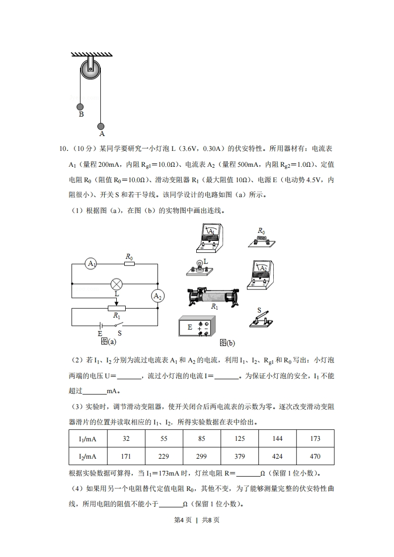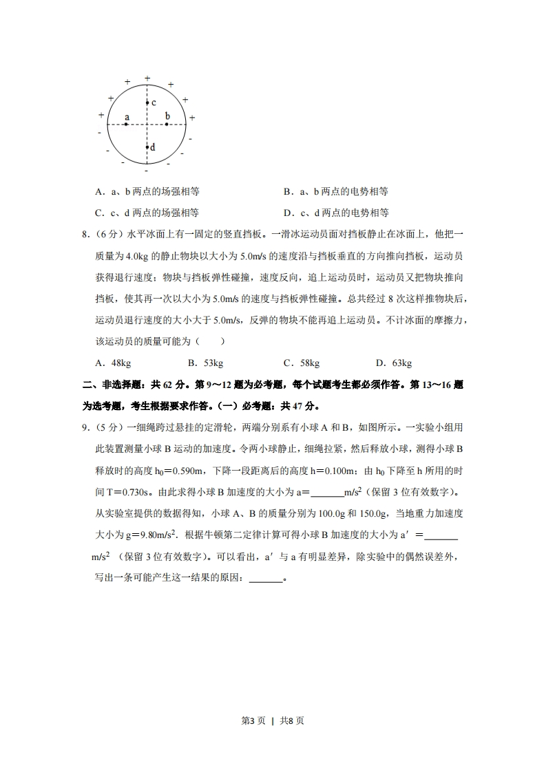 2020年全国统一高考物理试卷(新课标Ⅱ)一、选择题本题共8小题,每小题6分,共48分。在每小题给出的四个选项中,第1~5题只有一项符合题目要求,第6~8题有多项符合题目要求。全部选对的得6分,选对但不全的得3分,有选错的得0分。1.(6分)管道高频焊机可以对由钢板卷成的圆管的接缝实施焊接。焊机的原理如图所示,圆管通过一个接有高频交流电源的线圈,线圈所产生的交变磁场使圆管中产生交变电流,电流产生的热量使接缝处的材料熔化将其焊接。焊接过程中所利用的电磁学规律的发现者为()A.库仑B.霍尔C.洛伦兹D.法拉第2.(6分)若一均匀球形星体的密度为P,引力常量为G,则在该星体表面附近沿圆轨道绕其运动的卫星的周期是(3πA.1B.4元C01VGPW3πG04πGp3.(6分)如图,在摩托车越野赛途中的水平路段前方有一个坑,该坑沿摩托车前进方向的水平宽度为3h,其左边缘a点比右边缘b点高0.5h。若摩托车经过a点时的动能为E,它会落到坑内c点,c与a的水平距离和高度差均为h:若经过a点时的动能为E2,该摩托车恰能越过坑到达b点。E2等于()选a2hA.20B.18C.9.0D.3.04.(6分)CT扫描是计算机X射线断层扫描技术的简称,CT扫描机可用于对多种病情的探测。图(a)是某种CT机主要部分的剖面图,其中X射线产生部分的示意图如图(b)所示。图(b)中M、N之间有一电子束的加速电场,虚线框内有匀强偏转磁场经调节后电子束从静止开始沿带箭头的实线所示的方向前进,打到靶上,产生X射线(如图中带箭头的虚线所示):将电子束打到靶上的点记作P点。则()第1页1共8页偏转线圈口一探测器偏转磁磁场电子枪电子束X射线束X射线束靶目标靶环图(a)图b)A.M处的电势高于N处的电势B.增大M、N之间的加速电压可以使P点左移C.偏转磁场的方向垂直于纸面向外D.增大偏转磁场磁感应强度的大小可使P点左移5.《6分)氘核弭可通过一系列聚变反应释放能量,其总效果可用反应式6I→2c+2}H+2+43.15MeV表示。海水中富含氘,已知1kg海水中含有的氘核约为1.0×102个,若全都发生聚变反应,其释放的能量与质量为M的标准煤燃烧时释放的热量相等:己知1kg标准煤燃烧释放的热量约为2.9×10叮,1MV=1.6×10-1),则M约为()A.40kgB.100kgC.400kgD.1000kg6.(6分)特高压输电可使输送中的电能损耗和电压损失大幅降低。我国已成功掌握并实际应用了特高压输电技术。假设从A处采用550kV的超高压向B处输电,输电线上损耗的的电功率为△P,到达B处时电压下降了△U.在保持A处输送的电功率和输电线电阻都不变的条件下,改用1100kV特高压输电,输电线上损耗的电功率变为△P',到达B处时电压下降了△U'·不考虑其他因素的影响,则()A.△P'=1△PB.△P'=1△PC.△U'=1△UD.△U'=1△U4427.(6分)如图,竖直面内一绝缘圆环的上、下半圆分别均匀分布着等量异种电荷。、b为圆环水平直径上的两个点,©、d为竖直直径上的两个点,它们与圆心的距离均相等。则()第2页1共8页A.a、b两点的场强相等B.a、b两点的电势相等C.c、d两点的场强相等D.c、d两点的电势相等8.(6分)水平冰面上有一固定的竖直挡板。一滑冰运动员面对挡板静止在冰面上,他把一质量为4.0kg的静止物块以大小为5.0ms的速度沿与挡板垂直的方向推向挡板,运动员获得退行速度:物块与挡板弹性碰撞,速度反向,追上运动员时,运动员又把物块推向挡板,使其再一次以大小为5.0ms的速度与挡板弹性碰撞。总共经过8次这样推物块后,运动员退行速度的大小大于5.0m/s,反弹的物块不能再追上运动员。不计冰面的摩擦力,该运动员的质量可能为()A.48kgB.53kgC.58kgD.63kg二、非选择题:共62分。第9~12题为必考题,年个试题考生都必须作答。第13~16题为选考题,考生根据要求作答。(一)必考题:共47分。9.(5分)一细绳跨过悬挂的定滑轮,两端分别系有小球A和B,如图所示。一实验小组用此装置测量小球B运动的加速度。令两小球静止,细绳拉紧,然后释放小球,测得小球B释放时的高度ho=0.590m,下降一段距离后的高度h=0.100m:由ho下降至h所用的时间T=0.730s。由此求得小球B加速度的大小为a=m/s2(保留3位有效数字)。从实验室提供的数据得知,小球A、B的质量分别为100.0g和150.0g,当地重力加速度大小为g=9.80m/s2.根据牛顿第二定律计算可得小球B加速度的大小为a'=m/s2(保留3位有效数字)。可以看出,a'与a有明显差异,除实验中的偶然误差外,写出一条可能产生这一结果的原因:一。第3页1共8页
