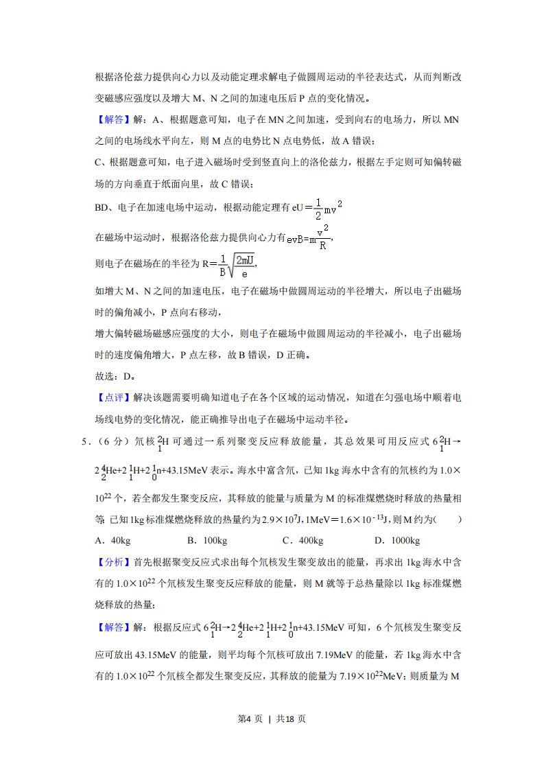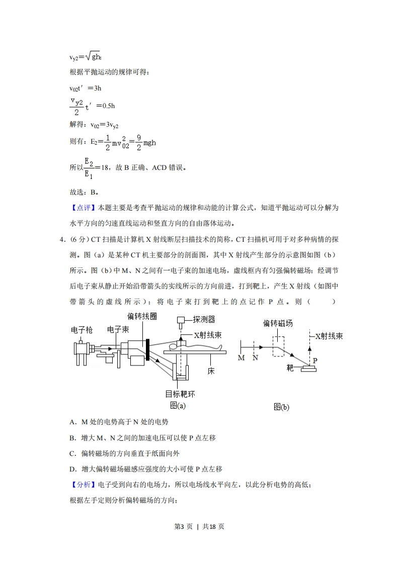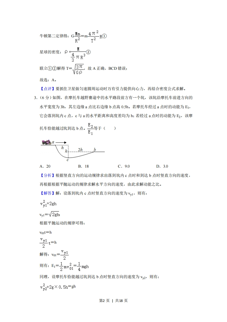 2020年全国统一高考物理试卷(新课标Ⅱ)◆考答案与试题解析一、选释愿本题共8小题,每小题6分,共48分。在每小题给出的四个选项中,第1~5题只有一项符合题目要求,第6~8题有多项符合题目要求。全部选对的得6分,选对但不全的得3分,有选错的得0分。1.(6分)管道高频焊机可以对由钢板卷成的圆管的接缝实施焊接。焊机的原理如图所示,圆管通过一个接有高频交流电源的线圈,线圈所产生的交变磁场使圆管中产生交变电流,电流产生的热量使接缝处的材料熔化将其焊接。焊接过程中所利用的电磁学规律的发现者为()A.库仑B.霍尔C.洛伦兹D.法拉第【分析】由题意可知,圆管为金属导体,导体内部自成闭合回路,且有电阻,当周围的线圈中产生出交变磁场时,就会在导体内部感应出涡电流,电流通过电阻要发热。该过程利用的原理是电磁感应现象,其发现者为法拉第。【解答】解:根据题意,焊接过程所利用的是变化的磁场在线圈中产生变化的电流,再利用电流产生的热量使接缝处的材料熔化将其焊接,属于电磁感应现象,是由法拉第发现的,故ABC错误,D正确:故选:D。【点评】根据现象找出对应的物理规律,再根据物理学史解答。2.(6分)若一均匀球形星体的密度为P,引力常量为G,则在该星体表面附近沿圆轨道绕其运动的卫星的周期是()A.3元B4元CD.V3πGp4πGp【分析】根据万有引力等于向心力G血=mπ2R及球体的密度公式P联立72R33求解T。【解答】解:设星球的质量为M,半径为R,卫星的质量为m,运行周期为T,在该星体表面附近沿圆轨道绕其运动的卫星所需的向心力由星球对其的万有引力提供,则根据第1页|共18页牛顿第二定律得:G一=m4π2令3T2R①M星球的密度:P三43πR3联立①②解得T=3元故A正确,BCD错误:GP故选:A【点评】要抓住卫星做匀速圆周运动时万有引力提供向心力,再结合密度公式求解。3.(6分)如图,在摩托车越野赛途中的水平路段前方有一个坑,该坑沿摩托车前进方向的水平宽度为3h,其左边缘a点比右边缘b点高0.5h。若摩托车经过a点时的动能为E1,它会落到坑内c点,c与a的水平距离和高度差均为h:若经过a点时的动能为E2,该摩托车恰能越过坑到达b点。2等于()a-h2h---6A.20B.18C.9.0D.3.0【分析】根据竖直方向的运动规律求出落到坑内c点时和到达b点时竖直方向的速度,再根据根据平抛运动的规律求解水平方向的速度,由此求解动能之比。【解答】解:设落到坑内c点时竖直方向的速度为Vy,则有:3-2gy1=V√2gh:根据平抛运动的规律可得:Voit=h解得:o1=y则有:E=1m2=12mv014mgh同理,设摩托车恰能越过坑到达b点时竖直方向的速度为V2,则有:v322g×0.5h=助第2页|共18页Vy2=Vgh:根据平抛运动的规律可得:v02t'=3h2t=0.5h2解得:Vo2=3vy2则有:E=1mv2=92mv022 mgh所以2=18,故B正确、ACD错误。故选:B。【点评】本题主要是考查平抛运动的规律和动能的计算公式,知道平抛运动可以分解为水平方向的匀速直线运动和竖直方向的自由落体运动。4.(6分)CT扫描是计算机X射线断层扫描技术的简称,CT扫描机可用于对多种病情的探测。图(a)是某种CT机主要部分的剖面图,其中X射线产生部分的示意图如图(b)所示。图(b)中M、N之间有一电子束的加速电场,虚线框内有匀强偏转磁场:经调节后电子束从静止开始沿带箭头的实线所示的方向前进,打到靶上,产生X射线(如图中带箭头的虚线所示):将电子束打到靶上的点记作P点。则(偏转线圈口一探测器偏转磁场电子枪电子X射线束X射线束靶目标靶环图(a图b)A.M处的电势高于N处的电势B.增大M、N之间的加速电压可以使P点左移C.偏转磁场的方向垂直于纸面向外D.增大偏转磁场磁感应强度的大小可使P点左移【分析】电子受到向右的电场力,所以电场线水平向左,以此分析电势的高低:根据左手定则分析偏转磁场的方向:第3页|共18页