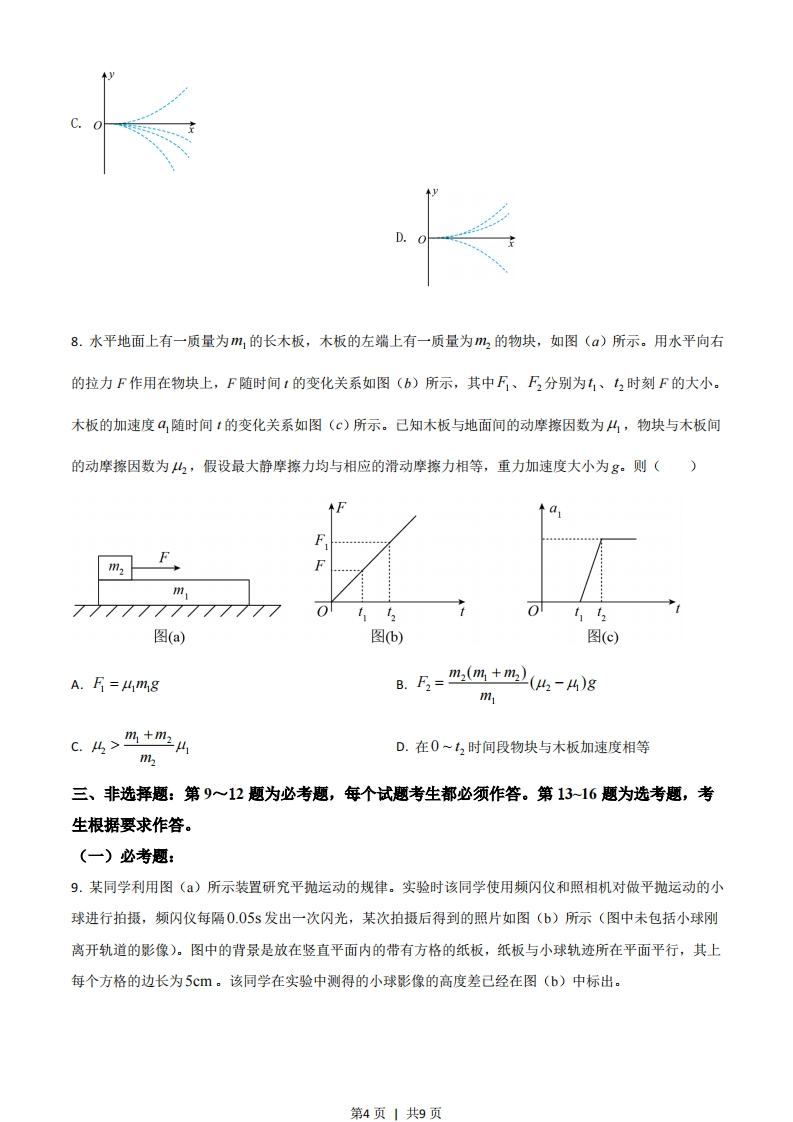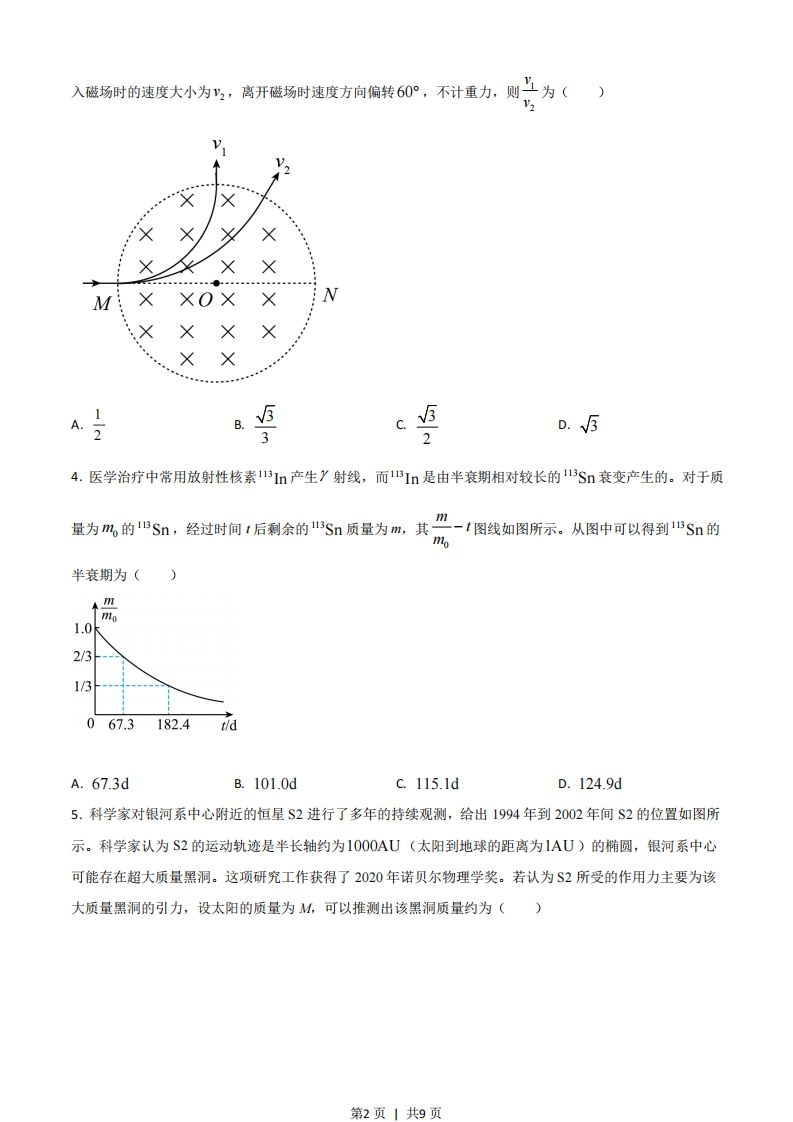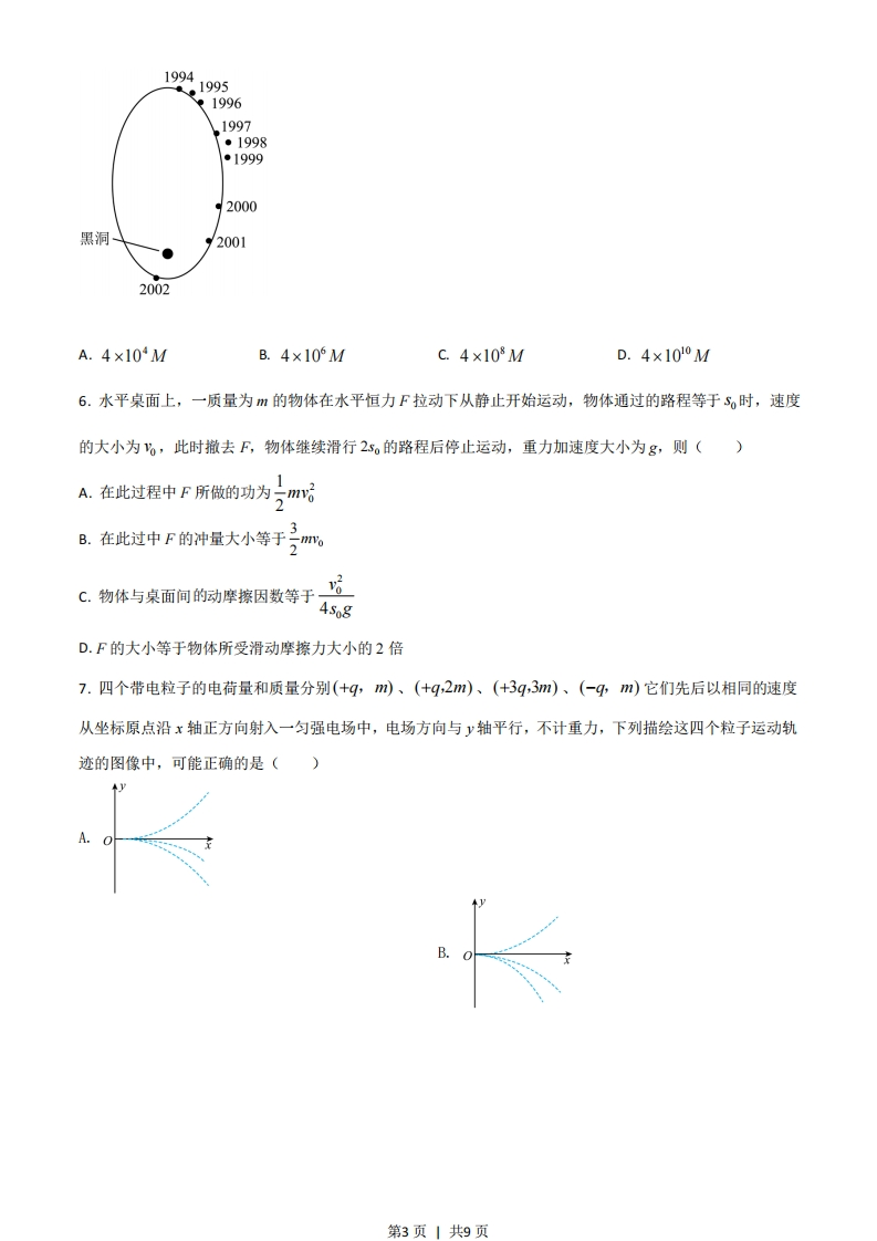 2021年高考全国乙卷物理试卷二、选择题:本题共8小题,每小题6分,共48分。在每小题给出的四个选项中,第1~5题只有一项符合题目要求,第6~8题有多项符合题目要求。全部选对的得6分,选对但不全的得3分,有选错的得0分。1.如图,光滑水平地面上有一小车,一轻弹簧的一端与车厢的挡板相连,另一端与滑块相连,滑块与车厢的水平底板间有摩擦。用力向右推动车厢使弹簧压缩,撤去推力时滑块在车厢底板上有相对滑动。在地面参考系(可视为惯性系)中,从撤去推力开始,小车、弹簧和滑块组成的系统()Q000000A.动量守恒,机械能守恒B.动量守恒,机械能不守恒C.动量不守恒,机械能守恒D.动量不守恒,机械能不守恒2.如图(),在一块很大的接地金属平板的上方固定一负电荷。由于静电感应,在金属平板上表面产生感应电荷,金属板上方电场的等势面如图(b)中虚线所示,相邻等势面间的电势差都相等。若将一正试探电荷先后放于M和N处,该试探电荷受到的电场力大小分别为FM和FN,相应的电势能分别为E,M和EN,则()⊙■■■年年■■■细■他年■■第图(a)图(b)A.FMFN,Ep>EpNC FMFN,EpM 0)的带电粒子从圆周上的M点沿直径MON方向射入磁场。若粒子射入磁场时的速度大小为?,离开磁场时速度方向偏转90°:若射第1页1共9页入磁场时的速度大小为2,离开磁场时速度方向偏转60°,不计重力,则上为()13XXMXOXNX2&55D.534.医学治疗中常用放射性核素113In产生Y射线,而1BIn是由半衰期相对较长的113Sn衰变产生的。对于质量为m的1BSn,经过时间t后剩余的l3Sn质量为m,其-1图线如图所示。从图中可以得到Sn的mo半衰期为(1.0k2/31/3067.3182.4idA.67.3dB.101.0dc.115.1dD.124.9d5.科学家对银河系中心附近的恒星S2进行了多年的持续观测,给出1994年到2002年间S2的位置如图所示。科学家认为S2的运动轨迹是半长轴约为1000AU(太阳到地球的距离为1AU)的椭圆,银河系中心可能存在超大质量黑洞。这项研究工作获得了2020年诺贝尔物理学奖。若认为S2所受的作用力主要为该大质量黑洞的引力,设太阳的质量为M,可以推测出该黑洞质量约为()第2页1共9页1994t。1995t19961997●1998●19992000黑洞20012002A.4×10MB.4×10°MC.4×108MD.4×100M6.水平桌面上,一质量为m的物体在水平恒力F拉动下从静止开始运动,物体通过的路程等于S时,速度的大小为%,此时撤去F,物体继续滑行25。的路程后停止运动,重力加速度大小为g,则()1A.在此过程中F所做的功为二mB.在此过中F的冲量大小等于2m。C.物体与桌面间的动摩擦因数等于,公ogD.F的大小等于物体所受滑动摩擦力大小的2倍7.四个带电粒子的电荷量和质量分别(+q,m)、(+q,2m)、(+3q,3m)、(-4,m)它们先后以相同的速度从坐标原点沿x轴正方向射入一匀强电场中,电场方向与y轴平行,不计重力,下列描绘这四个粒子运动轨迹的图像中,可能正确的是()41第3页1共9页