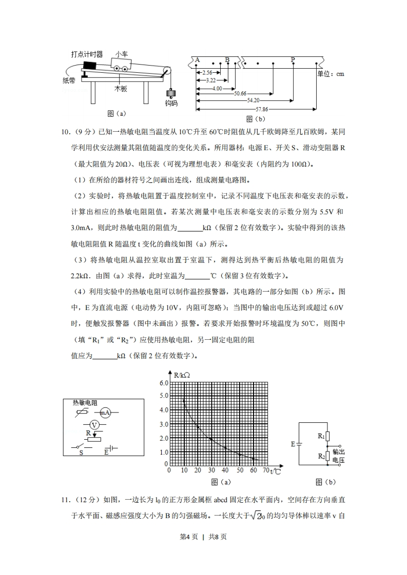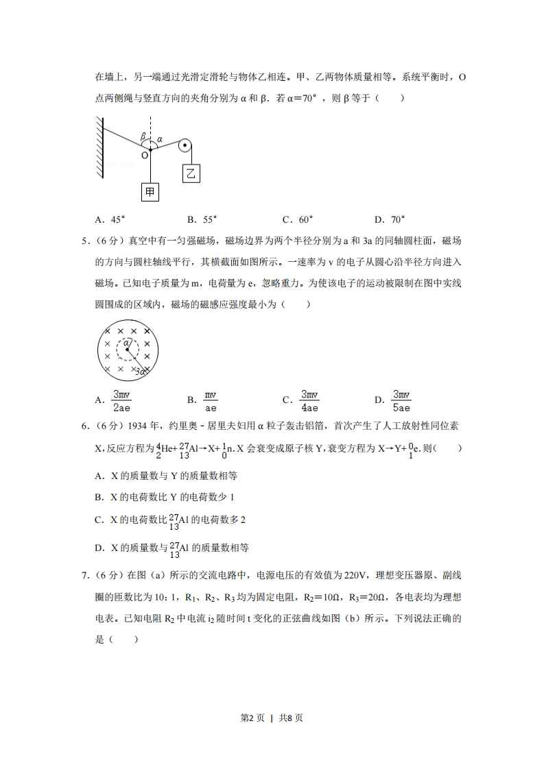 2020年全国统一高考物理试卷(新课标Ⅲ)一、选挥恶本题共8小题,每小题6分,共48分。在每小题给出的四个选项中,第1~5题只有一项符合题目要求,第6~8题有多项符合题目要求。全部选对的得6分,选对但不全的得3分,有选错的得0分。1.(6分)如图,水平放置的圆柱形光滑玻璃棒左边绕有一线圈,右边套有一金属圆环。圆环初始时静止。将图中开关$由断开状态拨至连接状态,电路接通的瞬间,可观察到()S?NA.拨至M端或N端,圆环都向左运动B.拨至M端或N端,圆环都向右运动C.拨至M端时圆环向左运动,拨至N端时向右运动D.拨至M端时圆环向右运动,拨至N端时向左运动2.(6分)甲、乙两个物块在光滑水平桌面上沿同一直线运动,甲追上乙,并与乙发生碰撞,碰撞前后甲、乙的速度随时间的变化如图中实线所示。己知甲的质量为1kg,则碰撞过程两物块损失的机械能为()◆W(m/s)6.04.02.00.0-2.0A.3JB.4JC.5JD.6J3.(6分)“嫦娥四号”探测器于2019年1月在月球背面成功着陆,着陆前曾绕月球飞行,某段时间可认为绕月做匀速圆周运动,圆周半径为月球半径的K倍。己知地球半径R是月球半径的P倍,地球质量是月球质量的Q倍,地球表面重力加速度大小为g。则“嫦娥四号”绕月球做圆周运动的速率为(A.RKgBRPKgRQgRPgQD.OK4.(6分)如图,悬挂甲物体的细线拴牢在一不可伸长的轻质细绳上O点处绳的一端固定第1页1共8页在墙上,另一端通过光滑定滑轮与物体乙相连。甲、乙两物体质量相等。系统平衡时,O点两侧绳与竖直方向的夹角分别为α和B.若α=70°,则B等于()甲A.45B.55C.60°D.705.(6分)真空中有一匀强磁场,磁场边界为两个半径分别为a和3a的同轴圆柱面,磁场的方向与圆柱轴线平行,其横截面如图所示。一速率为V的电子从圆心沿半径方向进入磁场。己知电子质量为m,电荷量为©,忽略重力。为使该电子的运动被限制在图中实线圆围成的区域内,磁场的磁感应强度最小为()×3必A.3mB.mvC.3myD.3mv2aeae4ae5ae6.(6分)1934年,约里奥~居里夫妇用α粒子轰击铝箔,首次产生了人工放射性同位素X,反应方程为He+2?Al→X+1n.X会衰变成原子核Y,衰变方程为X→Y+0e.则()213A,X的质量数与Y的质量数相等B.X的电荷数比Y的电荷数少1C.X的电荷数比2?A1的电荷数多213D.X的质量数与2?Al的质量数相等137.(6分)在图(a)所示的交流电路中,电源电压的有效值为220V,理想变压器原、副线圈的匝数比为10:1,R1、R2、R3均为固定电阻,R2=102,R3=202,各电表均为理想电表。己知电阻R2中电流2随时间t变化的正弦曲线如图(b)所示。下列说法正确的是()第2页1共8页i/A3(102s)图(a)图(b)A.所用交流电的频率为50HzB.电压表的示数为100VC.电流表的示数为1.0AD.变压器传输的电功率为15.0W8.(6分)如图,∠M是锐角三角形PMN最大的内角,电荷量为q(q>0)的点电荷固定在P点。下列说法正确的是()MA,沿MN边,从M点到N点,电场强度的大小逐渐增大B.沿MN边,从M点到N点,电势先增大后减小C.正电荷在M点的电势能比其在N点的电势能大D.将正电荷从M点移动到N点,电场力所做的总功为负二、非选择题:共62分。第9~12题为必考题,每个试题考生都必须作答。第13~16题为选考题,考生根据要求作答。(一)必考题:共47分。9.(6分)某同学利用图()所示装置验证动能定理。调整木板的倾角平衡摩擦阻力后,挂上钩码,钩码下落,带动小车运动并打出纸带。某次实验得到的纸带及相关数据如图(b)所示。己知打出图(b)中相邻两点的时间间隔为0.02s,从图(b)给出的数据中可以得到,打出B点时小车的速度大小VB=ms,打出P点时小车的速度大小Vp=ms。(结果均保留2位小数)若要验证动能定理,除了需测量钩码的质量和小车的质量外,还需要从图(b)给出的数据中求得的物理量为第3页1共8页