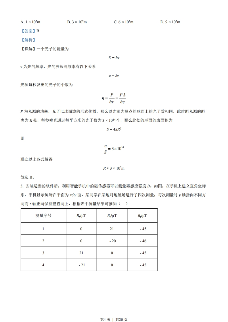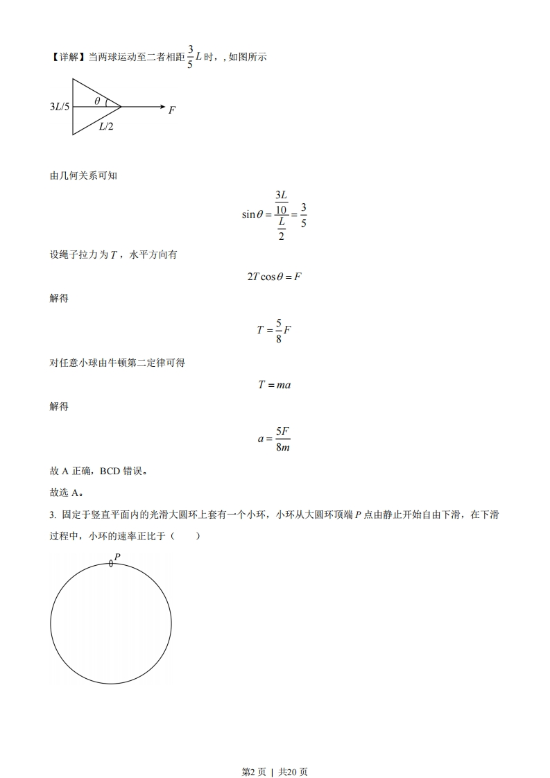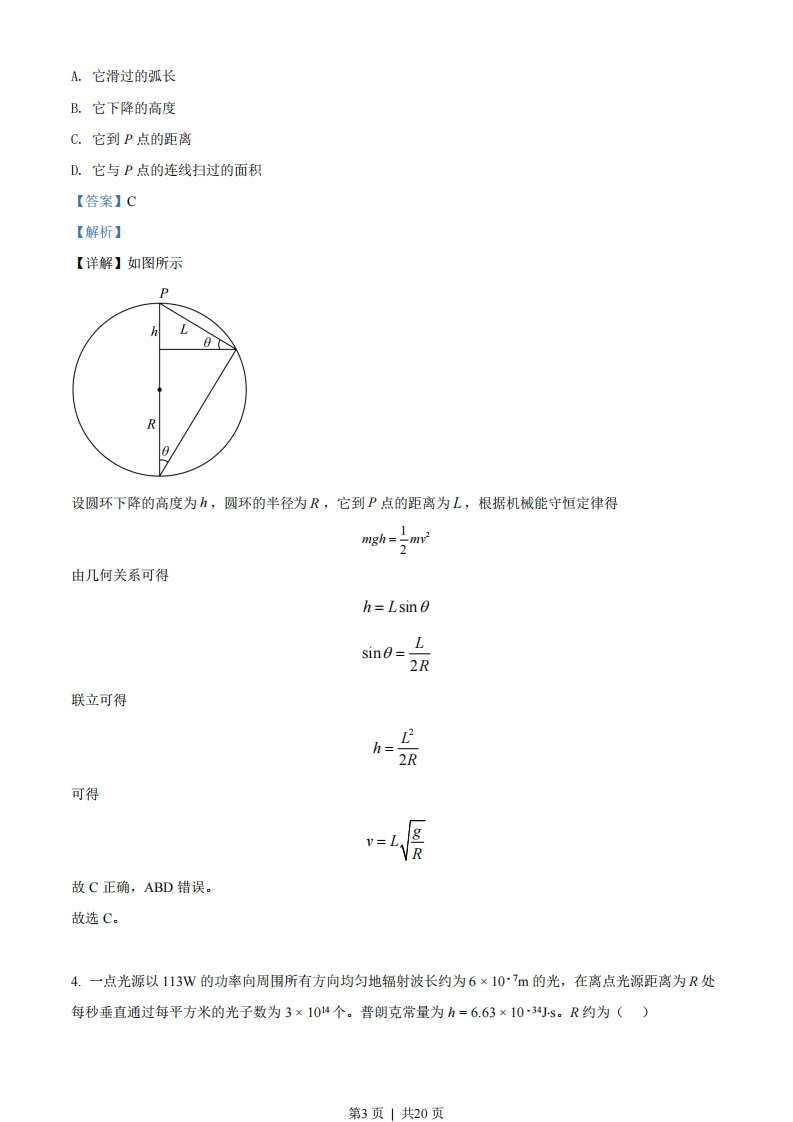 2022年全国乙理综物理二、选择题:1.2022年3月,中国航天员翟志刚、王亚平、叶光富在离地球表面约400k的“天宫二号空间站上通过天地连线,为同学们上了一堂精彩的科学课。通过直播画面可以看到,在近地圆轨道上飞行的“天宫二号”中,航天员可以自由地漂浮,这表明他们()A.所受地球引力的大小近似为零B.所受地球引力与飞船对其作用力两者的合力近似为零C.所受地球引力的大小与其随飞船运动所需向心力的大小近似相等D.在地球表面上所受引力的大小小于其随飞船运动所需向心力的大小【答案】C【解析】【详解】ABC.航天员在空间站中所受万有引力完全提供做圆周运动的向心力,飞船对其作用力等于零,故C正确,AB错误:D.根据万有引力公式F防=Gm2可知在地球表面上所受引力的大小大于在飞船所受的万有引力大小,因此地球表面引力大于其随飞船运动所需向心力的大小,故D错误。故选C。2.如图,一不可伸长轻绳两端各连接一质量为m的小球,初始时整个系统静置于光滑水平桌面上,两球间的距离等于绳长L。一大小为F的水平恒力作用在轻绳的中点,方向与两球连线垂直。当两球运动至二者相距二L时,它们加速度的大小均为()F○A.F新3F8mB.mC.10m【答案】A【解析】第1页」共20页【详解】当两球运动至二者相距二L时,,如图所示53L/5FL/2由几何关系可知3L3sin=1052设绳子拉力为T,水平方向有2Tcos0=F解得T-5F对任意小球由牛顿第二定律可得T=ma解得5Fq=8m故A正确,BCD错误。故选A。3.固定于竖直平面内的光滑大圆环上套有一个小环,小环从大圆环顶端P点由静止开始自由下滑,在下滑过程中,小环的速率正比于()汉第2页共20页A.它滑过的弧长B.它下降的高度C.它到P点的距离D.它与P点的连线扫过的面积【答案】C【解析】【详解】如图所示PAR设圆环下降的高度为,圆环的半径为R,它到P点的距离为L,根据机械能守恒定律得mgh=。mr22由几何关系可得h=Lsin 0sine=2R联立可得h2R可得故C正确,ABD错误。故选C。4.一点光源以113W的功率向周围所有方向均匀地辐射波长约为6×10~7m的光,在离点光源距离为R处每秒垂直通过每平方米的光子数为3×1014个。普朗克常量为h=6.63×1034Js。R约为()第3页1共20页