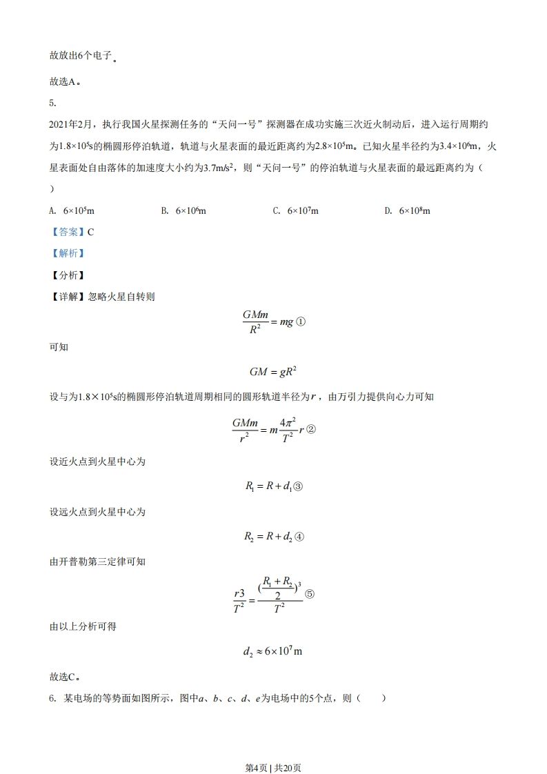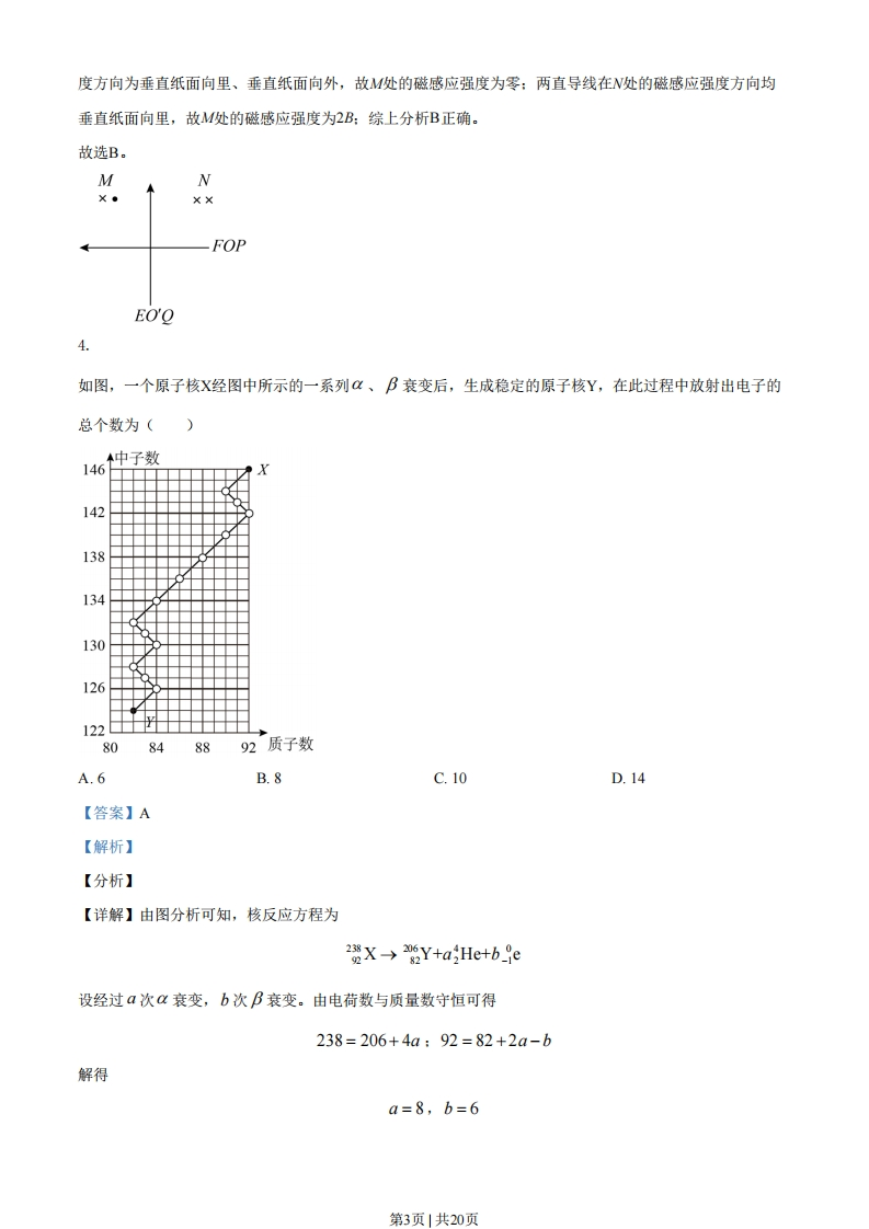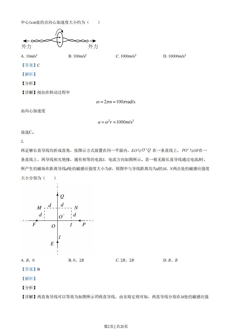2021年普通高等学校招生全国统一考试(甲卷)理科综合能力测试物理部分二、选释题:本题共8小题,每小题6分,共8分。在每小题给出的四个选项中,第1~5题只有一项符合题目要求,第6~8题有多项符合题目要求。全部选对的得6分,选对但不全的得3分,有选错的得0分。1.如图,将光滑长平板的下端置于铁架台水平底座上的挡板P处,上部架在横杆上。横杆的位置可在竖直杆上调节,使得平板与底座之间的夹角可变。将小物块由平板与竖直杆交点Q处静止释放,物块沿平板从Q点滑至P点所用的时间1与夹角的大小有关。若由30°逐渐增大至60°,物块的下滑时间将()光滑长平板横杆铁架台A.逐渐增大B.逐渐减小C.先增大后减小D.先减小后增大【答案】D【解析】【分析】【详解】设PQ的水平距离为L,由运动学公式可知L2gsinr21cos0可得t2=4Lgsin20可知0=45°时,t有最小值,故当0从由30逐渐增大至60°时下滑时间先减小后增大。故选D。2.“旋转纽扣”是一种传统游戏。如图,先将纽扣绕几圈,使穿过纽扣的两股细绳拧在一起,然后用力反复拉绳的两端,纽扣正转和反转会交替出现。拉动多次后,纽扣绕其中心的转速可达50s,此时纽扣上距离第1页|共20页中心lcm处的点向心加速度大小约为()外力外力A.10m/s2B.100m/s2C.1000m/s2D.10000m/s2【答案】C【解析】【分析】【详解】纽扣在转动过程中o=2πn=100mrad/s由向心加速度a=o2r≈1000m/s2故选C。3.两足够长直导线均折成直角,按图示方式放置在同一平面内,EO与O'Q在一条直线上,PO'与OF在一条直线上,两导线相互绝缘,通有相等的电流,电流方向如图所示。若一根无限长直导线通过电流时,所产生的磁场在距离导线d处的磁感应强度大小为B,则图中与导线距离均为d的M、W两点处的磁感应强度大小分别为()个QdM,dd0'd0PA.B、0B.0、2BC.2B、2BD.B、B【答案】B【解析】【分析】【详解】两直角导线可以等效为如图所示的两直导线,由安培定则可知,两直导线分别在M处的磁感应强第2页|共20页度方向为垂直纸面向里、垂直纸面向外,故M处的磁感应强度为零:两直导线在N处的磁感应强度方向均垂直纸面向里,故M处的磁感应强度为2B:综上分析B正确。故选B。MWXXFOPEOO4如图,一个原子核X经图中所示的一系列“、B衰变后,生成稳定的原子核Y,在此过程中放射出电子的总个数为()中子数146142138134130126122■80848892质子数A.6B.8C.10D.14【答案】A【解析】【分析】【详解】由图分析可知,核反应方程为2X→Y+agHe+b.9e设经过a次M衰变,b次B衰变。由电荷数与质量数守恒可得238=206+4a:92=82+2a-b解得a=8,b=6第3页|共20页