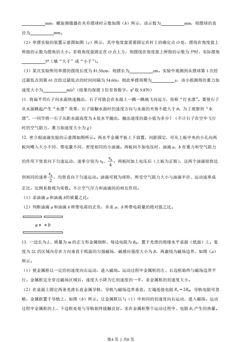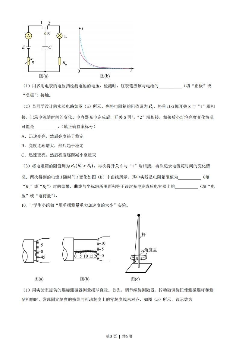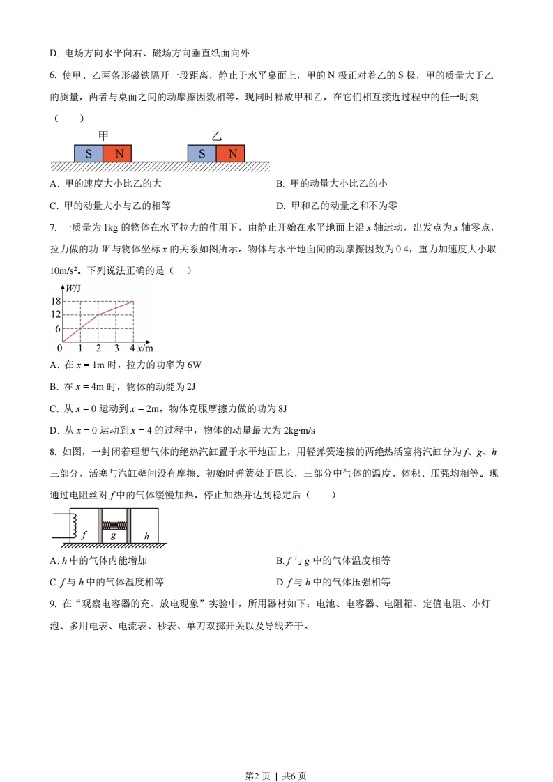 2023年普通高等学校招生全国统一考试(新课标卷)理科综合物理学科1.船上的人和水下的潜水员都能听见轮船的鸣笛声。声波在空气中和在水中传播时的()A波速和波长均不同B.频率和波速均不同C.波长和周期均不同D.周期和频率均不同2.无风时,雨滴受空气阻力的作用在地面附近会以恒定的速率竖直下落。一质量为m的雨滴在地面附近以速率ⅴ下落高度h的过程中,克服空气阻力做的功为(重力加速度大小为g)()A0B.mghC.Imv-mgh○2+853.铯原子基态的两个超精细能级之间跃迁发射的光子具有稳定的频率,铯原子钟利用的两能级的能量差量级为105eV,跃迁发射的光子的频率量级为(普朗克常量h=6.63×10-4Js,元电荷e=1.60×10-19C)()A.10HzB.106HzC.10HzD.1012Hz4.2023年5月,世界现役运输能力最大的货运飞船天舟六号,携带约5800kg的物资进入距离地面约400k(小于地球同步卫星与地面的距离)的轨道,顺利对接中国空间站后近似做匀速圆周运动。对接后,这批物资()A.质量比静止在地面上时小B.所受合力比静止在地面上时小C.所受地球引力比静止在地面上时大D.做圆周运动的角速度大小比地球自转角速度大5.一电子和一a粒子从铅盒上的小孔O竖直向上射出后,打到铅盒上方水平放置的屏幕P上的a和b两点,a点在小孔O的正上方,b点在a点的右侧,如图所示。己知α粒子的速度约为电子速度的云,铅盒10与屏幕之间存在匀强电场和匀强磁场,则电场和磁场方向可能为()a bpA电场方向水平向左、磁场方向垂直纸面向里B.电场方向水平向左、磁场方向垂直纸面向外C.电场方向水平向右、磁场方向垂直纸面向里第1页」共6页D.电场方向水平向右、磁场方向垂直纸面向外6.使甲、乙两条形磁铁隔开一段距离,静止于水平桌面上,甲的N极正对着乙的S极,甲的质量大于乙的质量,两者与桌面之间的动摩擦因数相等。现同时释放甲和乙,在它们相互接近过程中的任一时刻甲SNA.甲的速度大小比乙的大B.甲的动量大小比乙的小C.甲的动量大小与乙的相等D.甲和乙的动量之和不为零7.一质量为1kg的物体在水平拉力的作用下,由静止开始在水平地面上沿x轴运动,出发点为x轴零点,拉力做的功W与物体坐标x的关系如图所示。物体与水平地面间的动摩擦因数为0.4,重力加速度大小取10m/s2。下列说法正确的是()个WJ181201234x/mA.在x=1m时,拉力的功率为6WB.在x=4m时,物体的动能为2JC.从x=0运动到x=2m,物体克服摩擦力做的功为8JD.从x=0运动到x=4的过程中,物体的动量最大为2kgm/s8.如图,一封闭着理想气体的绝热汽缸置于水平地面上,用轻弹簧连接的两绝热活塞将汽缸分为人g、h三部分,活塞与汽缸壁间没有摩擦。初始时弹簧处于原长,三部分中气体的温度、体积、压强均相等。现通过电阻丝对「中的气体缓慢加热,停止加热并达到稳定后()gA.h中的气体内能增加B.∫与g中的气体温度相等C.∫与h中的气体温度相等D.f与h中的气体压强相等9.在“观察电容器的充、放电现象”实验中,所用器材如下:电池、电容器、电阻箱、定值电阻、小灯泡、多用电表、电流表、秒表、单刀双掷开关以及导线若干。第2页|共6页图(a)图(b)(1)用多用电表的电压挡检测电池的电压。检测时,红表笔应该与电池的(填“正极”或“负极”)接触。(2)某同学设计的实验电路如图()所示。先将电阻箱的阻值调为R,将单刀双掷开关S与“1”端相接,记录电流随时间的变化。电容器充电完成后,开关S再与“2”端相接,相接后小灯泡亮度变化情况可能是。(填正确答案标号)A.迅速变亮,然后亮度趋于稳定B.亮度逐渐增大,然后趋于稳定C.迅速变亮,然后亮度逐渐减小至熄灭(3)将电阻箱的阻值调为飞(R>R),再次将开关S与“1”端相接,再次记录电流随时间的变化情况。两次得到的电流I随时间1变化如图(b)中曲线所示,其中实线是电阻箱阻值为(填“R,”或“R2”)时的结果,曲线与坐标轴所围面积等于该次充电完成后电容器上的(填“电压”或“电荷量”)。10.一学生小组做“用单摆测量重力加速度的大小”实验。杆10-5角度盘0510152日图(a图b)图(c)(1)用实验室提供的螺旋测微器测量摆球直径。首先,调节螺旋测微器,拧动微调旋钮使测微螺杆和测砧相触时,发现固定刻度的横线与可动刻度上的零刻度线未对齐,如图(a)所示,该示数为第3页」共6页