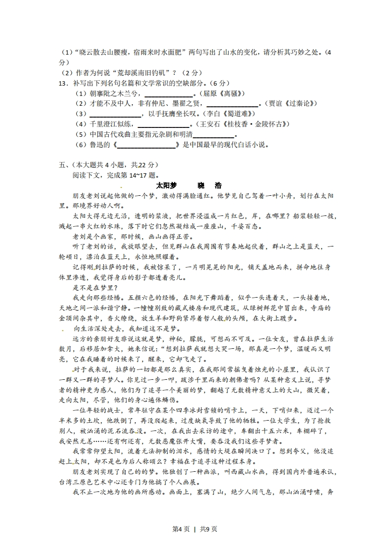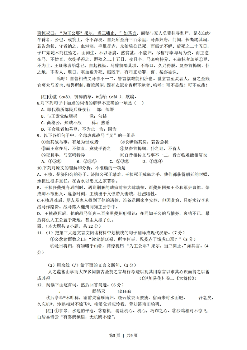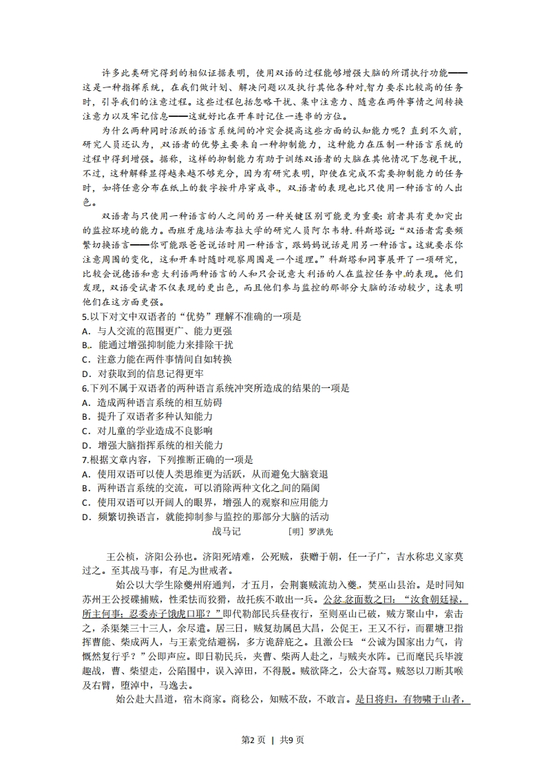 2012年普通高等学校招生全国统一考试(重庆卷)语文试题一.下列词语中,加点字的读音全都正确的一组是A.执拗ni祛暑q0阿其所好ē吆五喝六heB.汤匙chf巷战xiang久假不归jǎ不揣冒昧chuiC.鬓角bin蛇蝎jié稗官野史bdi成绩斐然ěⅰD.舷窗xudn炽热chi浑浑噩噩hin。咄咄逼人dud2.下列各组词语中,有错别字的一组是A修炼俏皮话集腋成裘动则得咎B.朱砂冷飕飕椎心泣血犯而不校C.恭候岔路口废话连篇故弄玄虚D.敲诈副作用大块朵颐分庭抗礼3.下列语句中,加点语句使用不正确的一项是A.我曾见过母亲那件放在箱底珍藏多年的旗袍,无论是面料的花色还是那奇妙的盘花扣,都漂亮得令人歆羡。B.那些在黑暗中蹲伏的峰峦,和天空勾结成一体。更远处,一列锯齿形的山梁后,隐隐躲着几粒星子,仿佛在窥伺人间的动静。C老王一心想引起有关部门的重视,加之对这些文物非常熟悉,给考察团汇报时,他洋洋洒洒地说了一个多小时。D.那天放学回家,肚子己经抗议地打着鼓了,正当我如饥似渴地寻找食物时,突然发现餐桌上放着一块面包,我高兴极了。4.依次填入下边一段文字横线处的关联词语,衔接最恰当的一组是当你还是一棵幼苗的时候,别人不容易在远处看到你。一他们从你身边走过站在你身边,也可能视而不见,你还不引人注目。而你长成一株大树,哪怕在很远的地方,别人也会看到你,并且欣赏你。A.虽然甚至因为如果B.虽然或者除非只有c.即使或者除非只有D.即使甚至因为如果二.(本大题共3小题,每小题3分,共9分)。阅读下文,完成第57题在日益全球化的世界中,会讲两种语言比只会说一种语言具有明显的实际好处一能够与更多的人交流。但近年来,科学家们开始证实,语熟两种语言还有着更重要的优势,会说两种语言让人更聪明。掌提双语会对人的大脑产生深刻的影响,提高与语言无关的认知能力,甚至还能防止老年痴呆。长期以来,研究人员、教育工作者和决策者都认为第二语言是一种干扰,从认知的角度来说,会影响儿童的学业和智力发育。他们的这种干扰看法没有错:有充分的证据表明,即使双语者只使用一种语言,他大脑中的两种语言系统也都处于活跃状态,从而造成一种语言系统妨碍另一种语言系统的状况。不过,研究人员现在发现,这种干扰与其说是障碍,倒不如说让使用者因祸得福。它迫使大脑去解决内部冲突,从而得到增强认知能力的锻炼。第1页1共9页许多此类研究得到的相似证据表明,使用双语的过程能够增强大脑的所谓执行功能一这是一种指挥系统,在我们做计划、解决问题以及执行其他各种对智力要求比较高的任务时,引导我们的注意过程。这些过程包括忽略干扰、集中注意力、随意在两件事情之间转换注意力以及宰记信息一这就好比在开车时记住一连串的方位。为什么两种同时活跃的语言系统间的冲突会提高这些方面的认知能力呢?直到不久前,研究人员还认为,双语者的优势主要来自一种抑制能力,这种能力在压制一种语言系统的过程中得到增强。据称,这样的抑制能力有助于训练双语者的大脑在其他情况下忽视干扰,不过,这种解释显得越来越不够充分,因为有研究表明,即使在完成不需要抑制能力的任务时,如将任意分布在纸上的数字按升序穿成串,双语者的表现也比只使用一种语言的人出色。双语者与只使用一种语言的人之间的另一种关键区别可能更为重要:前者具有更加突出的监控环境的能力。西班牙庞培法布拉大学的研究人员阿尔韦特.科斯塔说:“双语者需要频繁切换语言一你可能跟爸爸说话时用一种语言,跟妈妈说话是用另一种语言。这就要求你注意周围的变化,这和开车时随时观察周围是一个道理。”科斯塔和同事展开了一项研究,比较会说德语和意大利语两种语言的人和只会说意大利语的人在监控任务中的表现。他们发现,双语受试者不仅表现的更出色,而且他们参与监控的那部分大脑的活动较少,这表明他们在这方面更强。5.以下对文中双语者的“优势”理解不准确的一项是A.与人交流的范围更广、能力更强B.能通过增强抑制能力来排除干扰C.注意力能在两件事情间自如转换D.对获取到的信息记得更牢6.下列不属于双语者的两种语言系统冲突所造成的结果的一项是A.造成两种语言系统的相互妨碍B.提升了双语者多种认知能力C.对儿童的学业造成不良影响D.增强大脑指挥系统的相关能力7.根据文章内容,下列推断正确的一项是A.使用双语可以使人类思维更为活跃,从而避免大脑衰退B.两种语言系统的交流,可以消除两种文化之间的隔阂C.使用双语可以开阔人的眼界,增强人的观察和应用能力D.频繁切换语言,就能抑制参与监控的那部分大脑的活动战马记[明]罗洪先王公桢,济阳公孙也。济阳死靖难,公死贼,获赠于朝,任一子广,吉水称忠义家莫过之。至其战马事,有足为世戒者。始公以大学生除夔州府通判,才五月,会荆襄贼流劫入夔,焚巫山县治。是时同知苏州王公授碟捕贼,性柔怯而狡猾,故托疾不敢出一兵。公忿忿面数之旦:“汝食朝廷禄,所主何事:忍委赤子饿虎口耶?”即代勒部民兵昼夜行,至则巫山己破,贼方聚山中,索击之,杀渠桀三十三人,余尽遣。居三日,贼复劫属邑大昌,公促王,王又不行,而翟塘卫指挥曹能、柴成两人,与王素党结避祸,多方诡辞庇之。且激公日“公诚为国家出力气,肯慨然复行乎?”公即声应。即日勒民兵,夹曹、柴两人赴之,与贼夹水