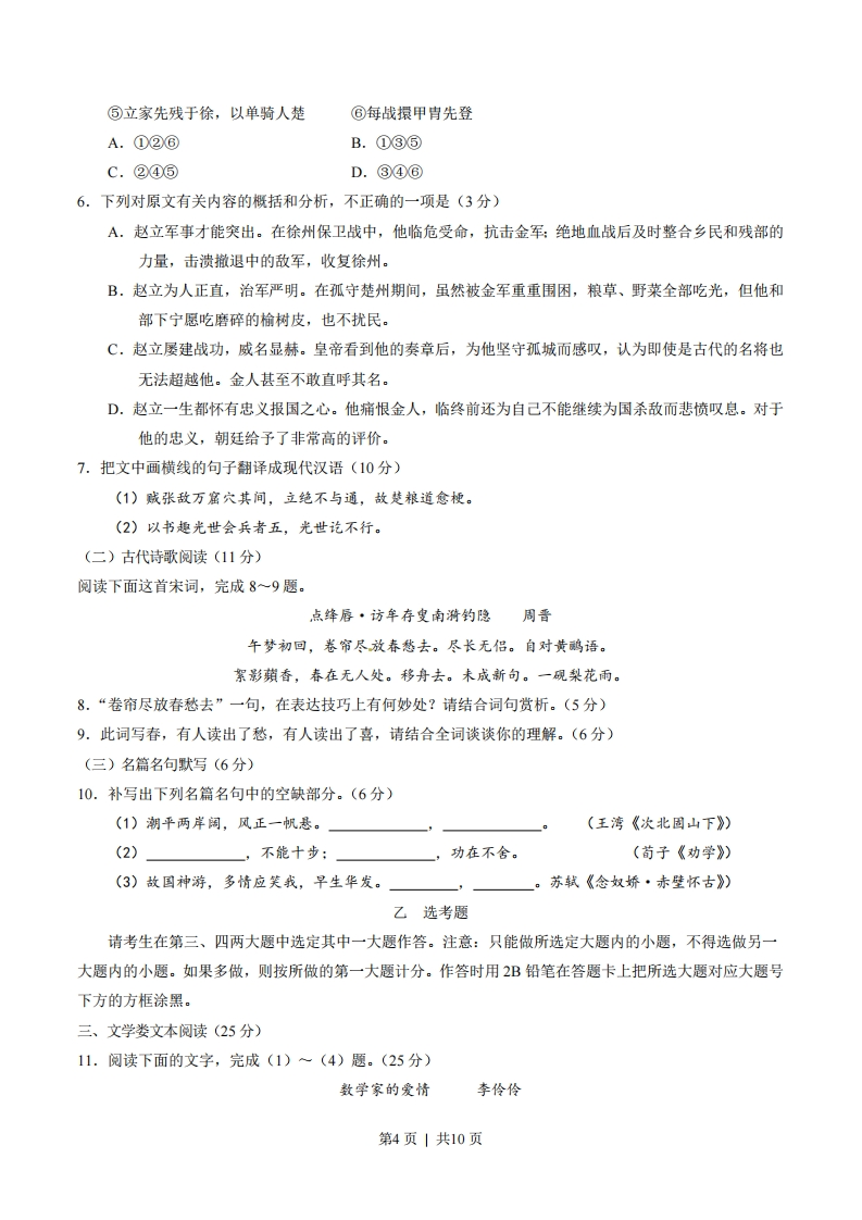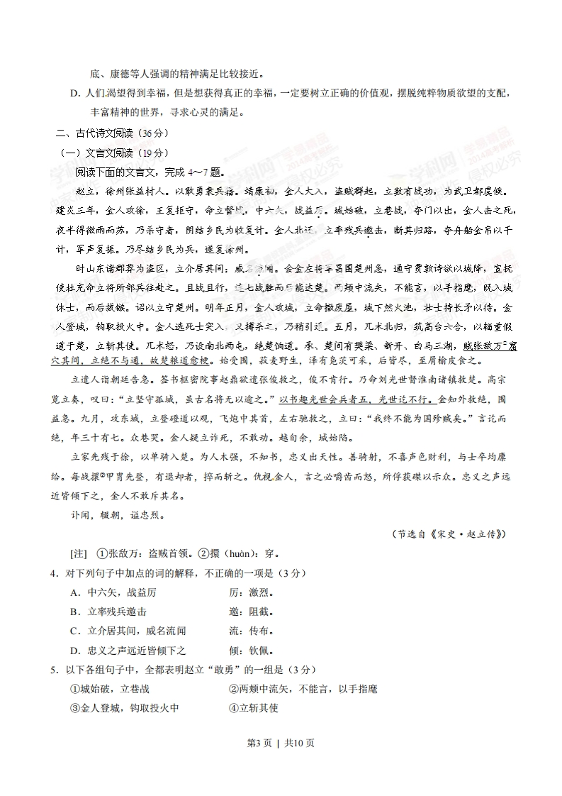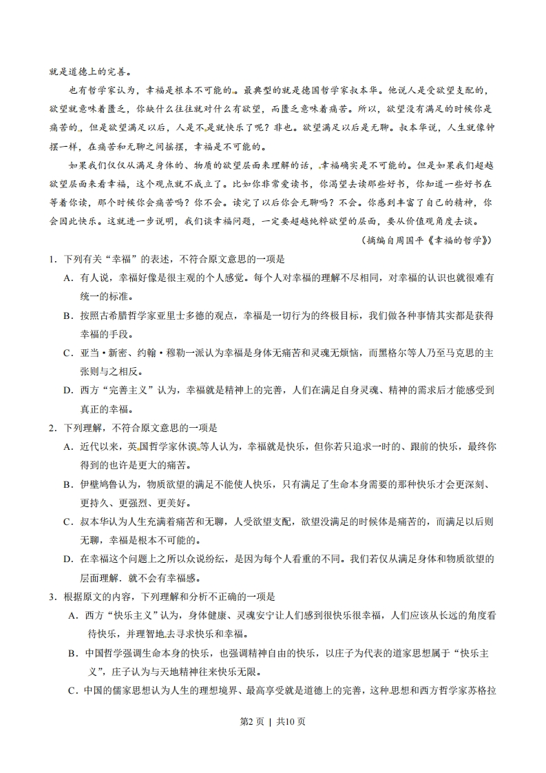绝密★启封前2014年普通高等学校招生全国统一考试(辽宁卷)话文注意事项:1.本试卷分第I卷(阅读题)和第Ⅱ卷(表达题)两部分。答卷前,考生务必将自己的姓名、准考证号填写在答题卡上。2.作答时,将答案写在答题卡上。写在本试卷上无效。3.考试结束后,将本试卷和答题卡一并交回。第I卷阅读题甲必考题一、现代文阅读(9分,每小题3分)阅读下面的文字,完成1~3题。有人会说,幸福这个东西很难说,好像是很主观的感觉,很难有统一的标准。确实是这样,每个人对幸福的理解是不一样的。但是,你若深入地问为什么会不一样,其实还是有标准的。一个人对幸福的理解,从大的方面来说,其实是体现了价值观的,就是你究竞看重什么。古希腊哲学家亚里士多德曾经说过:幸福是我们一切行为的终极目标,我们做所有的事情其实都是手段。一个人想要赚钱赚得多一点,这本身并不是目的,他是为了因此可以过上幸福的生活。有人可能就要反驳了:我不要那么多钱,也可以幸福。比如说我读几本好书,就会感到很幸福。其实对后一种人来说,读书就是他获得幸福的手段。对于什么是幸福,西方哲学史上主要有两种看法、两个派别。一派叫做“快乐主义”,其创始人是古希腊哲学家伊壁鸠鲁。近代以来,英国的一些哲学家,如亚当·斯密、约翰·穆勒、休漠对此也有所阐发。这一派认为,幸福就是快乐。但什么是快乐?快乐就是身体的无痛苦和灵魂的无领恼。身体健康、灵魂安宁就是快乐,就是幸福。他们还特别强调一点,人要从长远来看快乐,要理智地去寻求快乐。你不能为了追求一时的、眼前的快乐,而给自己埋下一个痛苦的祸根,结果得到的可能是更大的痛苦。另一派叫做“完善主义”。完善主义认为,幸福就是精神上的完善,或者说道德上的完善。他们认为人身上最高贵的部分,是人的灵魂,是人的精神。你要把这部分满足了,那才是真正的幸福。这一派的代表人物是苏格拉底、康德、黑格尔等,包括马克思,他们强调的是人的精神满足。这两派有一个共同之处,那就是,都十分强调精神上的满足。如伊壁鸠鲁强调,物质欲望的满足本身不是快乐,物质欲望和生命本身的需要是两码事。生命需要得到满足那是一种快乐,但是超出生命需要的那些欲望反而是造成痛苦的根源。约翰·穆勒则强调,幸福就是快乐,但是快乐是有质量和层次的区别的,一个人只有各种快乐都品尝过了,他才知道哪一种快乐更深刻、更持久、更强烈、更美好。在中国哲学里,我感觉,道家比较接近“快乐主义”,尤其是庄子强调生命本身的快乐,还强调精神自由的快乐,与天地精神相往来的快乐。儒家比较接近“完善主义”,儒家认为人生的理想境界、最高的享受第1页|共10页就是道德上的完善。也有哲学家认为,幸福是根本不可能的。最典型的就是德国哲学家叔本华。他说人是受欲望支配的,欲望就意味希匮乏,你缺什么往往就对什么有欲望,而匮乏意味着痛苦。所以,欲望没有满足的时候你是痛苦的,但是欲望满足以后,人是不是就快乐了呢?非也。欲望满足以后是无聊。叔本华说,人生就像钟摆一样,在痛苦和无聊之间摇摆,幸福是不可能的。如果我们仅仅从满足身体的、物质的欲望层面来理解的话,幸福确实是不可能的。但是如果我们超越欲望层面来看幸福,这个观点就不成立了。比如你非常爱读书,你渴望去读那些好书,你知道一些好书在等着你读,那个时候你会痛苦吗?你不会。读完了以后你会无聊吗?不会。你感到丰富了自己的精神,你会因此快乐。这就进一步说明,我们谈幸福问题,一定要超越纯粹欲望的层面,要从价值观角度去谈。(摘编自周国平《幸福的哲学》)1.下列有关“幸福”的表述,不符合原文意思的一项是A,有人说,幸福好像是很主观的个人感觉。每个人对幸福的理解不尽相同,对幸福的认识也就很难有统一的标准。B.按照古希腊哲学家亚里士多德的观点,幸福是一切行为的终极目标,我们做各种事情其实都是获得幸福的手段C.亚当·新密、约翰·穆勒一派认为幸福是身体无痛苦和灵魂无烦恼,而黑格尔等人乃至马克思的主张则与之相反。D.西方“完善主义”认为,幸福就是精神上的完善,人们在满足自身灵魂、精神的需求后才能感受到真正的幸福。2.下列理解,不符合原文意思的一项是A.近代以来,英国哲学家休谟等人认为,幸福就是快乐,但你若只追求一时的、跟前的快乐,最终你得到的也许是更大的痛苦。B.伊壁鸠鲁认为,物质欲望的满足不能使人快乐,只有满足了生命本身需要的那种快乐才会更深刻、更持久、更强烈、更美好。C.叔本华认为人生充满着痛苦和无聊,人受欲望支配,欲望没满足的时候体是痛苦的,而满足以后则无聊,幸福是根本不可能的。D.在幸福这个问题上之所以众说纷纭,是因为每个人看重的不同。我们若仅从满足身体和物质欲望的层面理解.就不会有幸福感。3.根据原文的内容,下列理解和分析不正确的一项是A.西方“快乐主义”认为,身体健康、灵魂安宁让人们感到很快乐很幸福,人们应该从长远的角度看待快乐,并理智地去寻求快乐和幸福。B.中国哲学强调生命本身的快乐,也强调精神自由的快乐,以庄子为代表的道家思想属于“快乐主义”,庄子认为与天地精神往来快乐无限。C.中国的儒家思想认为人生的理想境界、最高享受就是道德上的完善,这种思想和西方哲学家苏格拉第2页|