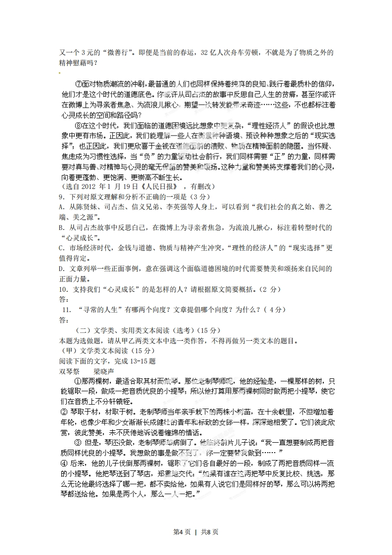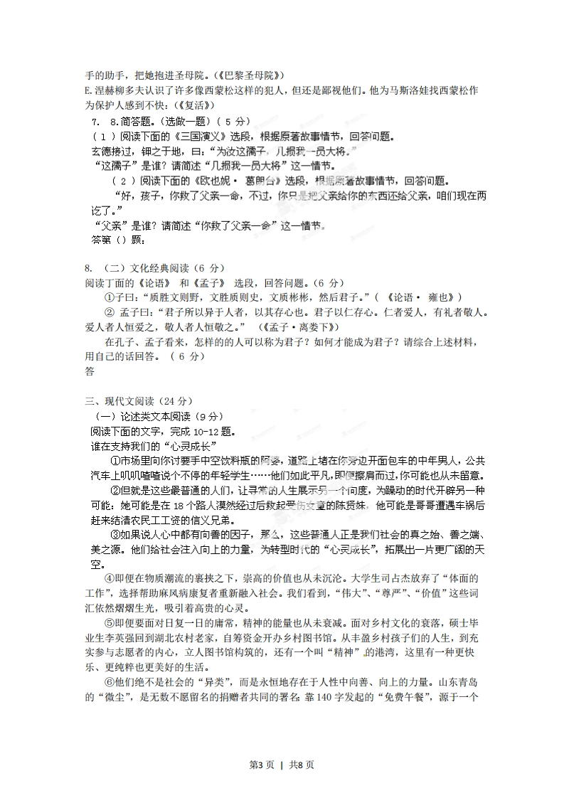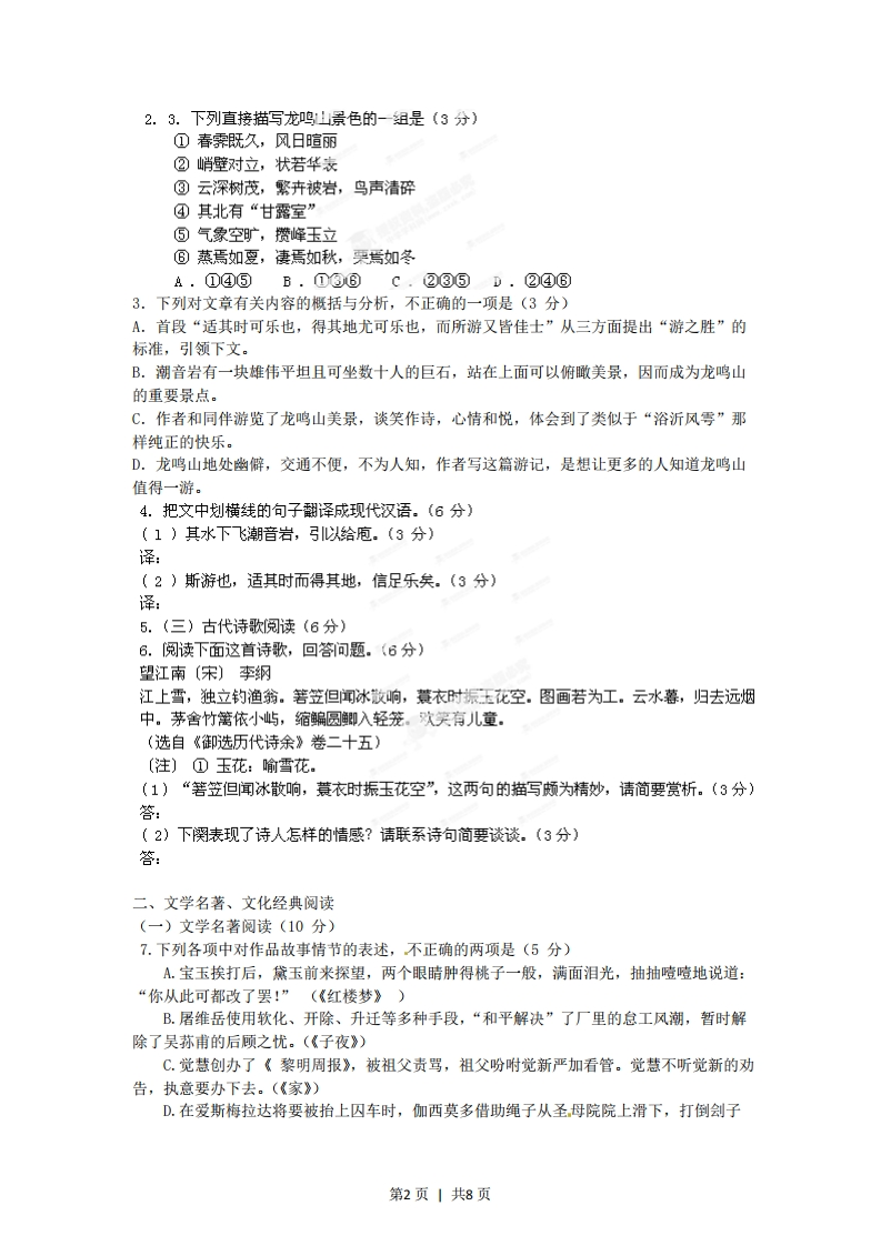 2012年普通高等学校招全国统一考试语文福建卷一、古代诗文阅读(27分)(一)默写常见的名句名篇(6分)1,补写出下列名句名篇中的空缺部分。(6分)(1),三岁食贫。《诗经·氓》)(2)群贤毕至,·(王羲之《兰亭集序》)(3)风急天高猿啸哀,。(杜甫《登高》)(4),孰能无惑?(韩愈《师说》)(5)移郁青青。(范仲淹《岳阳楼记》)(6)浩荡离愁白日斜,·(龚自珍《己亥杂诗》)(二)文言文阅读(15分)阅读下面的文言文,完成2-5题。阅读下面的文言文,完成2一5题。游龙鸣山记【明】陶安游之胜者,适其时可乐也,得其地尤可乐也,而所游又皆佳士,则所以宣其和、舒其郁、畅其心而发其文者,盖乐焉而不失乎正也。至元丙子二月甲午,厚斋严君治酒肴,招子游龙鸣山,即无想山也。时春雾既久,风日喧丽,耆英少俊,序齿而行,鼓吹前导。从蓝溪东南行五六里,两山峙如双溯,相距百步,绵亘东趋。中夹石田,田右小路,随两山势深窅曲折。行三四里,隘不宜田,仅可为路。又数里,山益奇峻,轻岚暖霭,微袭襟帽。山外崇峰复峰,杳无穷极。少焉,峭壁对立,状若华表,松衫万章①,夹路北转。洞多石底,云深树茂,繁卉被岩,鸟声清碎,似非人间世。僧舍雄丽,榜曰“禅寂”。门外独松古秀,大连数抱。修篁干霄,森列门内。寺长老出迎客,延坐后堂,匾曰“白云深处”。其西有“听松杆”,又西即韩熙载读书堂遗址,所植桧扰存。其北有“甘露室”。又北,上为“招云亭”,气象空旷,攒峰玉立,视向所历群山,低俯其顶矣。遂蹑蹬至潮音岩,怪石异态百出。同游者疲于跻攀,于是止焉。子以未登绝顶为怏,与三二友决意直上。地势斗峻,褰裳②援萝,履苍莽中。上有天池沆瀁④,其水下飞潮音岩,引以给庖。其西绝顶,巨石雄坦,可坐数十人。渺焉四顾,心目豁然。其东绝顶。视西又高,倦不欲登,还饮“白云深处”。于时暖气薰席,蒸焉知夏,凄焉如秋,栗焉如冬,觥筹无算,谈笑甚欢,虽从者乐工各适其意。酒既,长老引客看花,徐行登环早阁。己而与长老别,出寺门。行几一里,众以兴未尽,席地坐,分韵赋诗者久之,诗成而归。斯游也,适其时而得其地,信足乐矣。但溧之为州,非通都要路,兼是山隐于邃奥,故无前贤题咏及当代名笔发其幽潜,予故表而出之。鸣呼!乐而不失乎正者,浴沂风零也。兰亭之会,乃或感慨悲戚。今同游者心平气易④,发言为诗,皆有可现,其亦乐之正者欤!遂记兹游之胜,使无想山得以著于世云。(选自《陶学士集》,文字略有改动)【注】①章:大材。②褰裳:撩起衣裳。③沆灌:水深广的样子。④心平气易:心情和悦。1.对下列加点词的解释,不正确的一项是(3分)A.杳无穷极杳:深远B.修篁干霄干:冲C.延坐后堂延:延请D.履苍莽中履:鞋子第1页1共8页2.3.下列直接描写龙鸣山景色的-组是(3分)①春霁既久,风日暄丽②峭壁对立,状若华表③云深树茂,繁卉被岩,鸟声清碎④其北有“甘露室”⑤气象空旷,攒峰玉立⑥蒸焉如夏,凄焉如秋,栗焉如冬A.①④⑤B.①③回c.②③⑤D.②④⑥3.下列对文章有关内容的概括与分析,不正确的一项是(3分)A.首段“适其时可乐也,得其地尤可乐也,而所游又皆佳士”从三方面提出“游之胜”的标准,引领下文。B.潮音岩有一块雄伟平坦且可坐数十人的巨石,站在上面可以俯瞰美景,因而成为龙鸣山的重要景点。C.作者和同伴游览了龙鸣山美景,谈笑作诗,心情和悦,体会到了类似于“浴沂风雩”那样纯正的快乐。D.龙鸣山地处幽僻,交通不便,不为人知,作者写这篇游记,是想让更多的人知道龙鸣山值得一游。4.把文中划横线的句子翻译成现代汉语。(6分)(1)其水下飞潮音岩,引以给庖.(3分)译:(2)斯游也,适其时而得其地,信足乐矣。(3分)译:5.(三)古代诗歌阅读(6分)6.阅读下面这首诗歌,回答问题。(6分)望江南〔宋)李纲江上雪,独立钓渔翁。箬笠但闻冰散响,蓑衣时振玉化空。图画若为工。云水暮,归去远烟中。茅舍竹篱依小屿,缩鳊圆即入轻笼。欢笑有儿童。(选自《卸选历代诗余》卷二十五】(注)①玉花:喻雪花。(1)“箬笠但闻冰散响,蓑衣时振玉花空”,这两句的描写颇为精妙,请简要赏析。(3分)答:(2)下阕表现了诗人怎样的情感?请联系诗句简要谈谈。(3分)答:二、文学名著、文化经典阅读(一)文学名著阅读(10分)7.下列各项中对作品故事情节的表述,不正确的两项是(5分)A.宝玉挨打后,黛玉前来探望,两个眼睛肿得桃子一般,满面泪光,抽抽噎噎地说道:“你从此可都改了罢!”(《红楼梦》)B.屠维岳使用软化、开除、升迁等多种手段,“和平解决”了厂里的怠工风潮,暂时解除了吴荪甫的后顾之忧。(《子夜》)C.觉慧创办了《黎明周报》,被祖父责骂,祖父吩附觉新严加看管。觉慧不听觉新的劝告,执意要办下去。(《家》)D.在爱斯梅拉达将要被抬上囚车时,伽西莫多借助绳子从圣母院院上滑下,打倒刽子第2页1共8页手的助手,把她抱进圣母院。(《巴黎圣母院》)E.涅赫柳多夫认识了许多像西蒙松这样的犯人,但还是鄙视他们。他为马斯洛娃找西蒙松作为保护人感到不快:(《复活》)7.8.简答题。(选做一题)(5分)(1)阅读下面的《三国演义》选段,根据原著故事情节,回答问题。玄德接过,钾之于地,日:“为汝这孺子,几损我一员大将。”“这孺子”是谁?请简述“几损我一员大将”这一情节。(2)阅读下面的《欧也妮·葛朗台》选段,根据原著故事情节,回答问题。“好,孩子,你救了父亲一命,不过,你只是把父亲给你的东西还给父亲,咱们现在两讫了.
