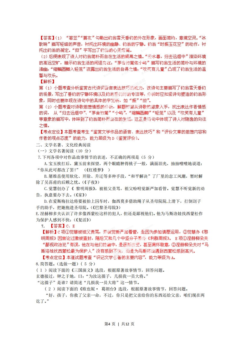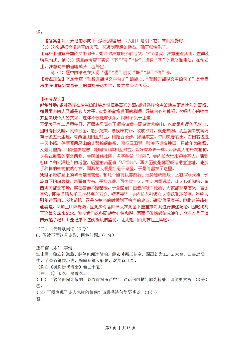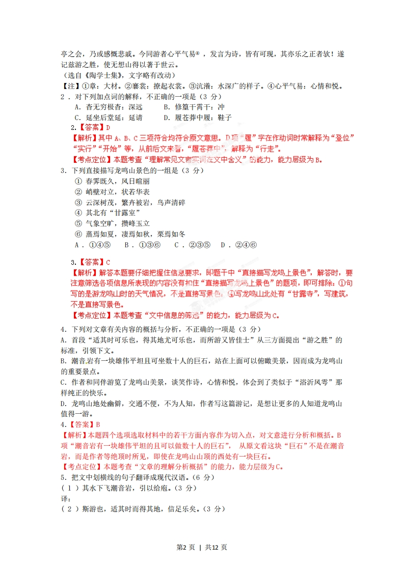 2012年普通高等学校招全国统一考试语文福建卷解析一、古代诗文阅读(27分)(一)默写常见的名句名篇(6分)1·补写出下列名句名篇中的空缺部分。(6分)(1),三岁食贫。(《诗经·氓》)(2)群贤毕至,。(王羲之《兰亭集序》)(3)风急天高猿啸哀,。(杜甫《登高》)(4),孰能无惑?(韩愈《师说》)(5),郁郁青青。(范仲淹《岳阳楼记》)(6)浩荡离愁白日斜,。(龚自珍《己亥杂诗》)1.【答案】(1)自我徂尔,(2)少长感集,(3)渚清沙白鸟飞回,(4)人非生而知之者,(5)岸芷汀兰,(6)吟鞭东指即天涯.【解析】本题所考查的六句都是教材中的常见名篇,应重视重点篇目,尽量避免不应有的失误。本题需要规范书写,考生失误往往在于书写出现错漏。此如“自我徂尔”中的“徂”,“岸芷汀兰”中的“芷”“汀”,“吟鞭东指”中的“吟”等都是考生容易出错的字词。【考点定位】本题考查考生“默写常见的名句名篇”的能力,能力层级为A(识记)。(二)文言文阅读(15分)阅读下面的文言文,完成2-5题。阅读下面的文言文,完成2一5题。游龙鸣山记【明】陶安游之胜者,适其时可乐也,得其地尤可乐也,而所游又皆佳士,则所以宣其和、舒其郁、畅其心而发其文者,盖乐焉而不失乎正也。至元丙子二月甲午,厚斋严君治酒肴,招子游龙鸣山,即无想山也。时春雾既久,风日喧丽,耆英少俊,序齿而行,鼓吹前导。从蓝溪东南行五六里,两山峙如双阙,相距百步,绵亘东趋。中夹石田,田右小路,随两山势深窅曲折。行三四里,隘不宜田,仅可为路。又数里,山益奇峻,轻岚暖霭,微袭襟帽。山外崇峰复峰,杳无穷极。少焉,峭壁对立,状若华表,松衫万章①,夹路北转。洞多石底,云深树茂,繁卉被岩,鸟声清碎,似非人间世。僧舍雄丽,榜曰“禅寂”。门外独松古秀,大连数抱。修篁干霄,森列门内。寺长老出迎客,延坐后堂,匾曰“白云深处”。其西有“听松杆”,又西即韩熙载读书堂遗址,所植桧扰存。其北有“甘露室”。又北,上为“招云亭”,气象空旷,攒峰玉立,视向所历群山,低俯其顶矣。遂蹑蹬至潮音岩,怪石异态百出。同游者疲于跻攀,于是止焉。予以未登绝顶为快,与三二友决意直上。地势斗峻,褰裳援萝,履苍莽中。上有天池沆瀁,其水下飞潮音岩,引以给庖。其西绝顶,巨石雄坦,可坐数十人。渺焉四顾,心目豁然。其东绝顶.视西又高,倦不欲登,还饮“白云深处”。于时暖气薰席,蒸焉知夏,凄焉如秋,栗焉如冬,觥筹无算,谈笑甚欢,虽从者乐工各适其意。酒既,长老引客看花,徐行登环早阁。已而与长老别,出寺门。行几一里,众以兴未尽,席地坐,分韵赋诗者久之,诗成而归。斯游也,适其时而得其地,信足乐矣。但溧之为州,非通都要路,兼是山隐于邃奥,故无前贤题咏及当代名笔发其幽潜,子故表而出之。鸣呼!乐而不失乎正者,浴沂风零也。兰第1页1共12页亭之会,乃或感慨悲戚。今同游者心平气易④,发言为诗,皆有可现,其亦乐之正者欤!遂记兹游之胜,使无想山得以著于世云。(选自《陶学士集》,文字略有改动)【注】①章:大材。②褰裳:撩起衣裳。③沆養:水深广的样子。④心平气易:心情和悦。2·对下列加点词的解释,不正确的一项是(3分)A.杳无穷极杳:深远B.修篁干霄干:冲C.延坐后堂延:延请D.履苍莽中履:鞋子2.【答案】D【解析】其中A、B、C三项符合均符合原文意思。D项“履”字在作动词时常解释为“登位”“实行”“开始”等,从前后文来看,“履苍莽中”,解释为“行走”。【考点定位】本题考查“理解常见文言买词在文中含义”的能力,能力层级为B。3.下列直接描写龙鸣山景色的一组是(3分)①春霁既久,风日喧丽②峭壁对立,状若华表③云深树茂,繁卉被岩,鸟声清碎④其北有“甘露室”⑤气象空旷,攒峰玉立⑥蒸焉如夏,凄焉如秋,栗焉如冬A.①④⑤B.①③⑥C.②③⑤D.②④⑥3.【答案】c【解析】解答本题要仔细把握住信息要求,即题干中“直接描写龙鸣上景色”,解答时,要注意筛选各项信息所表现的内容没有扣住“直接描写龙鸡上景色”的题项,即可排除:①句写的是游龙鸣山时的天气情况,不是直接写黑色:④写龙鸣山北处有“甘露寺”,写建筑,不是直接写景色.【考点定位】本题考查“文中信息的筛远”的能力,能力层级为C4.下列对文章有关内容的概括与分析,不正确的一项是(3分)A.首段“适其时可乐也,得其地尤可乐也,而所游又皆佳士”从三方面提出“游之胜”的标准,领下文。B.潮音岩有一块雄伟平坦且可坐数十人的巨石,站在上面可以俯瞰美景,因而成为龙鸣山的重要景点。C.作者和同伴游览了龙鸣山美景,谈笑作诗,心情和悦,体会到了类似于“浴沂风雩”那样纯正的快乐。D.龙鸣山地处幽僻,交通不便,不为人知,作者写这篇游记,是想让更多的人知道龙鸣山值得一游。4.【答案】B【解析】本题四个选项选取材料中的若干方面内容作为切入点,对文意进行分析和概括。B项“潮音岩有一块雄伟平坦的且可以做数十人的巨石”,从原文看这块“巨石”不是在潮音岩,而是作者等绝顶时所见,即使在龙鸣山山顶的西处有一块巨石。【考点定位】本题考查“文章的理解分析概括”的能力,能力层级为C。5.把文中划横线的句子翻译成现代汉语。(6分)(1)其水下飞潮音岩,引以给庖。(3分)译:(2)斯游也,适其时而得其地,信足乐矣。(3分)第2页|共12页译:5.【答案】(1)天池的水向下飞泻到朝音岩,(人们)接引〔它)来供给厨房。(2)这次游览恰逢适宜的天