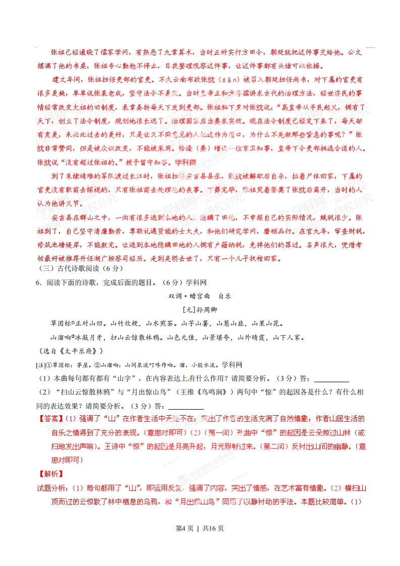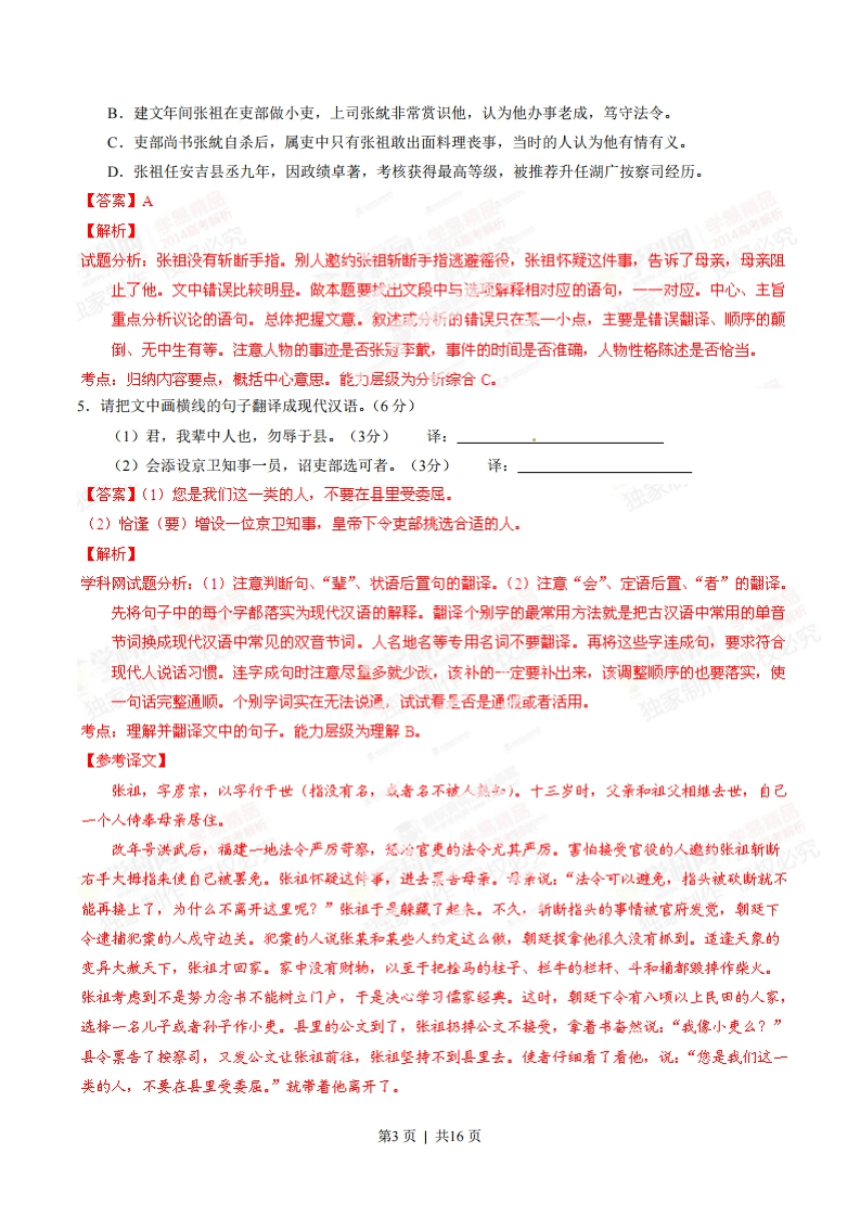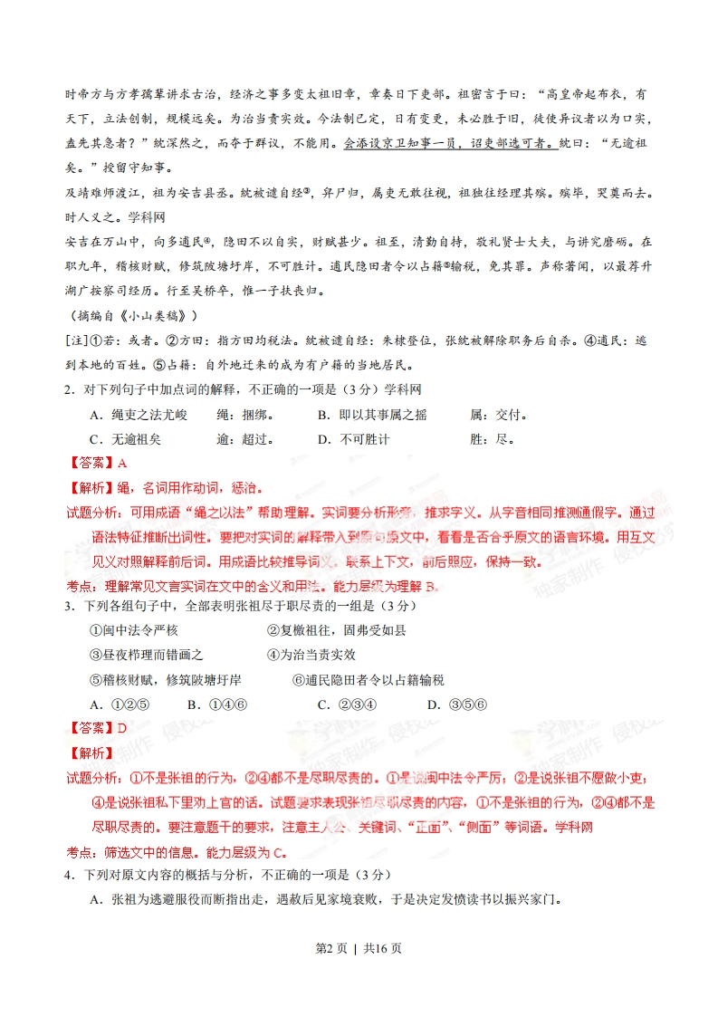 绝密大启封前2014年普通高等学校招生全国统一考试(福建卷)语文一、古代诗文阅读(27分)(一)默写常见的名句名篇(6分)1.补写出下列名句名篇中的空缺部分。(1)顺风而呼,声非加疾也,(荀子《劝学》)(2)往来无白丁。(刘禹锡。《陋室铭》)(3)心远地自偏。(陶渊明《饮酒》)(4)我寄愁心与明月,(李白《闻王昌龄左迁龙标遥有此寄》)(5)庄生晓梦迷蝴蝶,(李商隐《锦瑟》学科网(6)斜阳草树,人道寄奴曾住。(辛弃疾《永遇乐》)【答案】(1)而闻者彰(2)谈笑有鸿儒(3)问君何能尔(4)随风直到夜郎西(5)望帝春心托杜鹃(6)寻常巷陌【解析】学科网试题分析:注意“彰、儒、巷陌”的书写。本题较为商单,选择的都是名句。李白《闻王昌龄左迁龙标遥有此寄》(杨花落尽子规啼)是今年新增的篇目。敏这类题,可以根据上句或下句推导提醒。内容提示的默写,可先在头脑中默背有关内容,选取与提示相对应的内容默写。要注意养成“一字不差”的习惯。考点:默写常见的名句名篇。能力层级为识记A。(二)文言文阅言(15分)阅读下文面的文言文,完成2~5题。张祖传[明]张岳张祖,字彦宗,以字行。十三岁,父祖继殁,独奉母以居。洪武改元,闽中法令严核,绳吏之法尤峻。惮应役者邀祖斩右大指以自黜。祖疑之,入白母。母曰:“法可避也,指斩不可复续,盍去诸?”遂避匿。未几,斩指事觉,诏逮捕戍边。犯者言张某始与某辈约如此。逮久弗获。会天变肆放,乃归。室中空虚,至系马槛牛,毁斗桶为薪。念非力学无以树门户,于是决意习儒业。是时,诏民田八顷以上家,择子若①孙一人为吏。县撇至,祖挥之弗受,执卷奋曰:“吾而吏耶?”令白按察司,复檄祖往,固弗受如县。使者熟视之,曰:“君,我辈中人也,勿辱于县。”遂扶以去。祖既通儒术,兼晓九章算法。时方行方田⑦令,即以其事属之。文案盈几,祖精勒不舍,昼夜栉理而错画之,皆有绪可按据。建文时,祖为吏部吏。未几,云南布政张公召入为尚书,于属吏多所更易,独言张某老成,守法不易也。第1页|共16页时帝方与方孝孺辈讲求古治,经济之事多变太祖旧章,章奏日下吏部。祖密言于曰:“高皇帝起布衣,有天下,立法创制,规模远矣。为治当责实效。今法制已定,日有变更,未必胜于旧,徒使异议者以为口实,盘先其急者?”然深然之,而夺于群议,不能用。会添设京卫知事一员,诏吏部选可者。就曰:“无逾祖矣。”授留守知事。及靖难师渡江,祖为安吉县丞。统被谴自经@,舁尸归,属吏无敢往视,祖独往经理其殡。殡毕,哭奠而去时人义之。学科网安吉在万山中,向多逋民④,隐田不以自实,财赋甚少。祖至,清勤自持,敬礼贤士大夫,与讲究磨砺。在职九年,稽核财赋,修筑陂塘圩岸,不可胜计。逋民隐田者令以占籍输税,免其罪。声称著闻,以最荐升湖广按察司经历。行至吴桥卒,惟一子扶丧归。(摘编自《小山类稿》)[注]①若:或者。②方田:指方田均税法。紞被谴自经:朱棣登位,张统被解除职务后自杀。④逋民:逃到本地的百姓。⑤占籍:自外地迁来的成为有户籍的当地居民。2.对下列句子中加点词的解释,不正确的一项是(3分)学科网A.绳吏之法尤峻绳:捆绑。B.即以其事属之摇属:交付。C.无逾祖矣逾:超过。D.不可胜计胜:尽。【答案】A【解析】绳,名词用作动词,惩治。试题分析:可用成语“绳之以法”帮助理解。实词要分析形旁,推求字义。从字音相同推测通假字。通过语法特征推断出词性。要把对实词的解释带入到原句原文中,看看是否合乎原文的语言环境。用互文见义对照解释前后词。用成语此较推导词以。联系上下文,前后照应,保持一致。考点:理解常见文言实词在文中的含义和用法。能力层级为理解B3.下列各组句子中,全部表明张祖尽于职尽责的一组是(3分)①闽中法令严核②复檄祖往,固弗受如县③昼夜栉理而错画之④为治当责实效⑤稽核财赋,修筑陂塘圩岸©逋民隐田者令以占籍输税A.①②⑤B.①④©C.②③④D.③⑤⑥【答案】D【解析】试题分析:①不是张祖的行为,②④都不是尽职尽责的,①是说闽中法令严厉:②是说张祖不愿做小吏;④是说张祖私下里劝上官的话。试题求表现张祖尽职尽责的内容,①不是张祖的行为,②④都不是尽职尽责的。要注意题干的要求,注意主人公、关键词、“正面”、“侧面”等词语。学科网考点:筛选文中的信息。能力层级为C。4.下列对原文内容的概括与分析,不正确的一项是(3分)A.张祖为逃避服役而断指出走,遇赦后见家境衰败,于是决定发愤读书以振兴家门。第2页|共16页B.建文年间张祖在吏部做小吏,上司张就非常赏识他,认为他办事老成,笃守法令。C.吏部尚书张就自杀后,属吏中只有张祖敢出面料理丧事,当时的人认为他有情有义。D.张祖任安吉县丞九年,因政绩卓著,考核获得最高等级,被推荐升任湖广按察司经历。【答案】A【解析】试题分析:张祖没有斩断手指。别人邀约张祖斩断手指谜避徭役,张祖怀疑这件事,告诉了母亲,母亲阻止了他。文中错误比较明显。做本题要状出文段中与选项解释相对应的语句,一一对应。中心、主旨重点分析议论的语句。总体把握文意。叙达或分析的错误只在素一小点,主要是错误翻译、顺序的颠倒、无中生有等。注意人物的事迹是否张冠李载,事件的时间是否准确,人物性格陈述是否恰当。考点:归纳内容要点,概括中心意思。能力层级为分新综合C。5.请把文中画横线的句子翻译成现代汉语