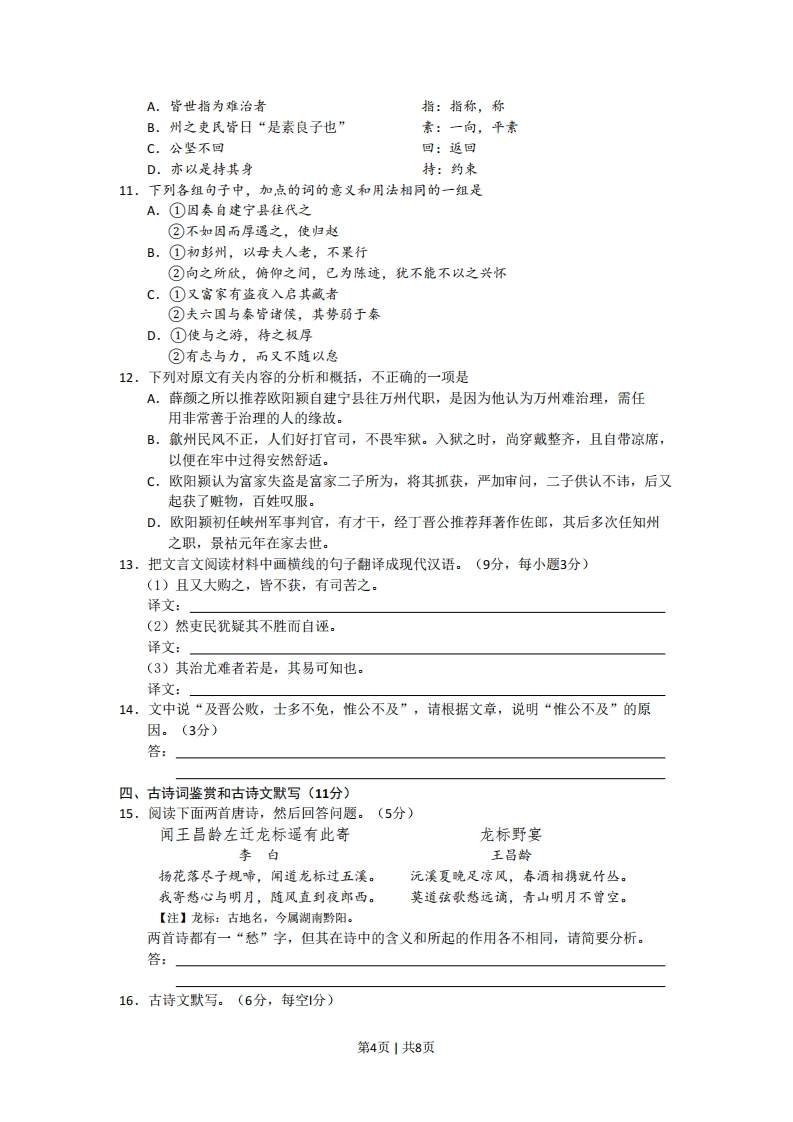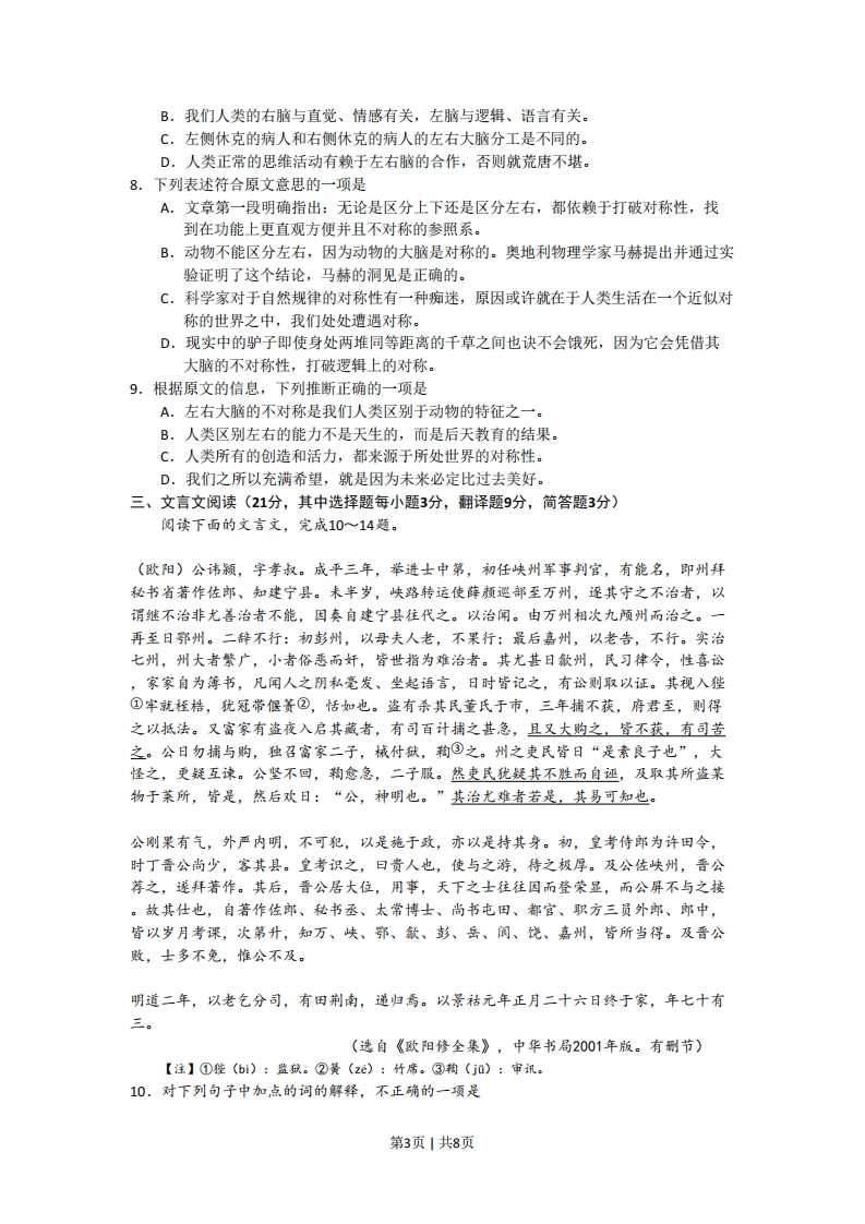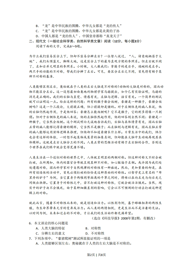 2008年普通高等学校招生全国统一考试(湖南卷)语文本试题卷共7道大题,22道小题,共8页。时量150分钟,满分150分。一、语言知识及运用(15分,每小题3分)1.下列词语中加点的字,读音全都正确的一组是A.颔联han思忖cin悄声qiao物阜民安fùB.摒弃bing咋舌ze冷然1ng倾箱倒箧qiec.沉浸jin跻身江撰写zhuan大笔如椽yuanD.宽宥you车辆1iang仓廪1in凭栏骋目cheng2.下列句子中有错别字的一句是A.聚沙成塔,集掖成裘,只有锲而不舍地学习,才能积累全面丰富的知识。B.乡村风光,甚觉宜人,野外景致,殊有情趣,远近树木参天,蔚为大观。C.他的散文和小说富有诗情画意,也不乏扣人心弦之笔和感人肺腑之言。D.在维也纳金色大厅里听到带有浓郁山野情调的中国民歌,感到别有风味。3.下列各句中加点的词语使用不恰当的一句是A.教育是打开个人智慧之门的金钥匙,也是改变国家和民族命运的铺路石,更是人类文明传续的不竭动力。B.草原上,帐篷像蘑菇一样四处散落,帐篷前篝火点点,军马安闲地吃着夜草,隐隐的斯声在大地上沉浮。C.千百年来,湘江培育着两岸的乡村和城市,湘江之水不仅流入了人们的日常生活,也荡漾在他们的梦境中。D.树立大国风范,函养大国心态,让世界看到中国的开放、包容和自信,看到中国人民的团结、理性和智慧。4.下列各句中有语病的一句是A.超越种族、信仰、社会制度的差异,增进各国人民之间的相互了解,促进和平、友谊与团结,在尊重世界多样性的基础上实现人类和谐发展,己成为奥林匹克精神的深刻内涵。B.文艺复兴揭开了欧洲腾飞的序幕,工业革命拉大了欧洲与中国的距离,当火车在欧洲大地高歌猛进的时候,中国的辽阔土地上,木制独轮车还在吱吱呀呀地唱着千年的凄凉C.风云变幻的20世纪已经过去,那些为中国的命运呐喊的诗界前辈也已经走远,在新的世纪,面对商品经济大潮的冲击,我们应该如何拨开喧嚣的迷雾,高扬起前辈诗人使命意识的旗帜?D.我国的文化遗产是我们民族悠久历史的证明,是我们与祖先沟通的重要渠道,也是我们走向未来的坚实根基,我们应当永远保持对古代文明成果的尊重和珍惜,以及祖先的缅怀和感恩。5.下列各项中最适合填在横线上的一项是每逢春节等中华传统节日,“舞龙”都是一个备受欢迎的节目。。可以说,不论天涯海角,凡是华人聚集的地方,都能看到“龙”的身影。A.中华儿女都是“龙的传人”,中国人在海外被称为唐人第1页1共8页B.“龙”是中华民族的图腾,中华儿女都是“龙的传人”C.“龙”是中华民族的图腾,中华儿女都是炎黄的子孙D.中国人都是“龙的传人”,中国皇帝都称“真龙天子”二、现代文(一般社会科学类、自然科学类文章)阅读(12分,每小题3分)阅读下面的文字,完成6~9题。为什么我们容易区分上下,但却不容易分辨左右?一位哲人说过,“人,诗意地栖居于大地”,我们头顶蓝天,脚踩大地,这是区分上下的最为直观方便的参照系。但左右就不同了,左和右并无明显的参照系。小时候,大人教我们:拿筷子的是右手,端碗的是左手。两只手的功能的不对称,帮我们分辨了左右。可见,要区分左右之不同,首先得有赖于某种不对称的基准.人类能够区别左右,奥秘就在于人类的左右大脑是不对称的!动物的大脑是对称的,因而动物不能区分左右。这一设想最初由奥地利物理学家马赫提出,如今已有实验证明,马赫的洞见是正确的。我们的右脑与直觉、情感有关,左脑与逻辑、语言有关。一个简单的测试就可以证明这一点。给出这样的问题:所有的猴子都会爬树,豪猪是一种猴子,豪猪会爬树吗?这是一个三段论,大前提正确,但小前提却是错的。对于左侧休克的病人来说,他的右脑仍然起作用,于是他回答:豪猪怎么能爬树呢?它不是猴子,它的刺多得像一只刺猬。但对于右侧休克的病人来说,他的左脑依然起作用,他的回答则全然不同:豪猪是种猴子,它当然会爬树。这个测试明白无误地告诉我们,右脑与具体情景有关,因而右脑正常的病人能够记得豪猪的模样,它当然不是猴子:而左脑则与逻辑有关,因而左脑正常的病人能够运用演绎逻辑来推理,但他却不知道豪猪长什么样。日常生活中的我们,偶尔也会有这样的体验,一时想不起某物或某景的抽象名词,但却能在大脑中生动地再现其具体模样。这就是左右大脑分工的不同。人类正常的思维活动有赖于左右脑的合作,否则这个世界在我们眼中就会变得荒唐不基。人类生活在一个近似对称的世界之中,人体就呈明显的两侧对称。但这种对称又不时会被打破,众所周知,体内的器官分布就呈现某种不对称,如心脏偏于左侧。或许因为我们处处遭遇对称,因而科学家对于自然规律的对称性有一种痴迷。然而,更加重要的却是,在所有创造性的活动中,首先必须打破的恰恰是这种原始的对称性。以哲学史上有名的“布里丹的驴子”为例,当它置身于两堆同等距离的干草之间时,将难以在向左走与向右走之间做出抉择。它置身于对称性之中,若不打破这种对称性,它就会被活活饿死。当然,现实中的驴子决不会饿死,由于某种细微差别的影响,它会以不可预测的行动去打破这种逻辑上的对称。就此而言,随着不对称性而来的,就是创造和活力。以性别为例,基于雌雄相异的两性生殖,为生命界带来无穷的变异或活力。而人类的两情相悦,更是生活而不是活着的见证。以时间为例,未来和过去的不对称,才让我们的