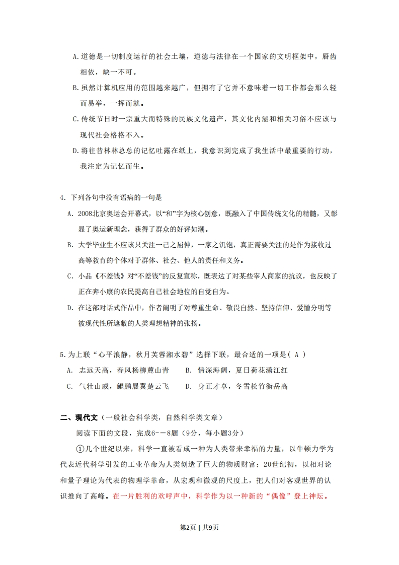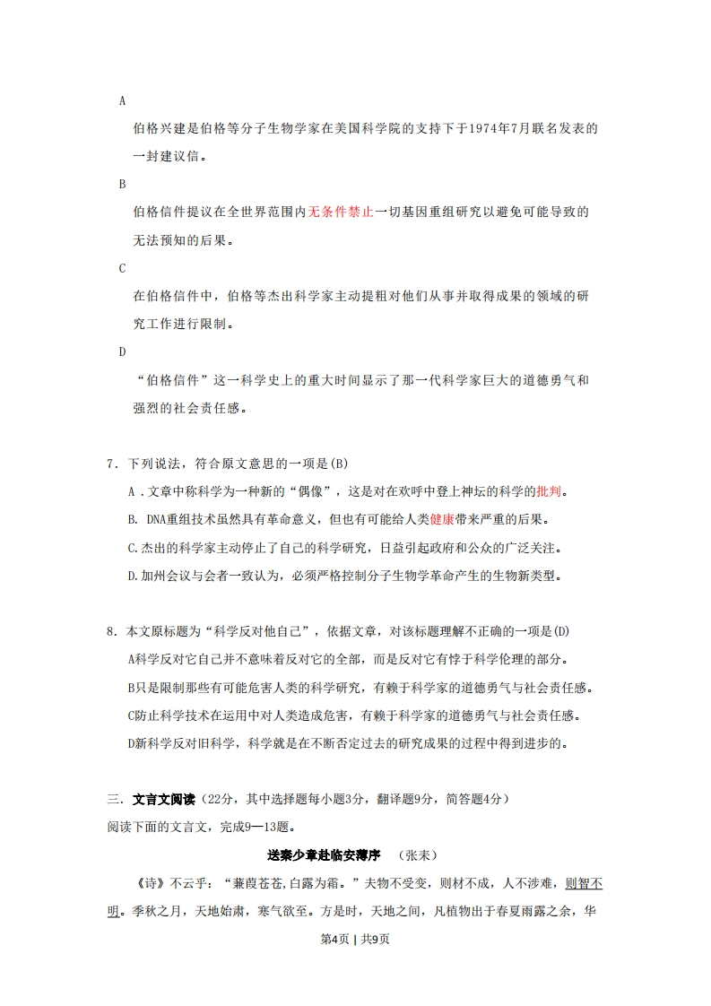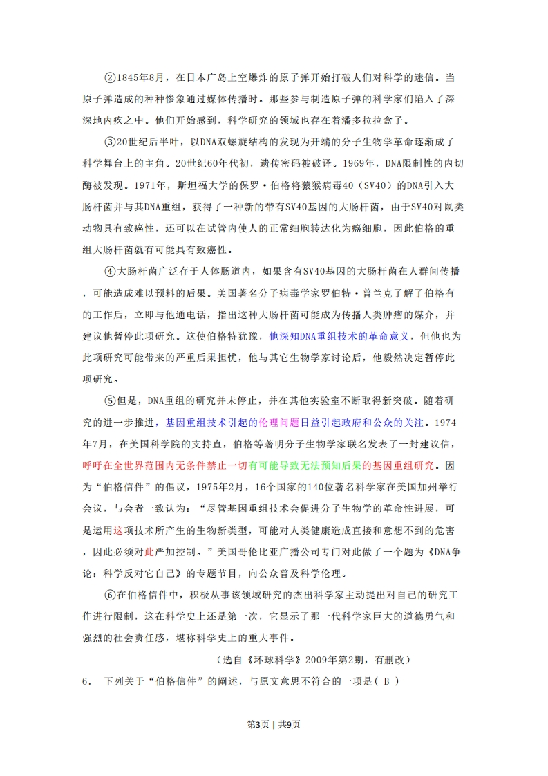 2009年普通高等学校招生全国统一考试(湖南卷)语文本试卷分第I卷(选择题)和第Ⅱ卷(非选择题)两部分。第I卷1至4页,第Ⅱ卷5至9页。考试结束后,将本试卷和答题卡一并交回。第缸卷注意事项1.答题前,考生在答题卡上务必用直径0.5毫米黑色签字笔将自己的姓名、准考证号填写清楚,并帖好条形码。请认真核准条形码的准考证号、姓名和科目。2每小题选出答案后,用2B铅笔把答题卡上对应题目的答案标号涂黑,如需改动,用橡皮擦干净后,再选涂其他答案标号。在试题卷上作答无效。3.本试卷共11小题,每小题3分,共33分。在每小题给出的四个选项中,只有一项符合要求。一、语言知识及运用(15分,每小题3分)1.下列词语中加点的字,读音全都正确的一组是A.倾慕qimg俊彦yan渲染xian嘉言懿行yiB.轩昂xuan萦绕ying酽茶yon怦然心动pingC.黏膜nian囊括nang笃信dǚ桑榆暮景mdD.脊梁ji甄别zhcn晋谒ye披肝沥胆1i2.下列句子中有错别字的一句是()A.黄帝陵前的这两颗古柏,至今依旧蓊郁苍翠,令观瞻者心中生出无限遐思。B我们与亲人相伴的每一刻,最不应该吝惜的是那份能慰籍彼此心灵的关爱。C.狗尾巴草活像狗尾,茎纤细坚挺,叶修长,它们散漫地生长在夏秋两季。D.只要孩子们如往常般走进学校读书嘻戏,希望就会萌生在灾区人们的心中。3.下列各句中加点的成语使用不恰当的一句是(B)第1页1共9页A.道德是一切制度运行的社会土壤,道德与法律在一个国家的文明框架中,唇齿相依,缺一不可。B.虽然计算机应用的范围越来越广,但拥有了它并不意味着一切工作都会那么轻而易举,一挥而就。C.传统节日时一宗重大而特殊的民族文化遗产,其文化内涵和相关习俗不应该与现代社会格格不入。D.将往昔林林总总的记忆吐露在纸上,我意识到完成了我生活中最重要的行动,我注定为记忆而生。4.下列各句中没有语病的一句是A.2008北京奥运会开幕式,以“和”字为核心创意,既融入了中国传统文化的精髓,又彰显了奥运新理念,获得了群众的好评如潮。B.大学毕业生不应该只关注一己之屈伸,一家之饥饱,真正需要关注的是作为接收过高等教育的个体对于群体、社会、他人的责任和义务。C.小品《不差钱》对“不差钱”的反复宣称,既表达了对某些宰人商家的抗议,也反映了正在奔小康的农民提高自己社会地位的自觉自为。D.在这部对话式作品中,作者阐明了对尊重生命、散畏自然、坚持信仰、爱憎分明等被现代性所遮敝的人类理想精神的张扬。5.为上联“心平浪静,秋月芙蓉湘水碧”选择下联,最合适的一项是(A)A.志远天高,春风杨柳麓山青B.情深海阔,夏日荷花潇江红C.气壮山威,鲲鹏展翼楚云飞D.身正才卓,冬雪松竹衡岳高二、现代文(一般社会科学类,自然科学类文章)阅读下面的文段,完成6-一8题(9分,每小题3分)①几个世纪以来,科学一直被看成一种为人类带来幸福的力量,以牛顿力学为代表近代科学引发的工业革命为人类创造了巨大的物质财富:20世纪初,以相对论和量子理论为代表的物理学革命,从宏观和微观的尺度上,把人们对客观世界的认识推向了高峰。在一片胜利的欢呼声中,科学作为以一种新的“偶像”登上神坛。第2页1共9页②1845年8月,在日本广岛上空爆炸的原子弹开始打破人们对科学的迷信。当原子弹造成的种种惨象通过媒体传播时。那些参与制造原子弹的科学家们陷入了深深地内疚之中。他们开始感到,科学研究的领域也存在着潘多拉拉盒子。③20世纪后半叶,以DNA双螺旋结构的发现为开端的分子生物学革命逐渐成了科学舞台上的主角。20世纪60年代初,遗传密码被破译。1969年,DNA限制性的内切酶被发现。1971年,斯坦福大学的保罗·伯格将猿猴病毒40(SV40)的DNA引入大肠杆菌并与其DNA重组,获得了一种新的带有SV40基因的大肠杆菌,由于SV40对鼠类动物具有致癌性,还可以在试管内使人的正常细胞转达化为癌细胞,因此伯格的重组大肠杆菌就有可能具有致癌性。④大肠杆菌广泛存于人体肠道内,如果含有SV40基因的大肠杆菌在人群间传播,可能造成难以预料的后果。美国著名分子病毒学家罗伯特·普兰克了解了伯格有的工作后,立即与他通电话,指出这种大肠杆菌可能成为传播人类肿瘤的媒介,并建议他暂停此项研究。这使伯格特犹豫,他深知DNA重组技术的革命意义,但他也为此项研究可能带来的严重后果担忧,他与其它生物学家讨论后,他毅然决定暂停此项研究。⑤但是,DNA重组的研究并未停止,并在其他实验室不断取得新突破。随着研究的进一步推进,基因重组技术引起的伦理问题日益引起政府和公众的关注。1974年7月,在美国科学院的支持直,伯格等著明分子生物学家联名发表了一封建议信,呼吁在全世界范围内无条件禁止一切有可能导致无法预知后果的基因重组研究。因为“伯格信件”的倡议,1975年2月,16个国家的140位著名科学家在美国加州举行会议,与会者一致认为:“尽管基因重组技术会促进分子生物学的革命性进展,可是运用这项技术所产生的生物新类型,可能对人类健康造成直接和意想不到的危害,因此必须对此严加控制。”美国哥伦比亚广播公司专门对此做了一个题为《DNA争论:科学反对它自己》的专题节目,向公众普及科学伦理。⑥在伯格信件中,积极从事该领域研究的杰出科学家主动提出对自己的研究工作进行限制,这在科学史上还是第一次,它显示了那一代科学家巨大的道德勇气和强