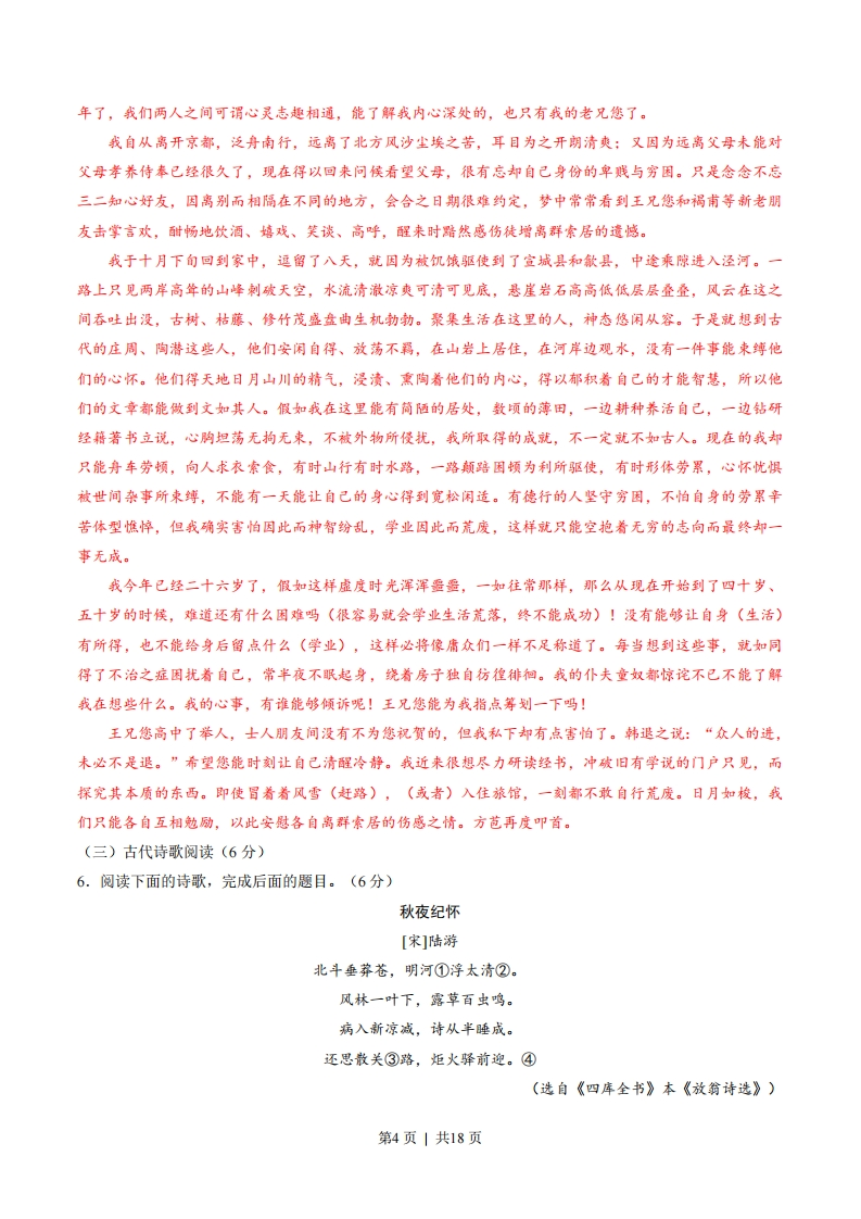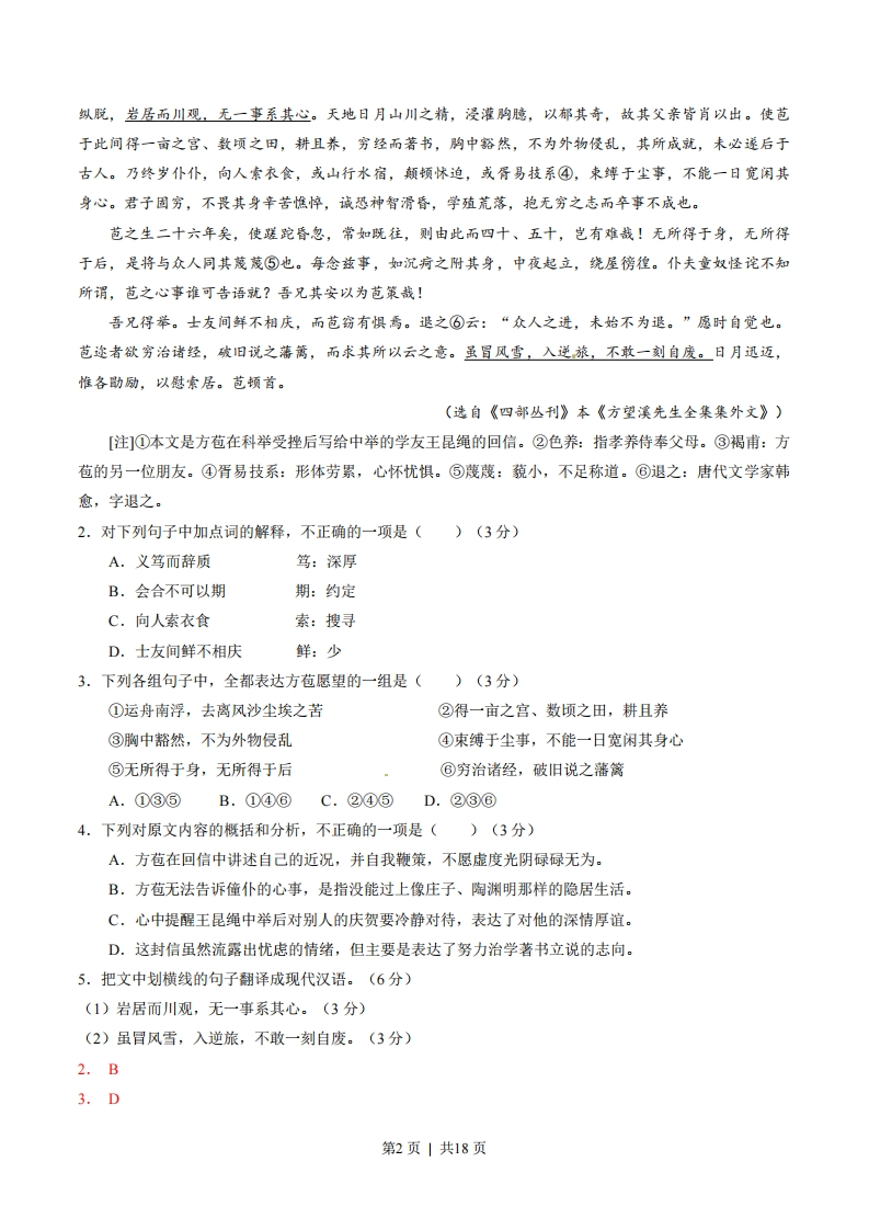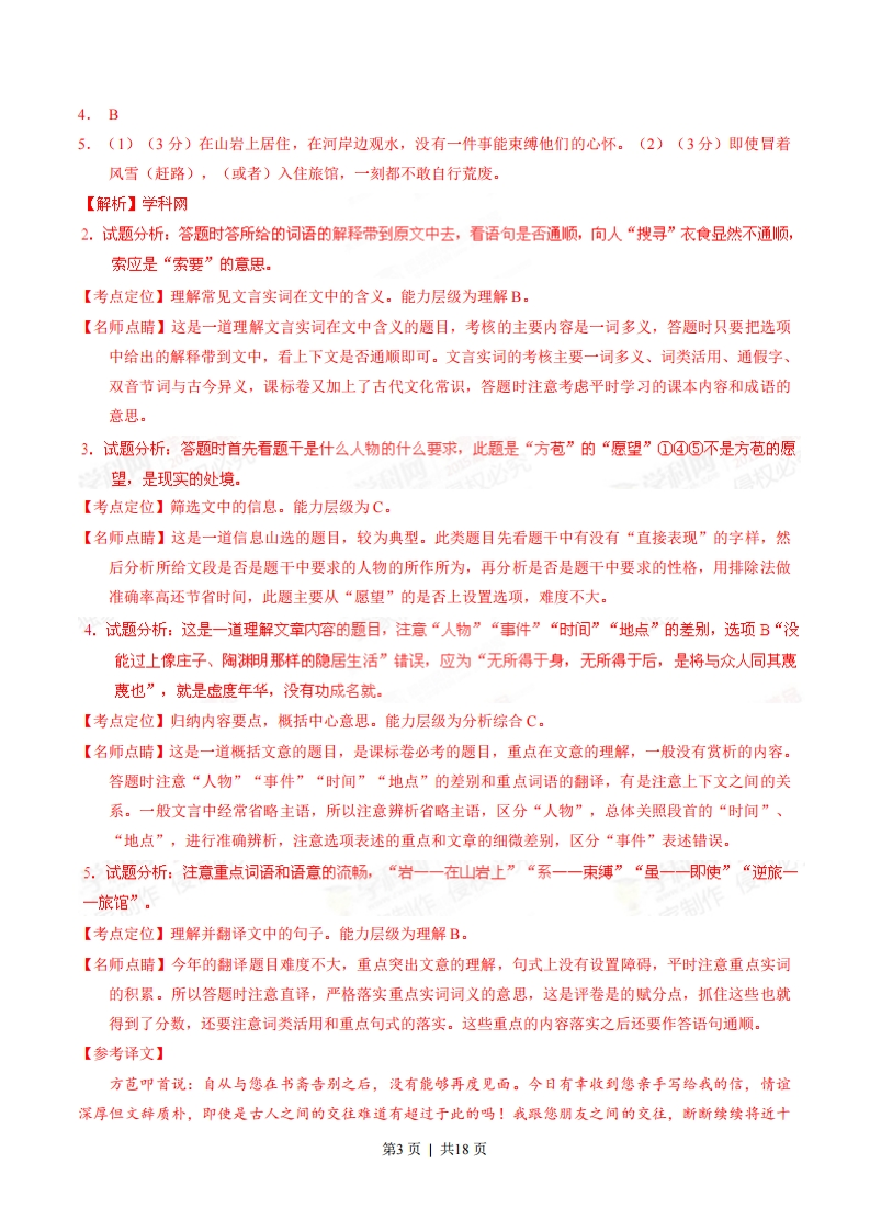 绝密★启封并使用完毕前2015年普通高等学校招生全国统一考试语文(福建卷)一、古诗文阅读(27分)(一)默写常见的名句名篇(6分)1.默写常见的名句名篇中的空缺部分。(6分)(1)入则无法家拂士,一,国恒亡。(孟子《生于忧患,死于安乐》)(2)师者,(韩愈《师说》)(3)宁溘死以流亡兮,。(屈原《离强》)(4)长河落日圆。(王维《使至塞上》)(5)家书抵万金。(杜甫《春望》)(6)夕阳西下,。(马致远《天净沙·秋思》)【答案】(1)出则无敌国外患者(2)所以传道授业解惑也(3)余不忍为此态也(4)大漠孤烟直(5)烽火连三月(6)断肠人在天涯【解析】学科网试题分析:名句默写要注意字形,而字形与字义分不开,学生应借助字义来识记字形。第二句中的“受”,是通假字,同“授”,默写的时候应注意这一文言现象,第三句应注意句末的语气词“也”,字很简单但容易忽略;第四句中的“直”,是形容大漠中一缕烽烟的状态:第五句中的“烽”,应是“火”,故字形中应包含“火”;第六句中的“涯”应注意与“崖”的区别。【考点定位】默写常见的名句名篇。能力层级为识记A。【名师点睛】高考所选择的名句大多出自课内所学篇目,只有少数来自课外,该如何识记这些课内的名句,需要一定的技巧。高考所考的名句,字不一定有多复杂,但一定很有迷惑性,考生经常在这些“浅水滩”“翻船”,原因是光背不写,光记不辨,不知道联系句意和古文的特性来区分。(二)文言文阅读(15分)阅读下面的文言文,完成2一一5题。与王昆绳书①[清]方苞苞顿首:自斋中交手,未得再见。接手书,义笃而辞质。虽古之为交者岂有过哉。苞从事朋游间近十年,心事臭味相同,知其深处,有如吾兄者乎!出都门,运舟南浮,去离风沙尘埃之苦,耳目开涤:又违膝下色养②久,得归省视,颇忘其身之贱贫。独念二三友朋,乖隔异地,会合不可以期,梦中时时见兄与褐甫③辈抵掌今故,酣嬉笑呼,觉而怛然增离索之恨。苞以十月下旬至家,留八日,便饥驱宣、歙,间入泾河。路见左右高峰刺天,水清冷见底,崖岩参差万叠,风云往还,古木、奇藤、修篁郁盘有生气。聚落居人,貌甚闲暇。团念古者庄周、陶潜之徒,逍遥第1页|共18页纵脱,岩居而川观,无一事系其心。天地日月山川之精,浸灌胸臆,以郁其奇,故其父亲皆肖以出。使苞于此间得一亩之宫、数顷之田,耕且养,穷经而著书,胸中豁然,不为外物侵乱,其所成就,未必遂后于古人。乃终岁仆仆,向人索衣食,或山行水宿,颠顿怵迫,或胥易技系④,束缚于尘事,不能一日宽闲其身心。君子固穷,不畏其身辛苦憔悴,诚恐神智滑昏,学殖荒落,抱无穷之志而卒事不成也。苞之生二十六年矣,使蹉跎昏忽,常如既往,则由此而四十、五十,岂有难哉!无所得于身,无所得于后,是将与众人同其蔑蔑⑤也。每念兹事,如沉疴之附其身,中夜起立,绕屋徬徨。仆夫童奴怪诧不知所谓,苞之心事谁可告语就?吾兄其安以为苞策哉!吾兄得举。士友间鲜不相庆,而苞窃有惧焉。退之⑥云:“众人之进,未始不为退。”愿时自觉也。苞迩者欲穷治诸经,破旧说之藩篱,而求其所以云之意。虽冒风雪,入逆旅,不敢一刻自废。日月迅迈,惟各助励,以慰索居。苞顿首。(选自《四部丛刊》本《方望溪先生全集集外文》)[注]①本文是方苞在科举受挫后写给中举的学友王昆绳的回信。②色养:指孝养侍奉父母。③褐甫:方苞的另一位朋友。④胥易技系:形体劳累,心怀忧惧。⑤蔑蔑:藐小,不足称道。⑥退之:唐代文学家韩愈,字退之。2.对下列句子中加点词的解释,不正确的一项是()(3分)A.义笃而辞质笃:深厚B.会合不可以期期:约定C.向人索衣食索:搜寻D.士友间鲜不相庆鲜:少3.下列各组句子中,全都表达方苞愿望的一组是()(3分)①运舟南浮,去离风沙尘埃之苦②得一亩之宫、数顷之田,耕且养③胸中豁然,不为外物侵乱④束缚于尘事,不能一日宽闲其身心⑤无所得于身,无所得于后⑥穷治诸经,破旧说之藩篱A.①③⑤B.①④⑥C.②④⑤D.②③⑥4.下列对原文内容的概括和分析,不正确的一项是()(3分)A.方苞在回信中讲述自己的近况,并自我鞭策,不愿虚度光阴碌碌无为。B.方苞无法告诉僮仆的心事,是指没能过上像庄子、陶渊明那样的隐居生活。C.心中提醒王昆绳中举后对别人的庆贺要冷静对待,表达了对他的深情厚谊。D.这封信虽然流露出忧虑的情绪,但主要是表达了努力治学著书立说的志向。5.把文中划横线的句子翻译成现代汉语。(6分)(1)岩居而川观,无一事系其心。(3分)(2)虽冒风雪,入逆旅,不敢一刻自废。(3分)2.B3.D第2页|共18页4.B5.(1)(3分)在山岩上居住,在河岸边观水,没有一件事能束缚他们的心怀。(2)(3分)即使冒着风雪(赶路),(或者)入住旅馆,一刻都不敢自行荒废。【解析】学科网2,试题分析:答题时答所给的词语的解释带到原文中去,看语句是否通顺,向人“搜寻”衣食显然不通顺,索应是“索要”的意思。【考点定位】理解常见文言实词在文中的含义。能力层级为理解B。【名师点睛】这是一道理解文言实词在文中含义的题目,考核的主要内容是一词多义,答题时只要把选项中给出的解释带到文中,看上下文是否通顺即可。文言实词的考核主要一词多义、词类活用、通假字、双音节词与古今异义,课标卷又加上了古代文化常识,答题时注意考虑平时学习的课本内容和成语的意思。3.试题分析:答题时首先看题干是什么人物的什么要求,此题是“方苞”的“愿望”①④⑤不是