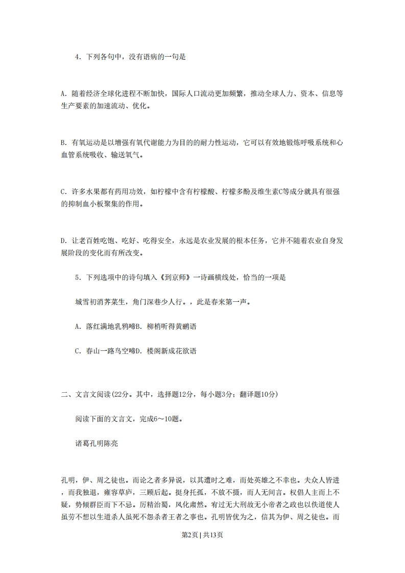 2010年湖南高考语文试题及答案本试题卷共7道大题,22道小题,共8页。时量150分钟,满分150分。一、语言文字运用(15分,每小题3分)1.下列词语中加点的字,读音全都正确的一组是A.样瑞xing馥郁fù窈窕yǎo螭宫折桂chdnB.聪颖ying仰泰mò芳警xin龙驹风雏chǘC.幽婉wǎn荣膺ying醇美shin岁稔年丰rěnD.涟漪yi富庶shù澄澈cheng,万擎争流huo2.下列各句中,有错别字的一句是A.湖南地处内陆而不能被内陆意识束缚,位居中部而不能甘居中游,这是毋庸置疑的。B.大型音乐舞蹈史诗《复兴之路》的恢弘气势和精彩表演,强烈地震撼了观众。C.素有“自如玉、明如镜、薄如纸、声如磬”之誉的景德镇瓷器,备受消费者青睐。D.候鸟们凭着体内孕藏的惊人能量,一路搏击风雨,书写了万里迁徙的生命奇迹。3.下列各句中,加点的成语使用不恰当的一句是A.中国国家馆在东方的晨曦里,在美轮美奂的世博园建筑群中,发出耀眼的中国红。B.大力倡导低碳绿色的生活方式,开发高效低耗无污染的新能源,政府责无旁贷。C.在飞驰的高速列车上,人们津津乐道地谈论着乘坐高铁出行带来的快捷与方便。D.万涓聚作河,便有了一泻千里的豪放:江河汇成海,便有了一望无际的壮阔磅礴。第1页|共13页4.下列各句中,没有语病的一句是A.随着经济全球化进程不断加快,国际人口流动更加频繁,推动全球人力、资本、信息等生产要素的加速流动、优化。B.有氧运动是以增强有氧代谢能力为目的的耐力性运动,它可以有效地锻炼呼吸系统和心血管系统吸收、输送氧气。C.许多水果都有药用功效,如柠檬中含有柠檬酸、柠檬多酚及维生素C等成分就具有很强的抑制血小板聚集的作用。D.让老百姓吃饱、吃好、吃得安全,永远是农业发展的根本任务,它并不随着农业自身发展阶段的变化而有所改变。5.下列选项中的诗句填入《到京师》一诗画横线处,恰当的一项是城雪初消荠菜生,角门深巷少人行。,此是春来第一声。A.落红满地乳鸦啼B.柳梢听得黄鹂语C.春山一路鸟空啼D.楼阁新成花欲语二、文言文阅读(22分。其中,选择题12分,每小题3分:翻译题10分)阅读下面的文言文,完成6~10题.诸葛孔明陈亮孔明,伊、周之徒也。而论之者多异说,以其遭时之难,而处英雄之不幸也。夫众人皆进,而我独退,雍容草庐,三顾后起。挺身托孤,不放不摄,而人无间言。权倡人主而上不疑,势倾群臣而下不忌。厉精治蜀,风化肃然。宥过无大刑故无小帝者之政也以佚道使人虽劳不想以生道杀人虽死不怨杀者王者之事也。孔明皆优为之,信其为伊、周之徒也。而第2页|共13页论者乃谓其自比管、乐,委身偏方,特霸者之臣尔。是何足与论孔子之仕鲁与自比老、彭哉!甚者至以为非仲达敌,此无异于儿童之见也。彼岂非以仲达之言而信之耶?而不知其言皆谲也。仲达不能逞其谲于孔明,故常伺孔明之开阖,妄为大言以谲其下。论者特未之察耳。始孔明出祁山,仲迭出兵拒之,闻孔明将芟上邦之麦,卷甲疾行,晨夜往赴。孔明粮乏己退,仲达谲言日:“吾倍道疲劳,此晓兵者之所贪也。亮不敢据渭水,此易与耳。”夫军无见粮而转军与战,纵能胜之,后何以继?此少辩事机者之所必不为也。仲达心知其然,外为失言以谲其下耳。己而孔明出斜谷,仲达又率兵拒之。知孔明兵未逼渭,引军而济,背水为垒。孔明移军且至,仲达谲言曰:“亮若勇者,当出武功依山而阵。若西上五丈原,诸军无事矣。”夫敌人之兵已在死地,而率众直进,来与之战,此亦少辨事机者之所不为也。仲达知其必不出此,姑诳为此言以妄表其怯,以示吾之能料,且以少安其三军之心也。故孔明持节制之师,不用权谲,不贪小利,彼则曰:“亮志大而不见机,多谋而少决,好兵而无权。”凡此者,皆伺孔明之开图,妄为大言以谲其下,此岂其真情也!夫善观人之真情者,不于敌存之时,而于敌亡之后。孔明之存也,仲这之言则然。及其殁也,仲达按行其营垒,敛衽而叹曰:“天下奇才也!”彼见其规矩法度,出于其所不能为,恍然自失,不觉其言之发也。可以观其真情矣。论者不此之信,而信其谲,岂非复为仲达所谲哉!唐李靖,谈兵之雄者也。吾尝读其问对之书,见其述孔明兵制之妙,曲折备至:曾不一齿仲达。彼晓兵者,固有以窥之矣。书生之论,曷为其不然也!孔明距今且千栽矣,未有能谅其心者。吾愤孔明之不幸,故备论之,使世以成败论人物者共少戒也。(选自《陈亮集》,中华书局1974年版)6.对下列句子中加点的词的解释,不正确的一项是A.甚者至以为非仲达敌敌:敌人B.故常同孔明之开图伺:窥探C.仲达出兵拒之拒:抵御D.夫军无见粮而转军与战见:现成的第3页|共13页