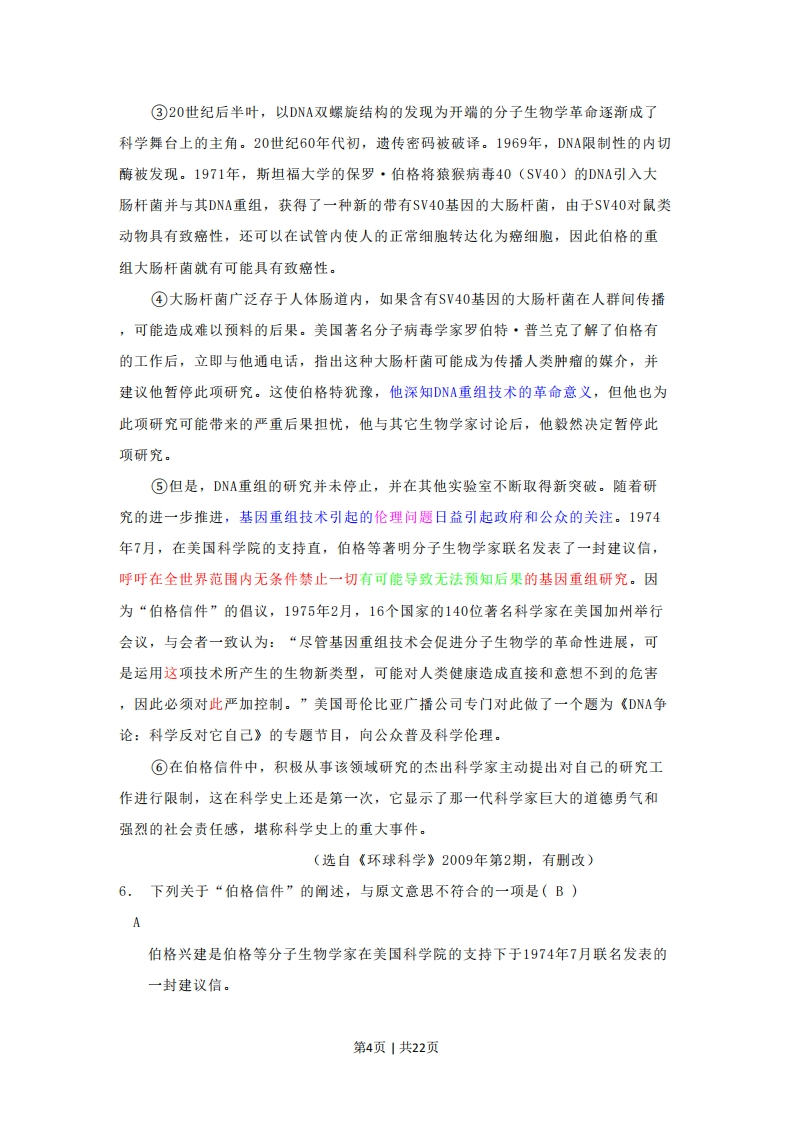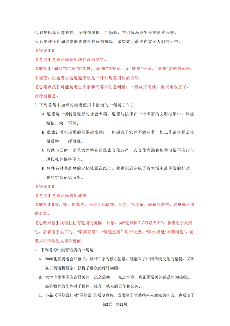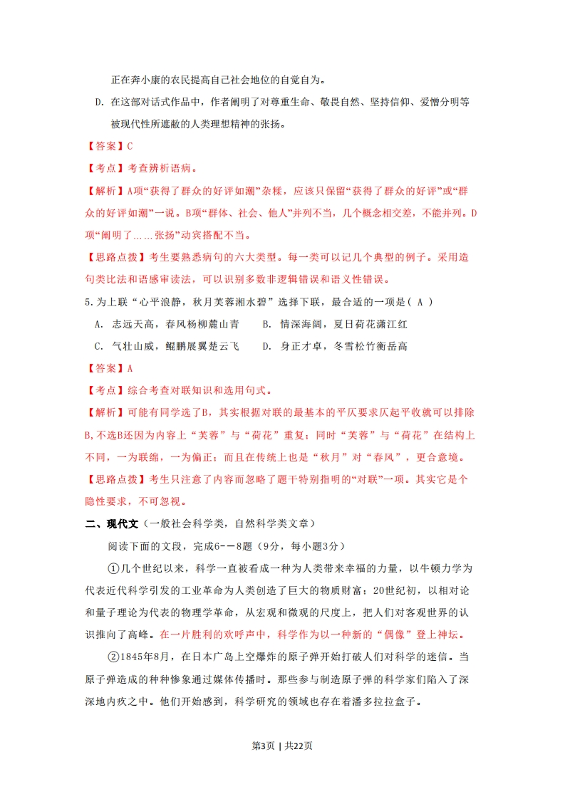 2009年普通高等学校招生全国统一考试(湖南卷)语文本试卷分第I卷(选择题)和第Ⅱ卷(非选择题)两部分。第I卷1至4页,第Ⅱ卷5至9页。考试结束后,将本试卷和答题卡一并交回。第缸卷注意事项1.答题前,考生在答题卡上务必用直径0.5毫米黑色签字笔将自己的姓名、准考证号填写清楚,并帖好条形码。请认真核准条形码的准考证号、姓名和科目。2每小题选出答案后,用2B铅笔把答题卡上对应题目的答案标号涂黑,如需改动,用橡皮擦干净后,再选涂其他答案标号。在试题卷上作答无效。3.本试卷共11小题,每小题3分,共33分。在每小题给出的四个选项中,只有一项符合要求。一、语言知识及运用(15分,每小题3分)1.下列词语中加点的字,读音全都正确的一组是A.倾慕qimg俊彦yan渲染xian嘉言懿行yiB.轩昂xuan萦绕ying酽茶yon怦然心动pimgC.黏膜nian囊括nang笃信dǚ桑榆暮景mdD.脊梁ji甄别zhcn晋谒ye披肝沥胆1i【答案】C【考点】考查正确现代汉语普通话的读音【解析】A项的“渲染”音“xuan"B.项“怦然心动”音“peng”,D项“脊梁”音“j”【思路点拨】方言区考生要防止习惯性误读,如D项的“脊”,要特别留意方言与普通话读音的差异,如A、B两项的“渲”、“怦”。平时多注意方言与普通话的区别,这三分是可以不必无奈地放弃的。2.下列句子中有错别字的一句是()A.黄帝陵前的这两颗古柏,至今依旧菊郁苍翠,令观瞻者心中生出无限遐思。B我们与亲人相伴的每一刻,最不应该吝惜的是那份能慰藉彼此心灵的关爱。第1页|共22页C.狗尾巴草活像狗尾,茎纤细坚挺,叶修长,它们散漫地生长在夏秋两季。D.只要孩子们如往常般走进学校读书嘻戏,希望就会萌生在灾区人们的心中。【答案】D【考点】考查正确使用现代汉语汉字。【解析】“嬉戏”有“玩”的意思,而“嘻”是叹词,无“嘻戏”一词。“嘻戏”是网络词语,不规范,出题者出这道题应该是一种对规范用词的引导。【思路点拨】可能是考生平素聊天等不注意纠错,一旦成了习惯,就很难改正了。要特别留意。3.下列各句中加点的成语使用不恰当的一句是(B)A.道德是一切制度运行的社会土壤,道德与法律在一个国家的文明框架中,唇齿相依,缺一不可。B.虽然计算机应用的范围越来越广,但拥有了它并不意味着一切工作都会那么轻而易举,一挥而就。C.传统节日时一宗重大而特殊的民族文化遗产,其文化内涵和相关习俗不应该与现代社会格格不入。D.将往昔林林总总的记忆吐露在纸上,我意识到完成了我生活中最重要的行动,我注定为记忆而生。【答案】B【考点】考查正确选用成语【解析】B项,挥:指挥笔。形容才思敏捷,写字、写文章、画画非常快。这里属于用错对象。【思路点拨】成语往往有适用的范围、对象,如“鬼斧神工/巧夺天工”,前者用于天然的,后者用于人工的:“举案齐眉”、“破镜重圆”用于夫妻:“萍水相逢/不期而遇”,前者只用于陌生人初次见面。4.下列各句中没有语病的一句是A.2008北京奥运会开幕式,以“和”字为核心创意,既融入了中国传统文化的精髓,又彰显了奥运新理念,获得了群众的好评如潮。B.大学毕业生不应该只关注一己之屈伸,一家之饥饱,真正需要关注的是作为接收过高等教育的个体对于群体、社会、他人的责任和义务。C.小品《不差钱》对“不差钱”的反复宣称,既表达了对某些宰人商家的抗议,也反映了第2页|共22页正在奔小康的农民提高自己社会地位的自觉自为。D.在这部对话式作品中,作者阐明了对尊重生命、敬畏自然、坚持信仰、爱憎分明等被现代性所遮敝的人类理想精神的张扬。【答案】C【考点】考查辨析语病。【解析】A项“获得了群众的好评如藏”杂糅,应该只保留“获得了群众的好评”或“群众的好评如潮”一说。B项“群体、社会、他人”并列不当,几个概念相交差,不能并列。D项“阐明了张扬”动宾搭配不当。【思路点拨】考生要熟悉病句的六大类型。每一类可以记几个典型的例子。采用造句类比法和语感审读法,可以识别多数非逻辑错误和语义性错误。5.为上联“心平浪静,秋月芙蓉湘水碧”选择下联,最合适的一项是(A)A.志远天高,春风杨柳麓山青B.情深海阔,夏日荷花潇江红C.气壮山威,鲲鹏展翼楚云飞D.身正才卓,冬雪松竹衡岳高【答案】A【考点】综合考查对联知识和选用句式。【解析】可能有同学选了B,其实根据对联的最基本的平仄要求仄起平收就可以排除B,不选B还因为内容上“芙蓉”与“荷花”重复:同时“芙蓉”与“荷花”在结构上不同,一为联绵,一为偏正:而且在传统上也是“秋月”对“春风”,更合意境。【思路点拨】考生只注意了内容而忽略了题干特别指明的“对联”一项。其实它是个隐性要求,不可忽视。二、现代文(一般社会科学类,自然科学类文章)阅读下面的文段,完成6-一8题(9分,每小题3分)①几个世纪以来,科学一直被看成一种为人类带来幸福的力量,以牛顿力学为代表近代科学引发的工业革命为人类创造了巨大的物质财富:20世纪初,以相对论和量子理论为代表的物理学革命,从宏观和微观的尺度上,把人们对客观世界的认识推向了高峰。在一片胜利的欢呼声中,科学作为以一种新的“偶像”登上神坛。②1845年8月,在日本广岛上空爆炸的原子弹开始打破人们对科学的迷信。当原子弹造成的种种惨象通过媒体传播时。那些参与制造原子弹的科学家们陷入