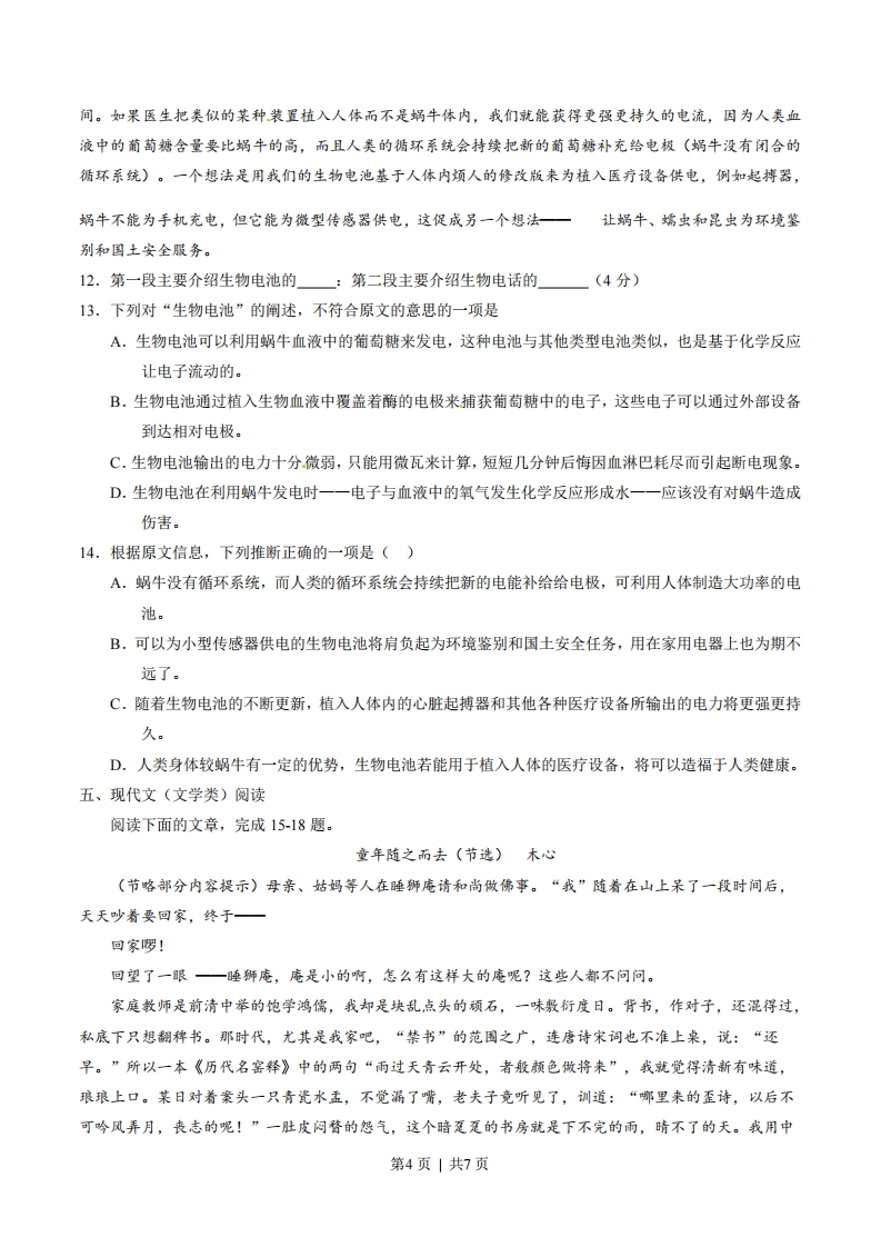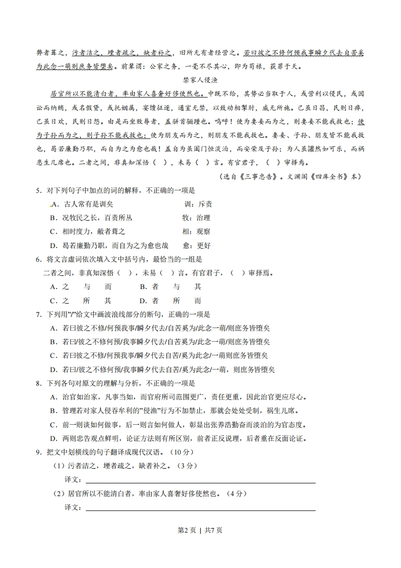 2015年高考湖南卷语文斌题一、语言文字运用(12分。每小题3分)梦想是一个民族保持生机、激发活力的源泉。没有梦想的民族是可悲的,对美好梦想没有」和关志不渝精神的民族同样没有前途。,坚韧不拔是中华民族固有的精神基因。回望历史,面对列强的坚船利炮,中华民族奋起抗争:面对新中国成立之初的,中国人民:面对现代化征程中的困难与挑战,中华儿女怀揣中国梦。一路高歌前行。梦想的太阳,已经在东方地平线上喷薄而出,灿烂的朝霞正在光耀在我们的眼前…1.下列成语依次填入语段中划横线处,最恰当的一组是A.坚贞不屈自强不息百废俱兴奋起直追B.坚定不移自强不总百废待兴奋发图强C.坚贞不屈生生不总百废待兴奋发图强D.坚定不移生生不息百废俱兴奋起直追2.下列选项对语段主要运用的修辞手法的判断,正确的一组是A.比喻。排比B.对偶比喻C.排比夸张D.夸张对偶说着,进入石洞来,只见佳木芜葱,奇花烟灼,一带清流,从花木深处曲折泻于石隙之下。皆隐于山坳树影之间。俯而视之,则清溪泻雪,石磴穿云,白石为栏,环抱为沿,石桥三港,兽面衔吐。桥上有亭。3.语段中加点的字,读音全都正确的一组是A.烟灼shuo曲折qi山蚴ao石磴chengB.熌灼shuo曲折q0山坳you石磴dengC.燜灼zhuo曲折qi山坳you石磴chengD.燜灼zhuo曲折q0山蚴ao石磴deng4.下列语句填入语段中划横线处,衔接最恰当的一项是A.再进数步,渐向北边,两边飞楼插空,平坦宽豁,雕甍绣槛B.渐向北边,再进数步,雕甍绣槛,两边飞楼插空,平坦宽豁C.再进数步,渐向北边,平坦宽豁,两边飞楼插空,雕甍绣槛D.渐向北边,雕甍绣槛,再进数步,平坦宽豁,两边飞楼插空二、文言文阅读(22分,选择题12分,每小题3分:翻译题10分)阅读下面的文言文,完成5-9题。《三事忠告》二则张养浩治官如治家治官如治家,古人尝有是训矣。盖一家之事,无缓急巨细,皆所当知:有所不知,则有所不治也。况牧民之长,百责所丛,若庠序,若传置,若仓庐,若图固,若沟洫,若桥障,凡所司者甚众也。相时度力,第1页|共7页弊者葺之,污者洁之,堙者疏之,缺者补之,旧所无有者经营之。若旦彼之不修何预我事避夕代去自苦奚为此念一萌则庶务皆堕矣。前辈谓:公家之务,一毫不尽其心,即为苟禄,获罪于天。禁家人侵渔居官所以不能清白者,率由家人喜奢好侈使然也。中既不给,其势必当取于人,或营利以侵民,或因讼而纳贿,或名假贷,或托烟属,宴馈征逐,通室无禁,以致动相掣肘,威无所施。己虽日昌,民则日瘁,己虽日欢,民则日怨。由是而坐败辱者,盖骈首骊踵也。鸣呼!使为妻妾而为之,则妻妾不能我救也:使为子孙而为之,则子孙不能我救也:使为朋友而为之,则朋友不能我救也。妻妾、子孙、朋友皆不能我救也,曷若廉勒乃职,而自为之为愈也哉!盖自为虽国门恒淡泊,而安荣及子孙:为人虽讙然如可乐,而祸患生几席也。二者之间,非真知深悟(),未易()言。有官君子,()审择焉。(选自《三事忠告》。文渊阁《四库全书》本)5.对下列句子中加点的词的解释,不正确的一项是A.古人常有是训矣训:斥责B.况牧民之长,百责所丛牧:治理C.相时度力,敝者茸之相:观察D.曷若廉勤乃职,而自为之为愈也哉愈:更好6.将文言虚词依次填入文中括号内,最恰当的一组是二者之间,非真知深悟(),未易()言。有官君子,()审择焉。A.之与而B.者与其C.之所其D.者所而7.下列用”给文中画波浪线部分的断句,正确的一项是A.若曰彼之不修/何预我事/瞬夕代去/自苦奚为此念一萌侧庶务皆堕矣B.若曰/彼之不修何预/我事瞬夕代去/自苦奚为此念一萌/则庶务皆堕矣C.若曰彼之不修/何预我事/瞬夕代去自苦/奚为此念/一萌则庶务皆堕矣D.若曰/彼之不修何预/我事瞬夕代去自苦/奚为此念/一萌,则庶务皆堕矣8.下列各句对原文的理解与分析,不正确的一项是A.治官如治家,凡事当如,而官府所司范围更广,责任更重,因此治官更应尽心。B.管理若对家人侵吞牟利的”侵渔”行为不加禁止,那就会处处受制,祸生儿席。C.前一则谈如何做事,后一则言如何做人,彰显出张养浩勤奋而淡泊的为官态度。D.两则忠告观点鲜明,论证方法则有所区别,前者正反说理,后者重在反面论证。9.把文中划横线的句子翻译成现代汉语。(10分)(1)污者洁之,堙者疏之,缺者补之。(3分)译文:(2)居官所以不能清白者,率由家人喜奢好侈使然也。(4分)译文:第2页|共7页(3)使为子孙而为之,则子孙不能我救也。(3分)译文:三、古代诗歌鉴赏和古诗文默写(13分)10.阅读下面的古诗,完成题目。(8分)君不见魏武草创争天禄,群雄睚眦相驰逐。昼携壮士破坚阵,夜接词人赋华屋。都邑缭绕西山阳,桑榆漫漫漳河曲。城郭为虚①人改代,但有西园明月在。邺傍高冢多贵臣,蛾眉受睩共灰尘。试上铜台歌舞处,唯有秋风愁杀人。(张说《鄴都引》,选自《全唐诗》)江天一色无纤尘,皎皎空中弧月轮。江畔何人初见月,江月何年初照人?人生代代无穷已,江月年年只相似。不知江月待何人,但见长江送流水。(选自普通高中语文选修教材《中国古代诗歌散文欣赏》)【注】虚:废墟。(1)第二段诗句节选自唐代诗人张若虚的《》。(2分)(2)请赏析两诗中划横线诗句所抒发的人生感悟的差异。(6分)答:11.古诗文默写。(5分,每空1分)(1)沅有芷兮澧有兰,思公子兮未敢言。,观流水兮潺湲。(屈原《湘夫人》)(2)或取诸怀抱,:或因寄所托,(王羲之《兰亭集序》)(3)千呼万唤始出来,犹抱琵琶半遮面。。(白居易《琵琶行(