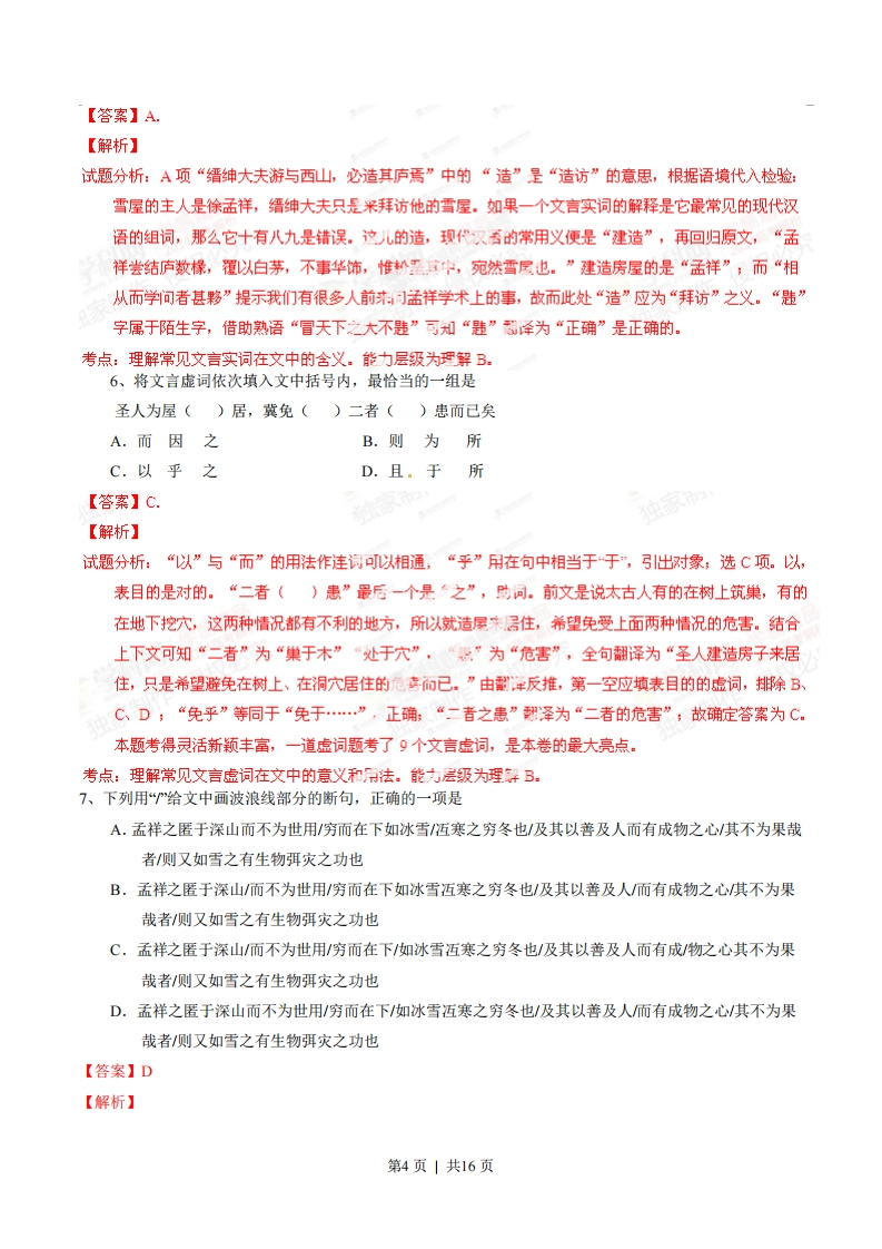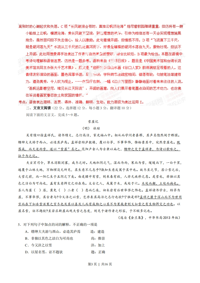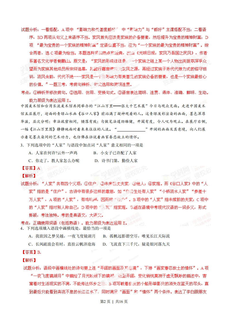 2014年普通高等学校招生全国统一考试(湖南卷)语文试题试卷总体评价:2014年湖南卷的选材在注重人文性的同时,增加了语文的实用性。语言文字运用的“家风”题材和论述文的教育题材以及选做题中对中的修身名言的理+和评析,不仅注重生命哲理的映照,更注重语言的实际运用。文学类阅读注重对传统文明和学科网传统神的继承:诗歌鉴赏考查传统女子结婚之后的事宜和祝福的方式;文学阅读侧加对传统文职“民以食为天”精神的继承。作文题直接对接央视“走基层”节目。三大题型都与考生的日常生活等密相天,考的是六语文,真语文,题型的大胆改革和创新必将迎来高考湘军的又一个语文丰收之年。本试题卷共七道大题,22小题,共8页。时量150分钟。满分150分。一、语言文字运用(12分。每小题3分)家风是一个家族世代相传沿袭下来的体现家族成员精神风貌、道德品质、审美格调和整体气质的家族文化风格。一个家族之链上某一个人物出类拔()、深()众望而为家族其他成员所宗仰追慕,其越行()言便成为家风之源,再经过家族子孙代代接力式的()守祖训,流风余的,锦延不绝,就形成了一个家族鲜明的家风。1.下列汉字依次填入语段中括号内,字音和字形全部正确的一组是A.萃孚f6u佳恪geB.粹负fi佳恪keC.粹负f0嘉恪geD.萃孚f0嘉恪ke【答案】D侵权【解析】试题分析:出类拔萃:形容卓越出众,不同一服。萃:原意为草丛生,引申为同类丛聚,据义定形,“萃”字从“草”不从“米”。深乎众望:使大家信服,符合大家的期望。乎:使人信服,读,褒义词。深负众望:指深深辜负了大家的期望。页:辜负,渎,贬义词。懿行嘉言:指有益的言论和高尚的行为。嘉,“美好”的意思,不能写作“佳”。¥科网“嘉言行”2009年胡南字音题曾考过。恪:读kè,形声字不能套读。本题属于一题考,既考字音、字形,又考成语运用。题目新颖,含金量高。考点:①识记现代汉语普通话常用字的子音。能力层级为识记A。②识记并正确书写现代常用规范汉字。能力层级为识记A。③正确使用词语(包括熟语)能力层级为表达运用E。2.将下列各句中没有语病的一句填入语段中画横线处,选项是A.家风是一个影响力和美誉度都好的家族必备的要素,也是一个家族最为宝贵的精神财富。B.家风即便是一个家族最为宝贵的精神财富,也是一个有影响力有美誉度的家族必备的要素。C.家风是一个有影响力有美誉度的家族必备的要素,也是一个家族最为宝贵的精神财富。D.家风是最为宝贵的一个家族的精神财富,也是一个有影响力有美誉度的家族必备的要素。【答案】C【解析】第1页|共16页试题分析:一看搭配,A项中“影响力和美善度都好”中“影啊力”与“都好”主谓搭配不当;二看语序,BD两项从句义上来语序不当.。家风首先应该是家族的必备要素,然后提升为宝贵的精神财富;D项“最为宝贵的一个家族的精神财国”定语位直不当,应为“一个家族的最为宝贵的精神财富”。综合两者,选C项最为恰当。本题选料紧热点和经典,出自《光明日报:家风乃吾国之民风》,作者系著名文化学者鲍鹏山。原文是:“家风的形成往往是,一个家族之链上某一个人物出类拔萃深乎众望而为家族其他成员所宗仰追幕,其懿行嘉言便成家风之源,再经过家族子孙代代接力式的恪守祖训,流风余韵,代代不绝…家风是一个有影啊力有美誉度的家族必备的要素,也是一个家族最核心的价值。”一题三考,考病句辨析、句式选用和简明连贯。考点:①辨析并修改病句。②选用、仿用、变换句式。③语言表达简明、连贯、得体、准确、鲜明、生动。能力层级为表达运用E。中国美术馆和台湾长流美术馆共同举办的“江山万里一张大千艺术展”今日与观众见面。走进中国美术馆五层展厅,迎面的青绿山水画《谷口人家》前站满了凝神观看的人。这青绿泼彩澄染的画面,墨色浑厚华滋,层次分明:章法疏密相间,错落有致:勾敛笔法道劲雄健,开国有度,令人叹为观止。在展厅右侧,一幅《江山万里图》静静地面对着来来往往的人流。“”开阔的画面及其意境,向人们展示着笔墨,点染间的艺术功力,也仿佛在诉说着画家春恋故土的情怀。3.下列选项中的“人家”与语段中加点词“人家”意义相同的一项是A.人家在何许?云外一声鸡B.小女子己许配了人家C.你走了,教人家怎么办呢D.诗书门第,勤俭人家【答案】A【解析】试题分析:“人家”共有四个义项:①住户,②未来的丈夫家:③他人:④家庭。而《谷口人家》中的“人家”指的是“住户”,古诗中有很多这样的意思,如“白云生处有人家”“小桥流水人家”“参差十万人家”,A项的“人家”,有鸡购,因而指“使户”,B项中的“人家”指未嫁前的夫家;C项中的“人家”指对别人称自己:D项中的“人灭”指家庭。本题在语境中考现代汉语的一词多义,形式新颖,考法独特。考的是真语文,大酒文。考点:正确使用词语〔包括熟语)。能力层级为表达运用E。4.下列选项填入语段中画横线处,最恰当的一项是A.我欲因之梦吴越,一夜飞度镜湖月B.孤帆远影碧空尽,唯见长江天际流C.长风破浪会有时,直挂云帆济沧海D.飞流直下三千尺,疑是银河落九天【答案】B.【解析】试题分析:语段中画横线处的诗句要上连“开阔的画面及其意境”,下接“画家眷恋故土的情怀”。A项“一夜飞度镜湖月”中描绘了月光央照下的镜,面开阔,变化惝